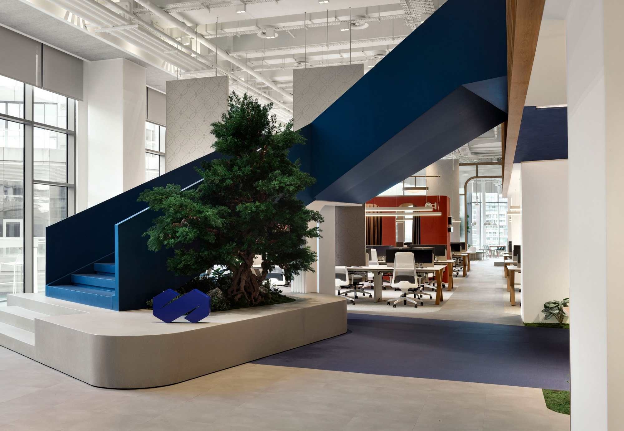 穿过入口大厅,一条象征伊斯坦布尔博斯普鲁斯海峡的蓝色走廊将空间划分为两个区域。这条走廊延伸至一处挑高空间,形成结合夹层的办公艺廊,随后衔接一座雕塑般的楼梯——其线条设计亦呼应海峡的流动韵律。