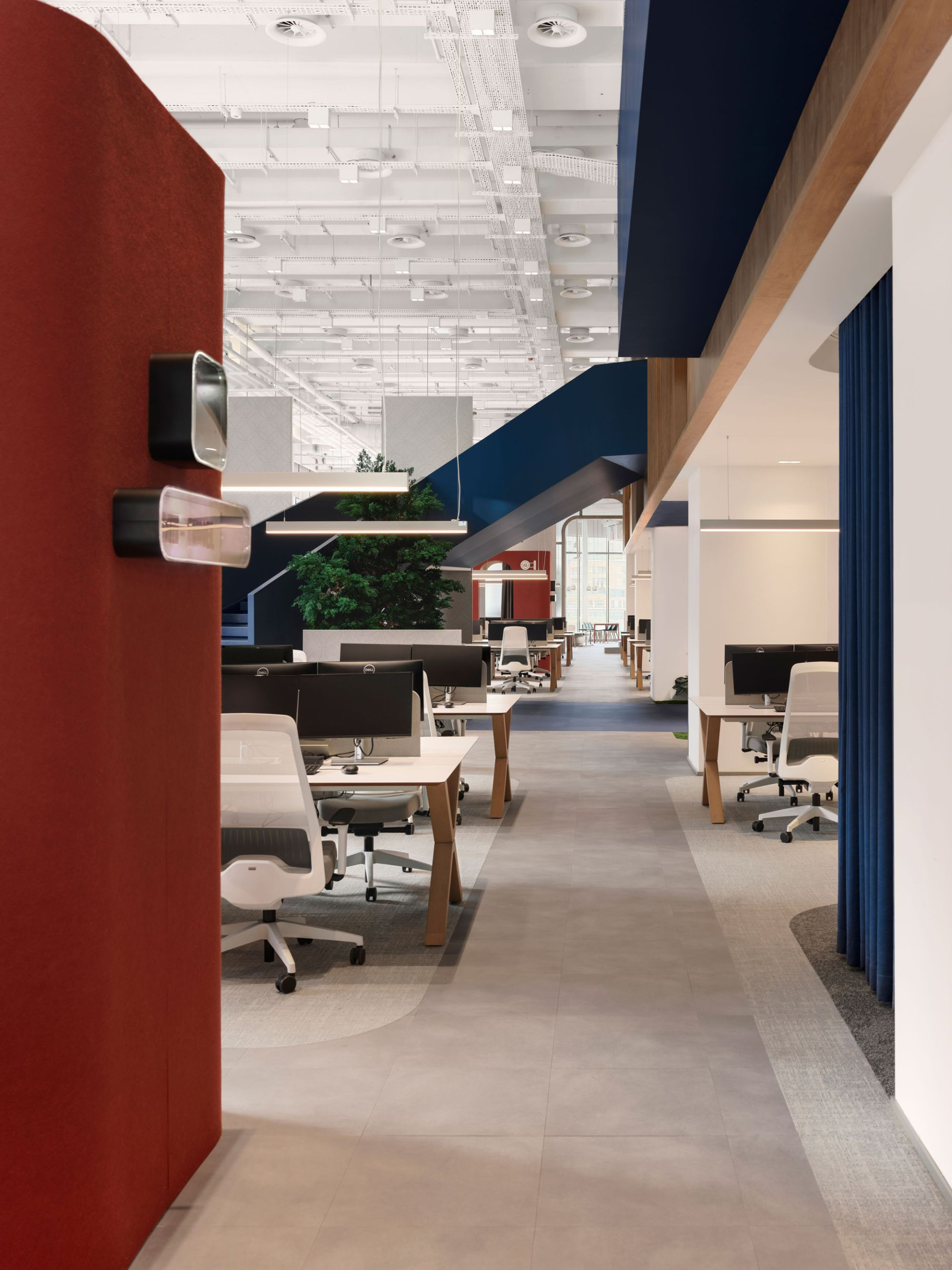 开放式会议区与灵活工位遍布整个办公空间,并配备不同等级的声学解决方案。置于工位之间的两节"电车"兼具专注办公桌和半开放小型会议区的功能。在满足客户核心需求后,所有剩余空间均被巧妙转化为灵活工位与小型洽谈区。
