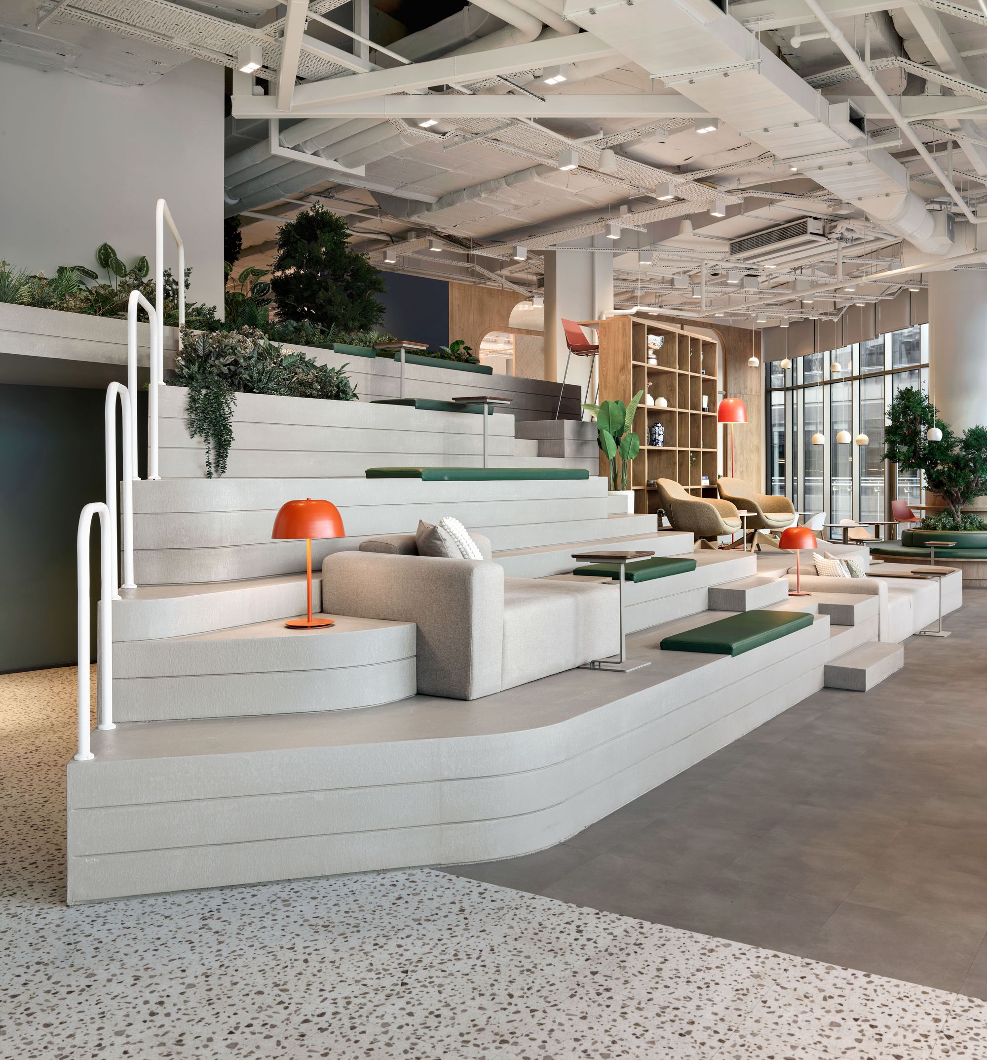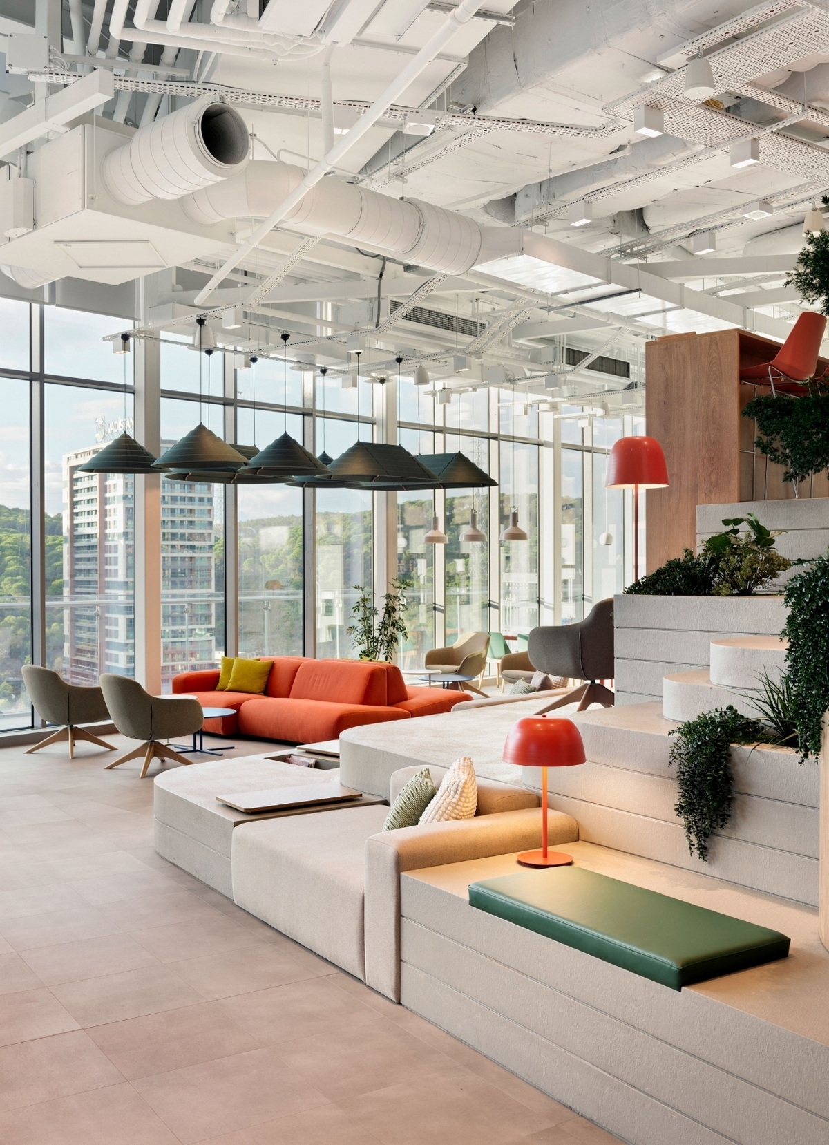 休息区承载着多重功能:它既是名副其实的休憩场所,也是灵活办公区、全体员工聚会的空间,更通过中间层如露台般的平台设计,形成连接夹层的过渡区域——人们可在此小聚、办公或享受高空视野。