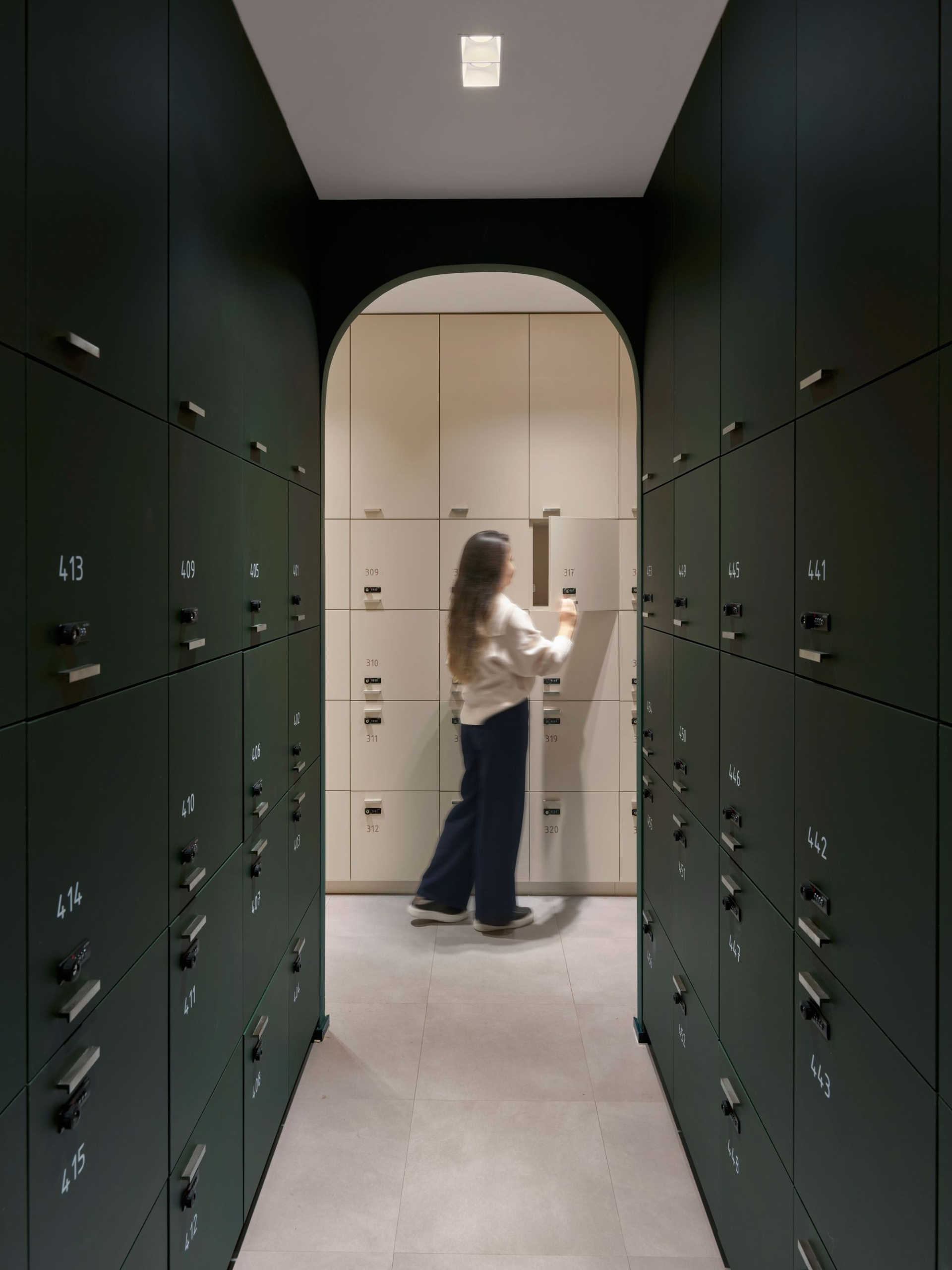 配备回收点的打印区均匀分布在各处。员工储物柜区域则集中设置在入口附近,其数量与员工总数相匹配。