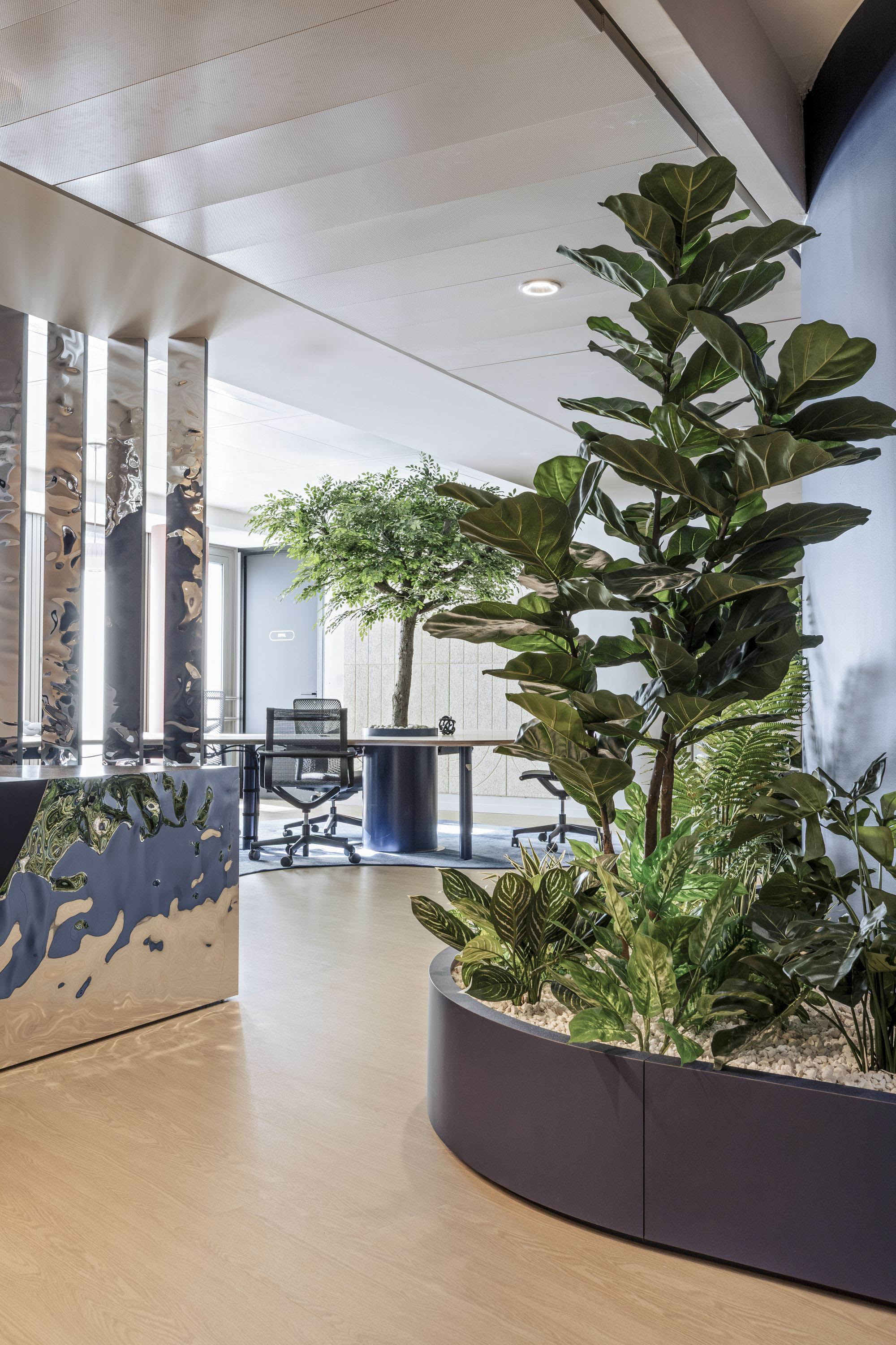 为呈现这些灵感,选用了各类环保材料:象征火焰的Alpi木皮、呼应自然的再生涂料与地材、暗喻海洋的镜面元素。这种象征手法延续至空间的视觉标识,火箭造型的装置既映射着集团的创新精神,也承载着对浩瀚星海的向往。