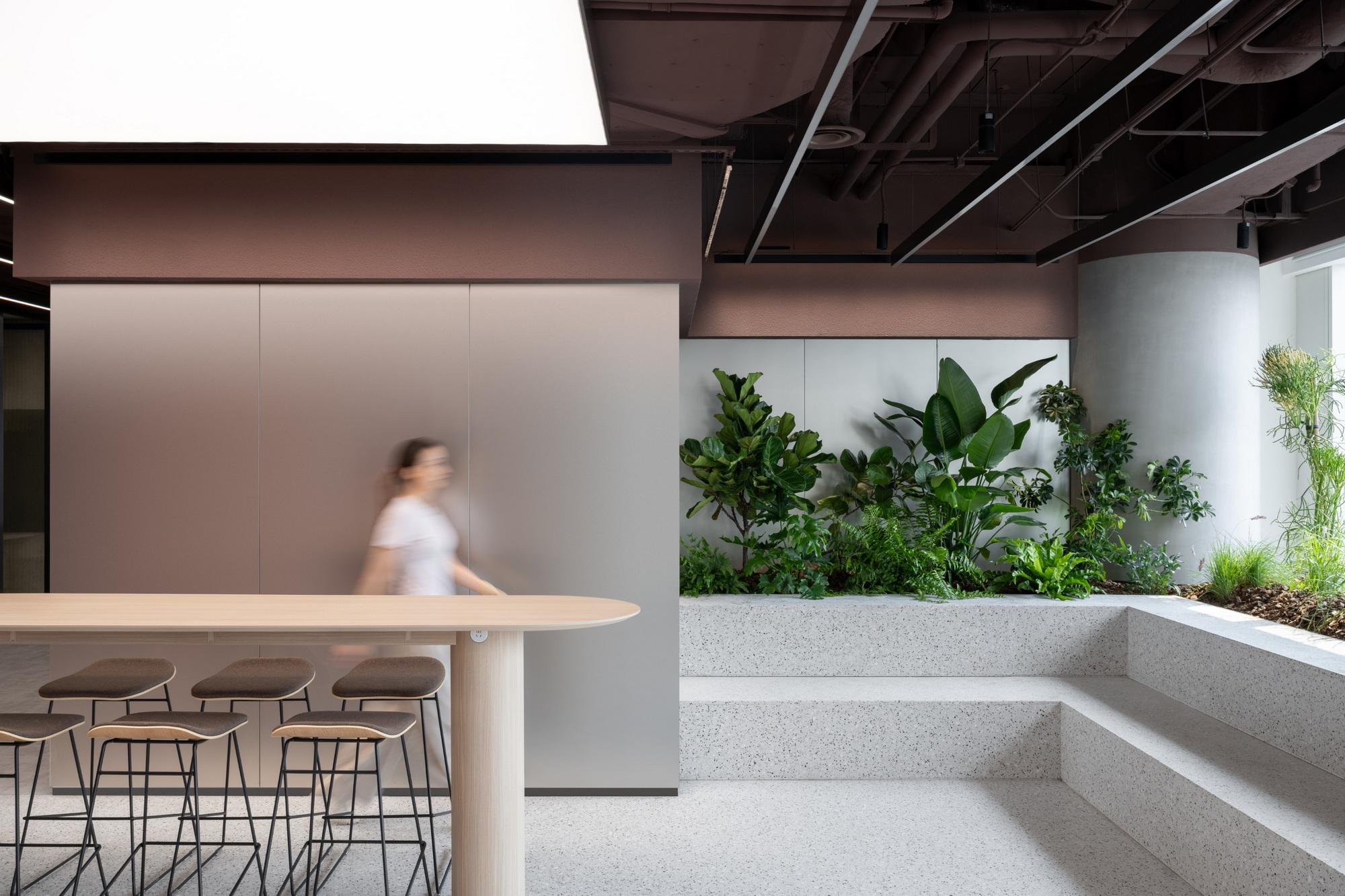除此之外,社团团队另设了一个可以容纳更多人的Grand Pantry。它的空间灵活,便于按需调整,焕发集体能量。这个Grand Pantry有可折叠的屏幕,可推移的隔断墙和动态的天花板系统,可根据需要自由延展。作为整个总部的社交核心,这个多功能空间完美适配各类活动场景。从休闲午餐到品牌活动,皆可从容应对。