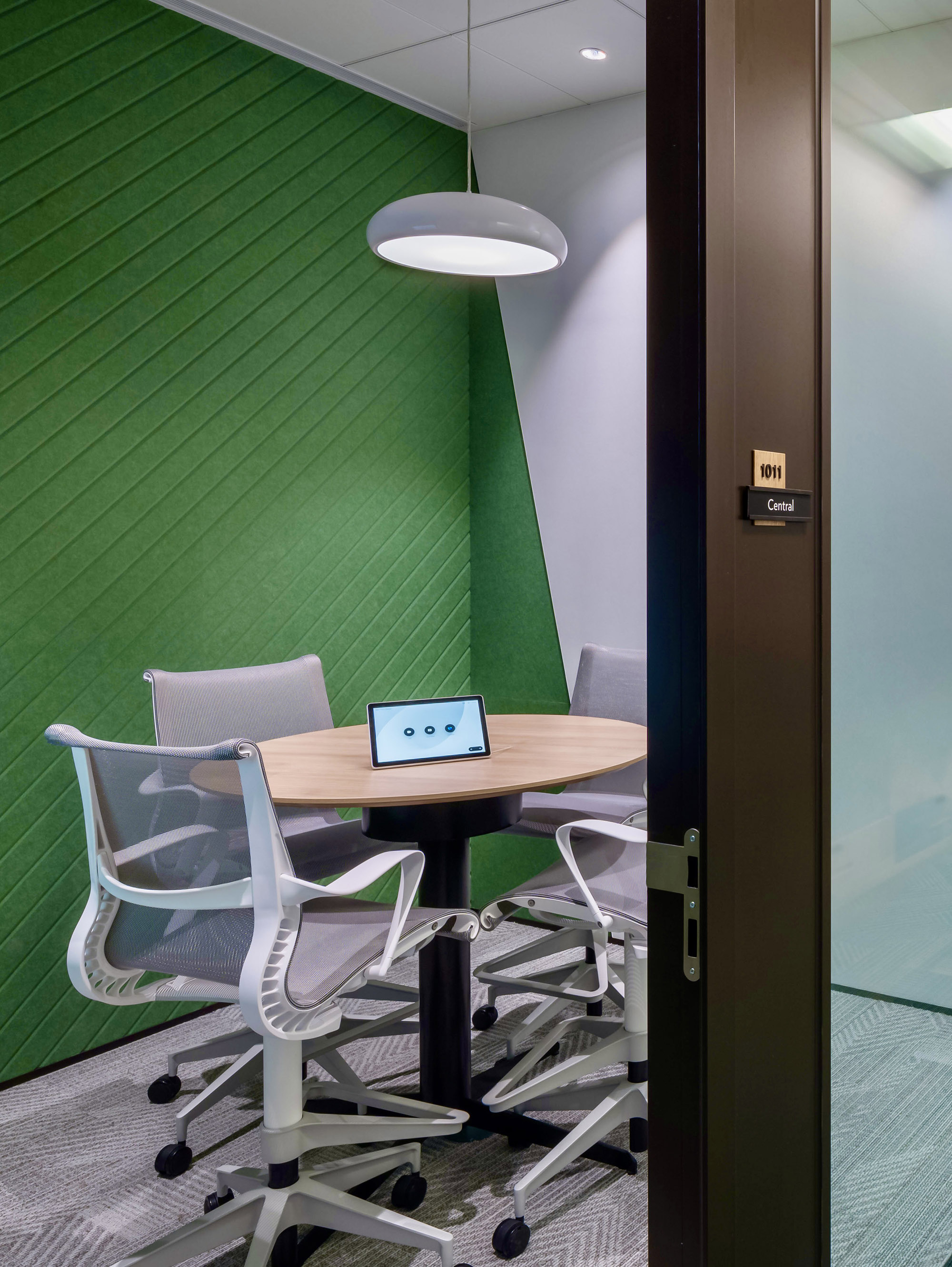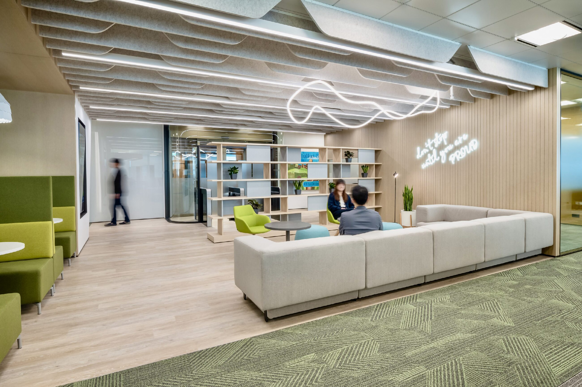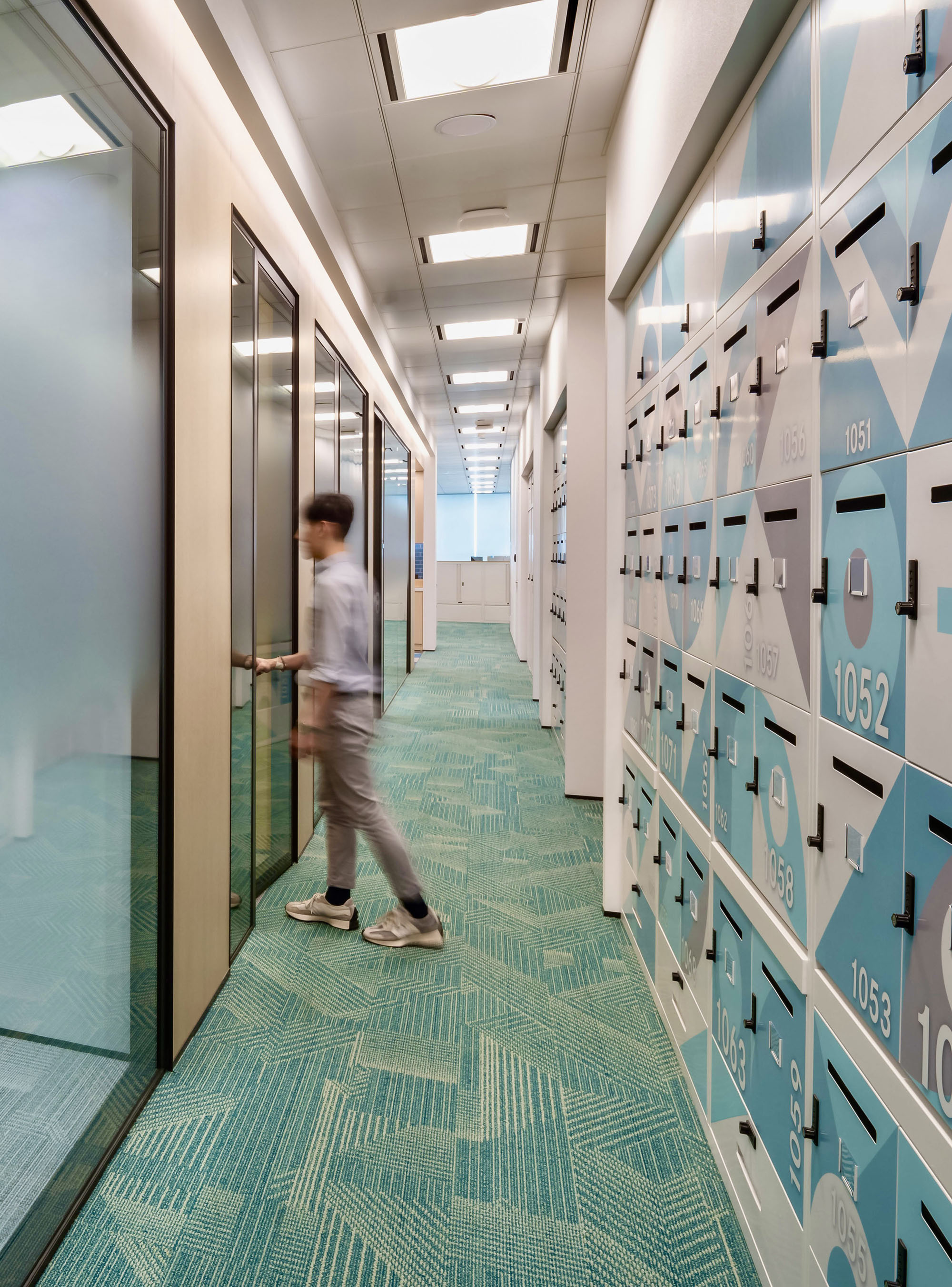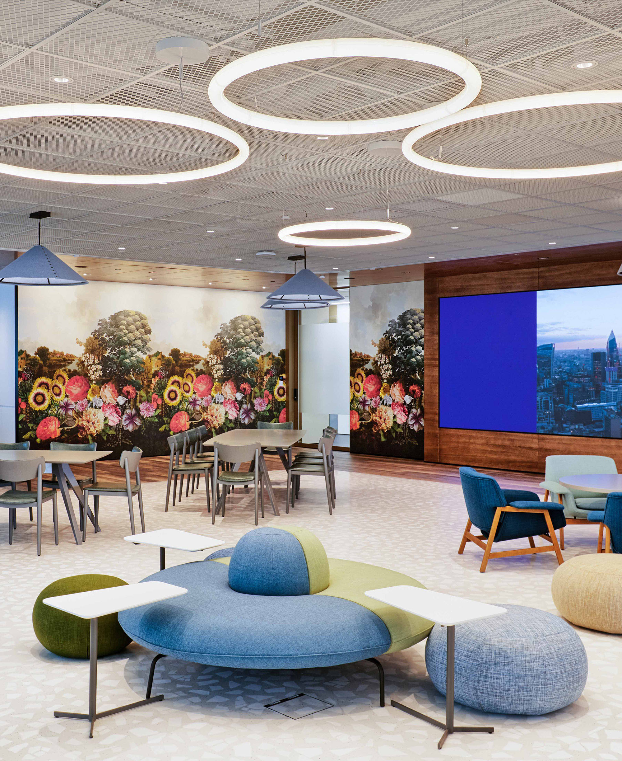 每个楼层均设有专属主题色,并配备一个拥有独特名称的协作区以及易于识别的“邻里”地标,以方便室内导航。充足的会议空间和配置各异的备用工作点,鼓励了灵活且基于活动的工作行为。通过将工位集群成角度布置,打破了空间隔阂,并在整个开放式楼层中拓展了视野。一个占地539平方米的工作休闲区作为整个团队日间的社交中心,夜晚,这里则变身为充满活力的休闲活动场地。