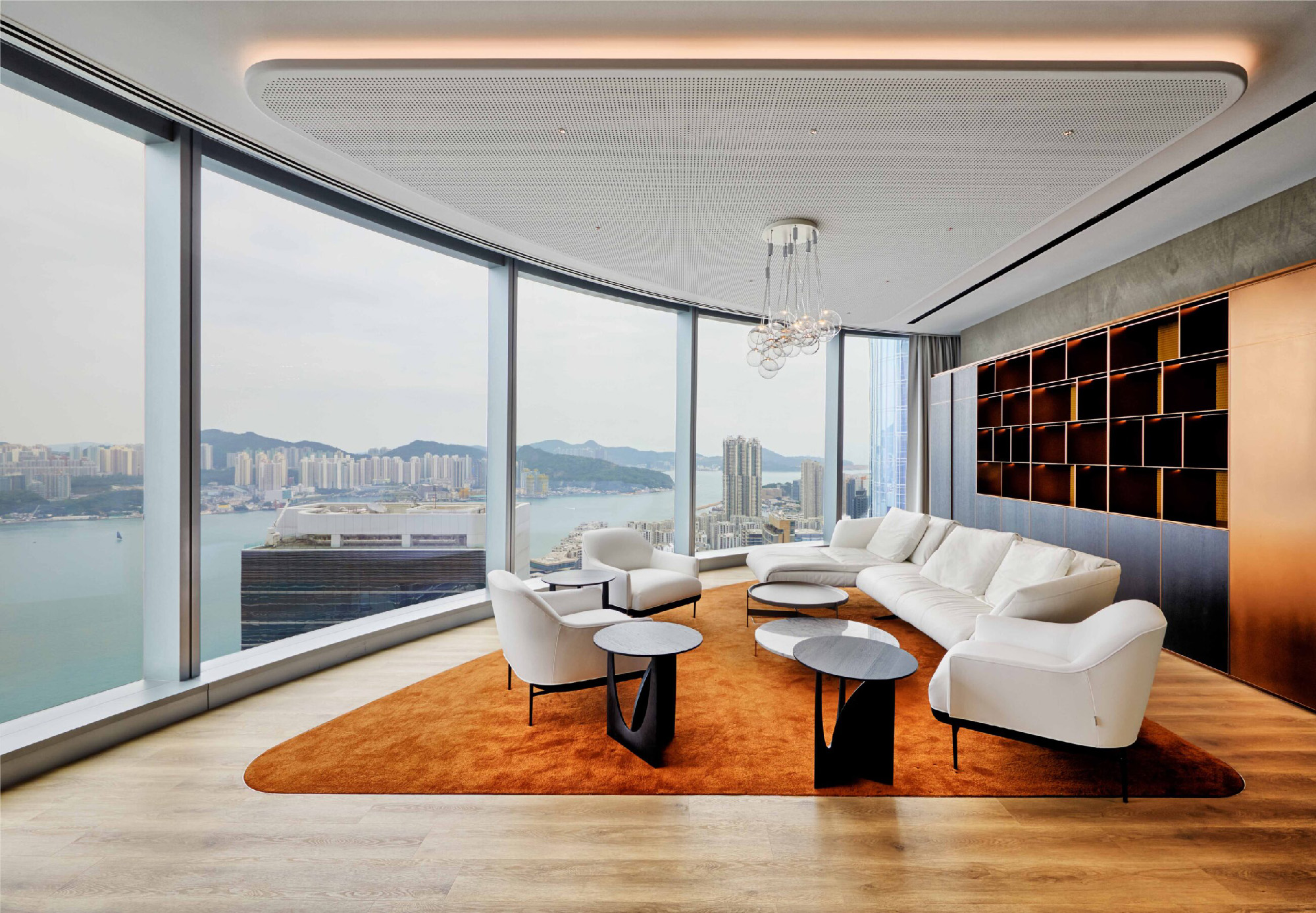 为营造非正式社交氛围,设计团队在接待区隐蔽门后打造了基于私人俱乐部概念的灵动空间。这个充满活力与趣味的区域既可化作日间协作客厅,亦能转为配备可编程灯光音响系统的晚宴场所。更令人惊喜的是,另一道暗门后竟隐藏着配备全套餐饮厨房的私宴厅与红酒廊,以及坐拥维多利亚港壮丽景致的208平方米的户外露台。