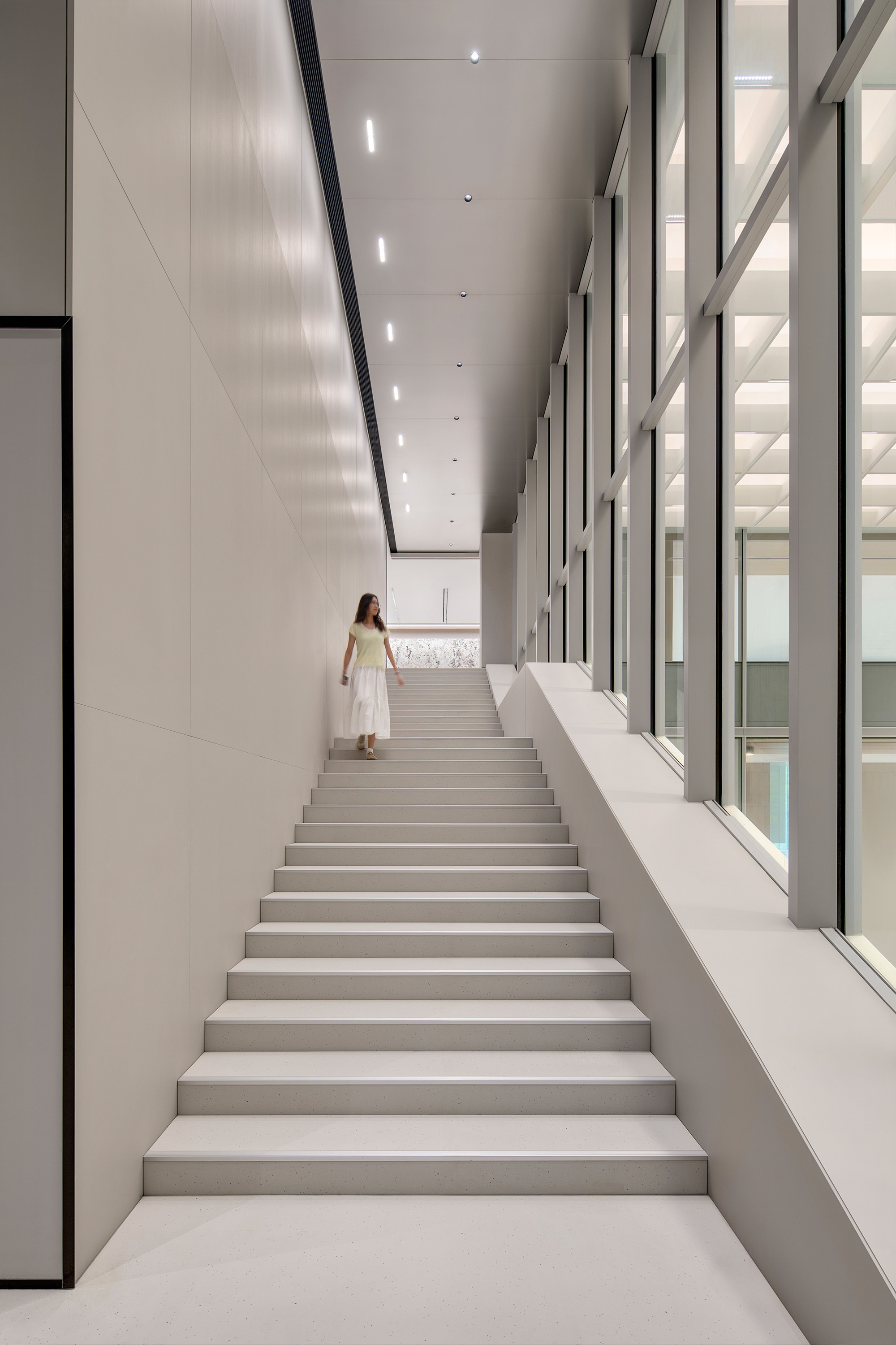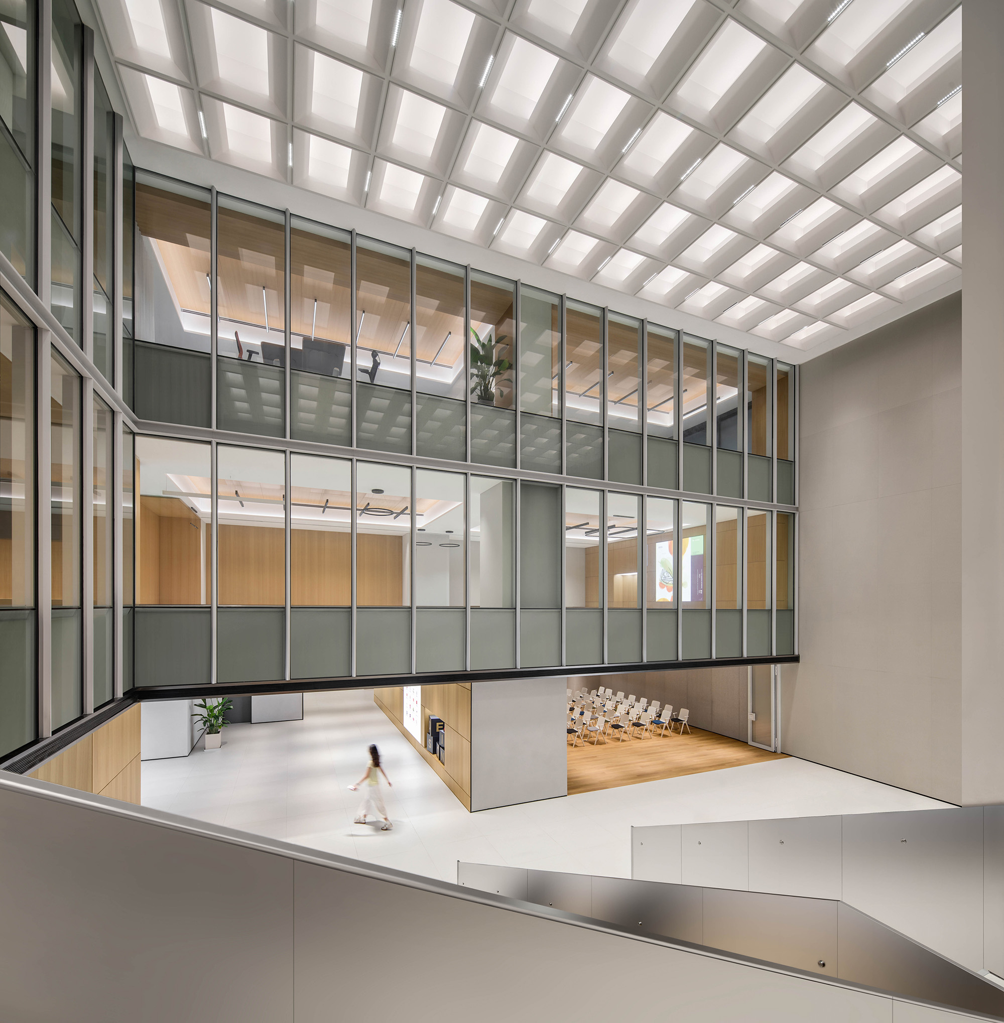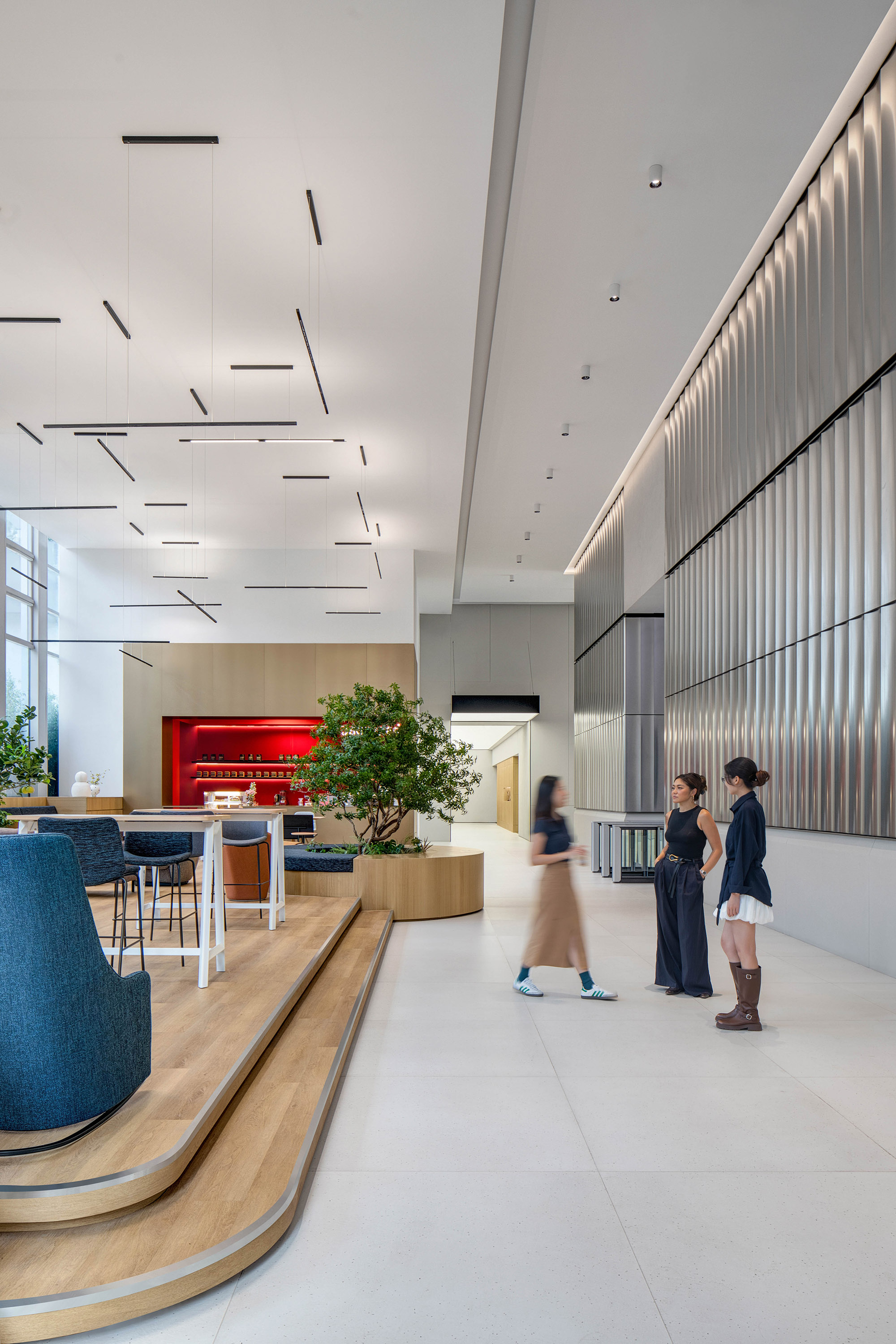金属质感的外立面元素延续至室内,确保材料与比例的一致性与精度。定制化天花系统将照明、空气分配与声学控制整合于一体,使空间更简洁、灵活、易维护。