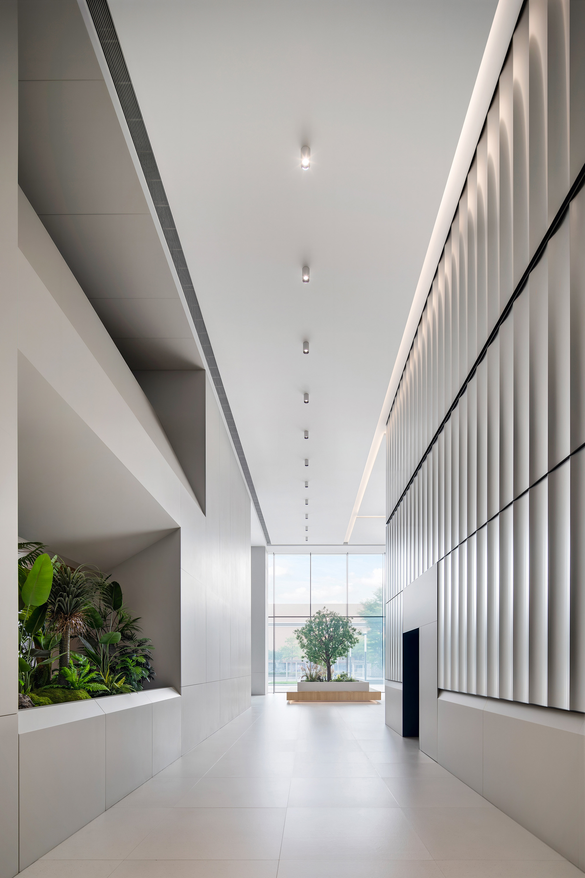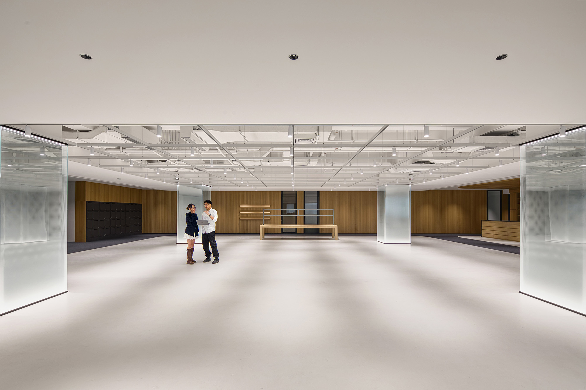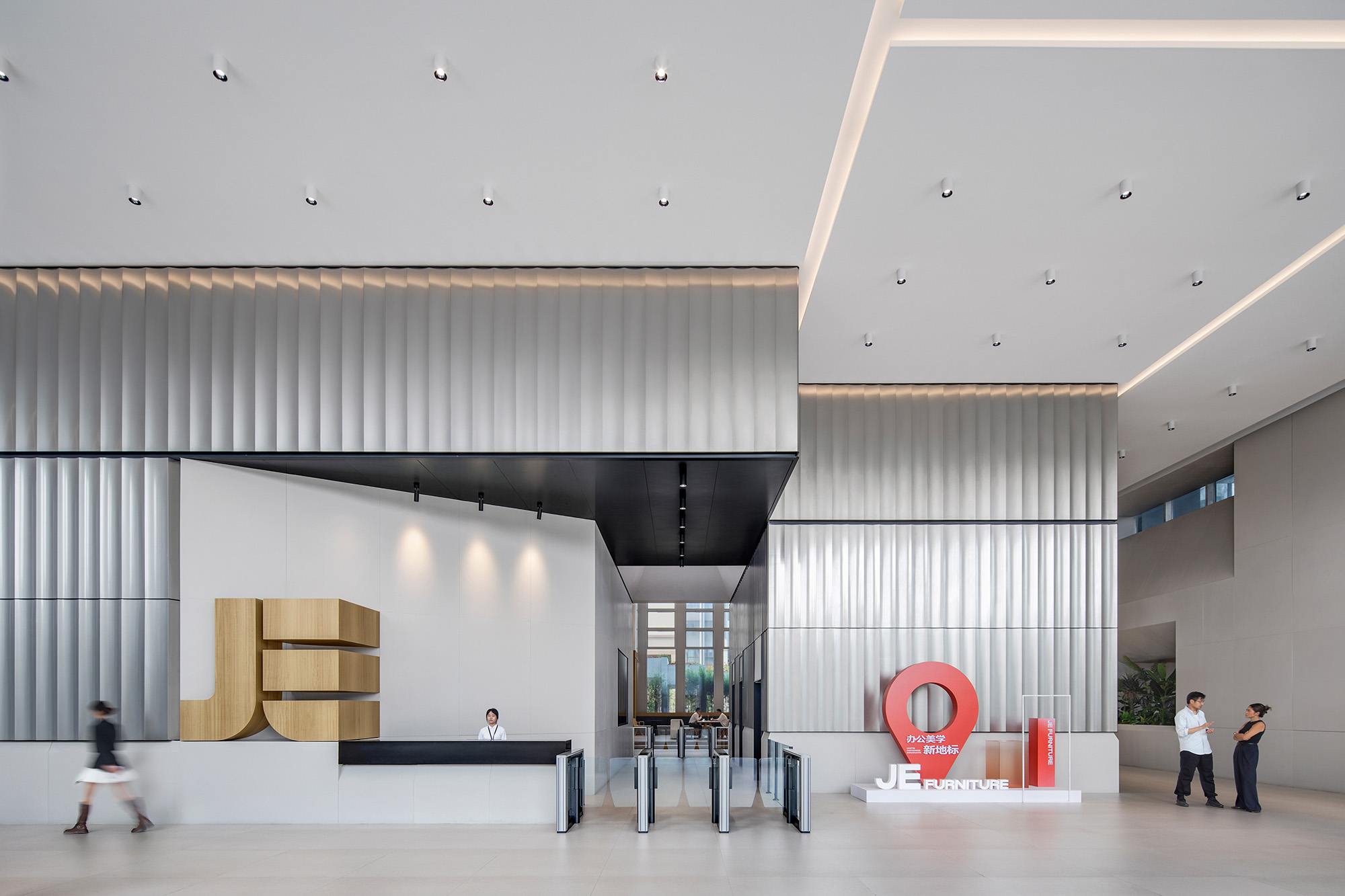 金属质感的外立面元素延续至室内,确保材料与比例的一致性与精度。定制化天花系统将照明、空气分配与声学控制整合于一体,使空间更简洁、灵活、易维护。