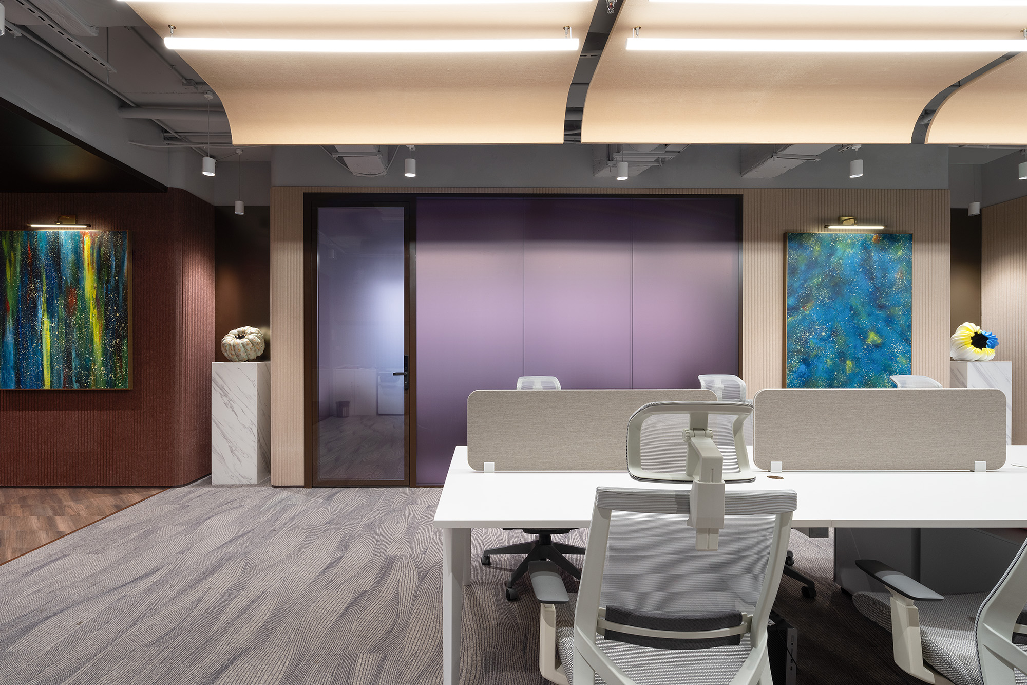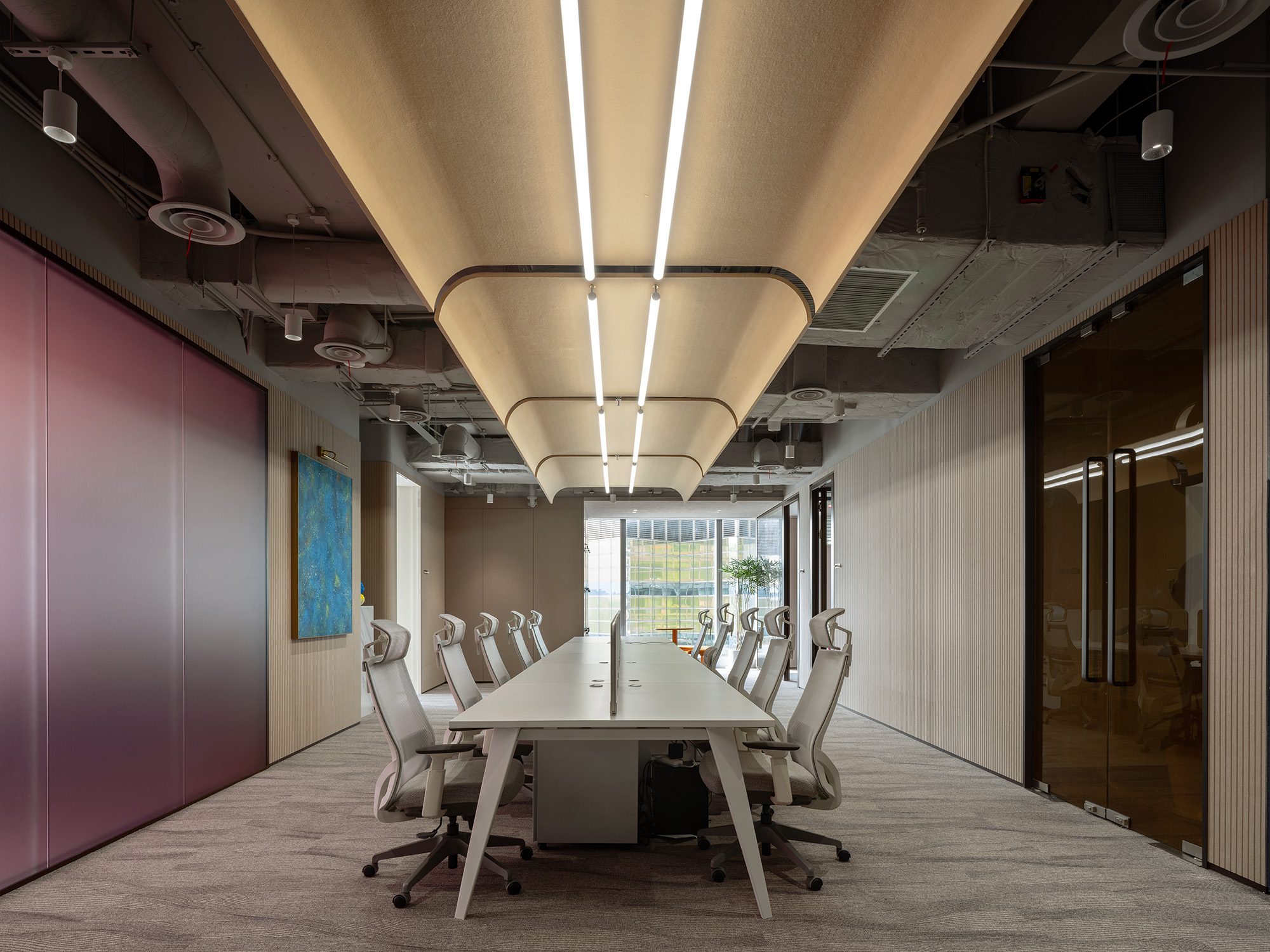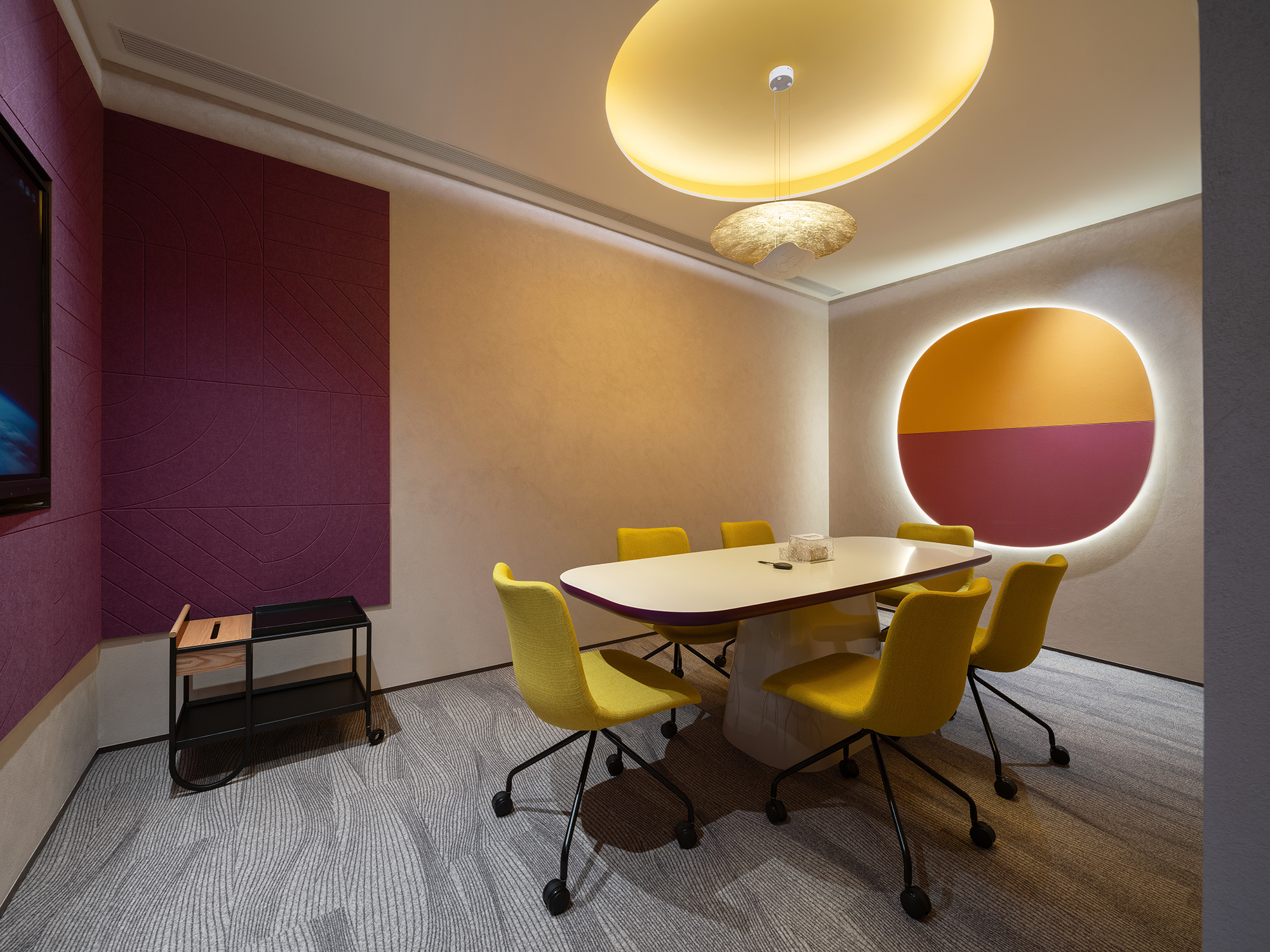 在精心设计的独立会议室重,紫色与暖黄相撞,在视觉上激发着每一位员工的活力与创意;这不仅仅是色彩的碰撞,更是与空间的深度共鸣。