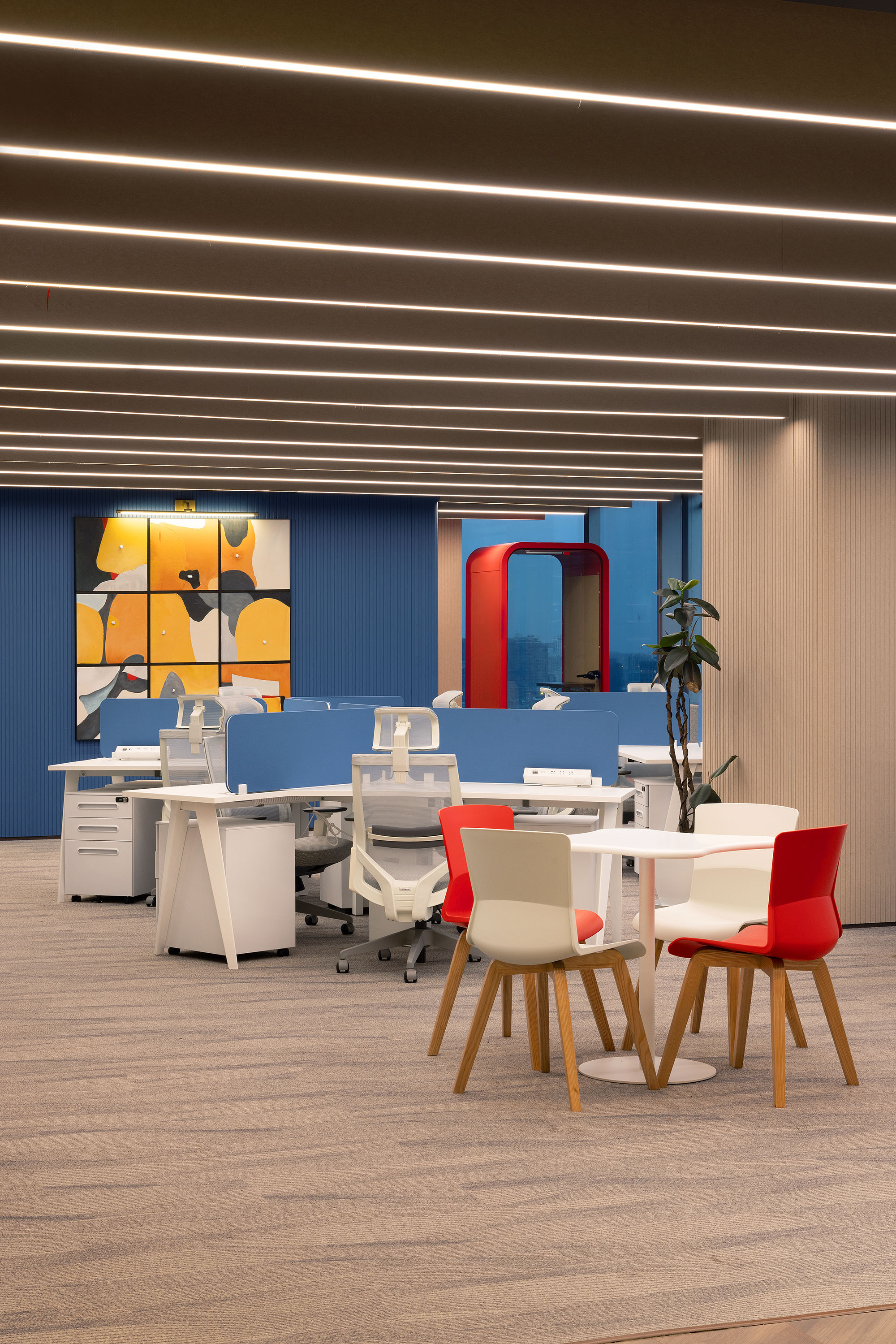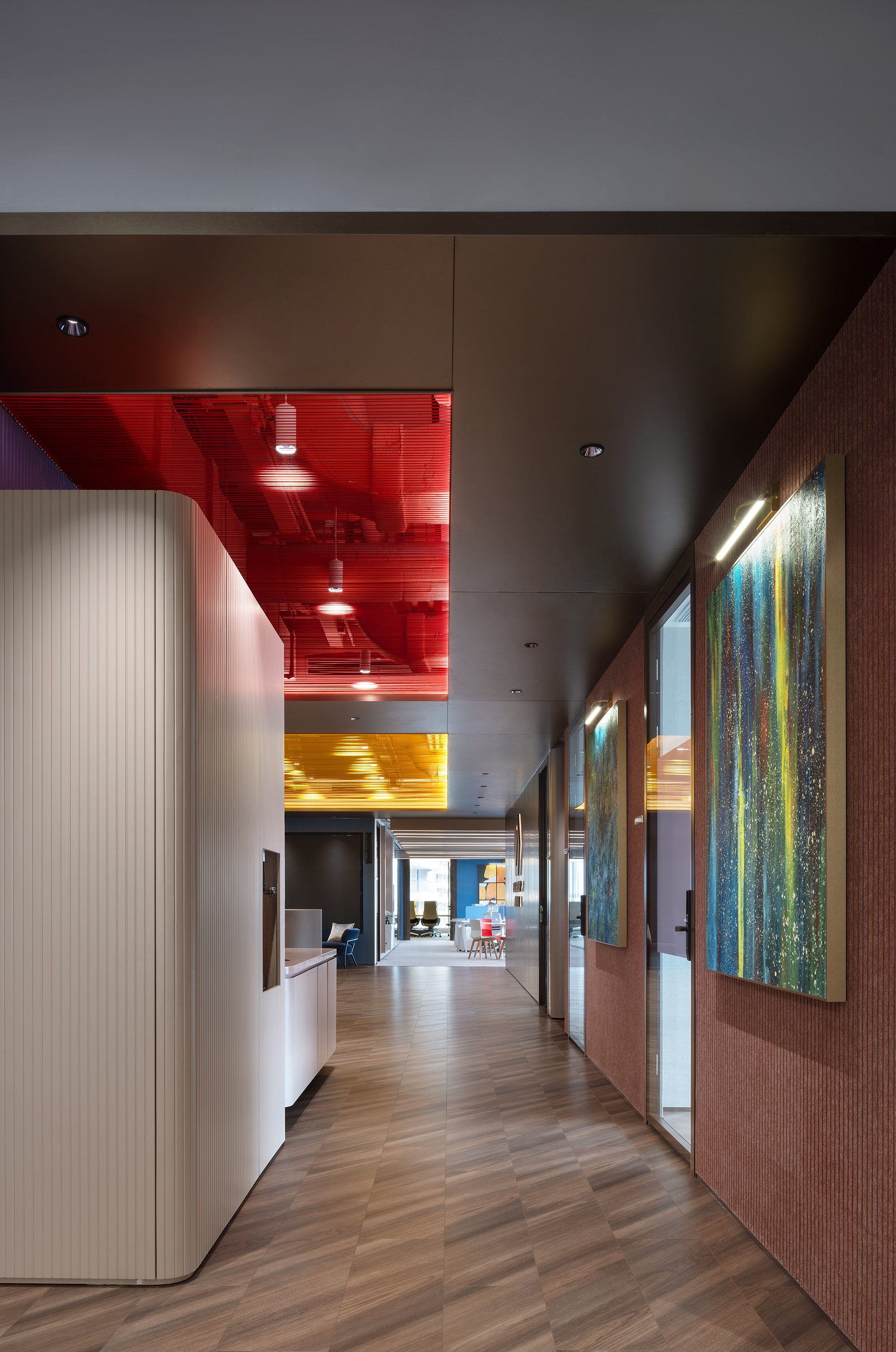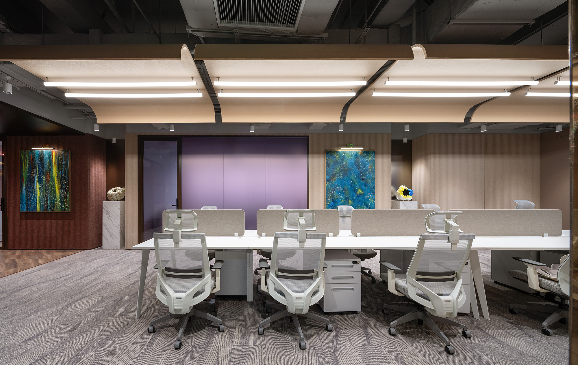 在精心设计的独立会议室重,紫色与暖黄相撞,在视觉上激发着每一位员工的活力与创意;这不仅仅是色彩的碰撞,更是与空间的深度共鸣。