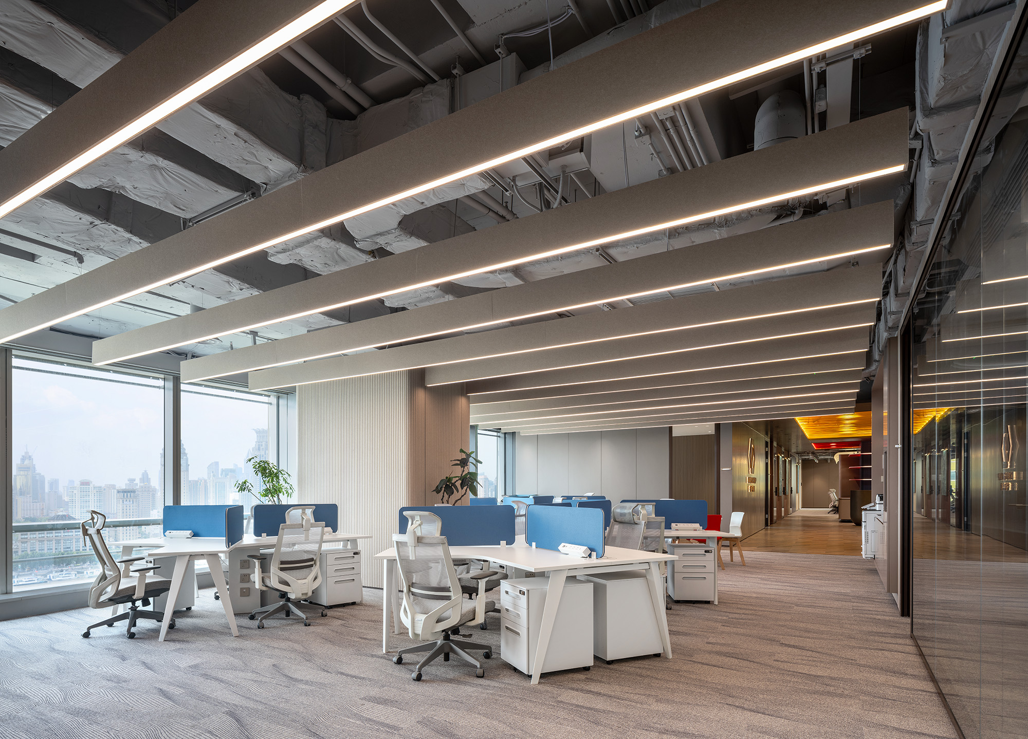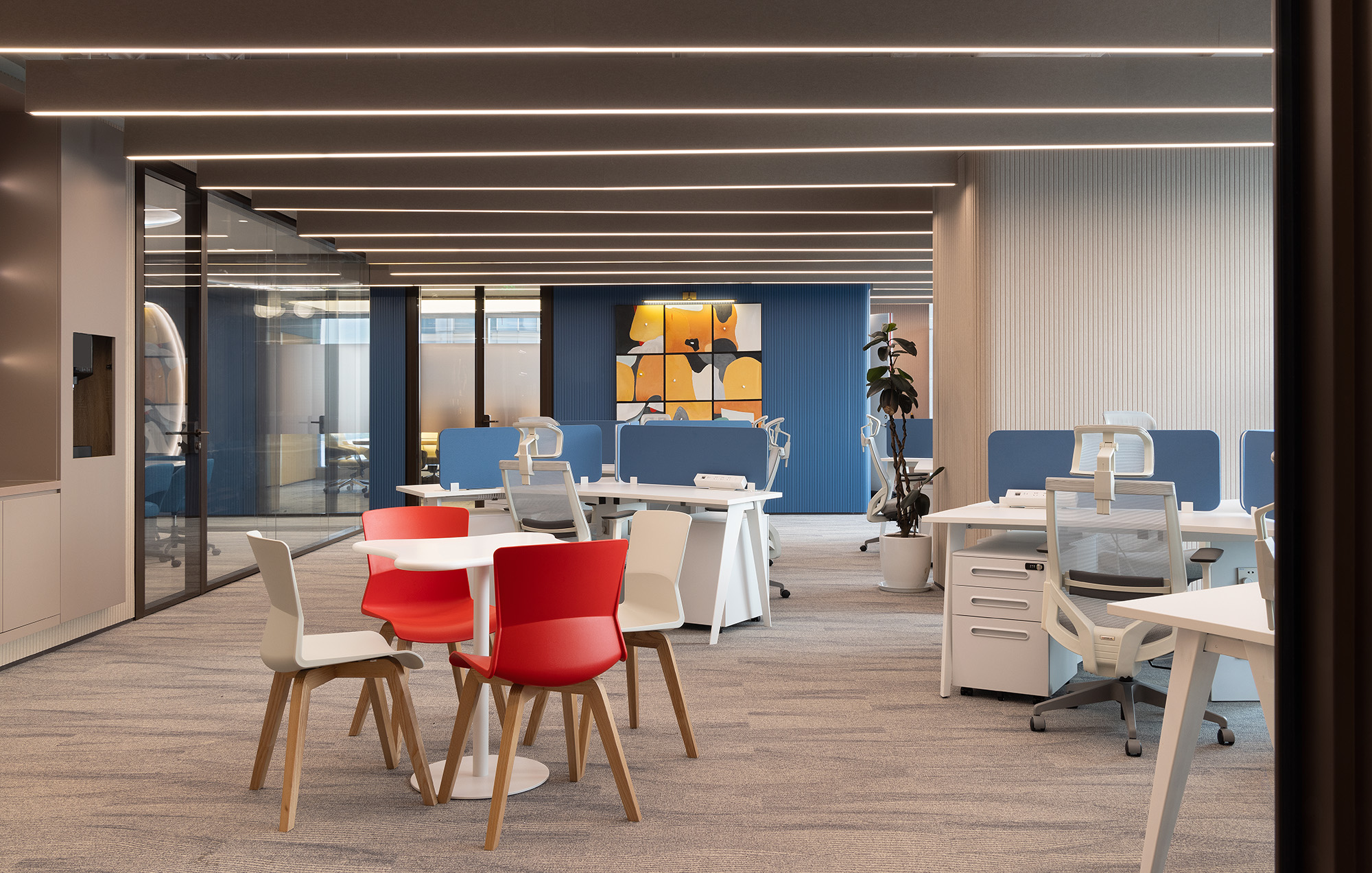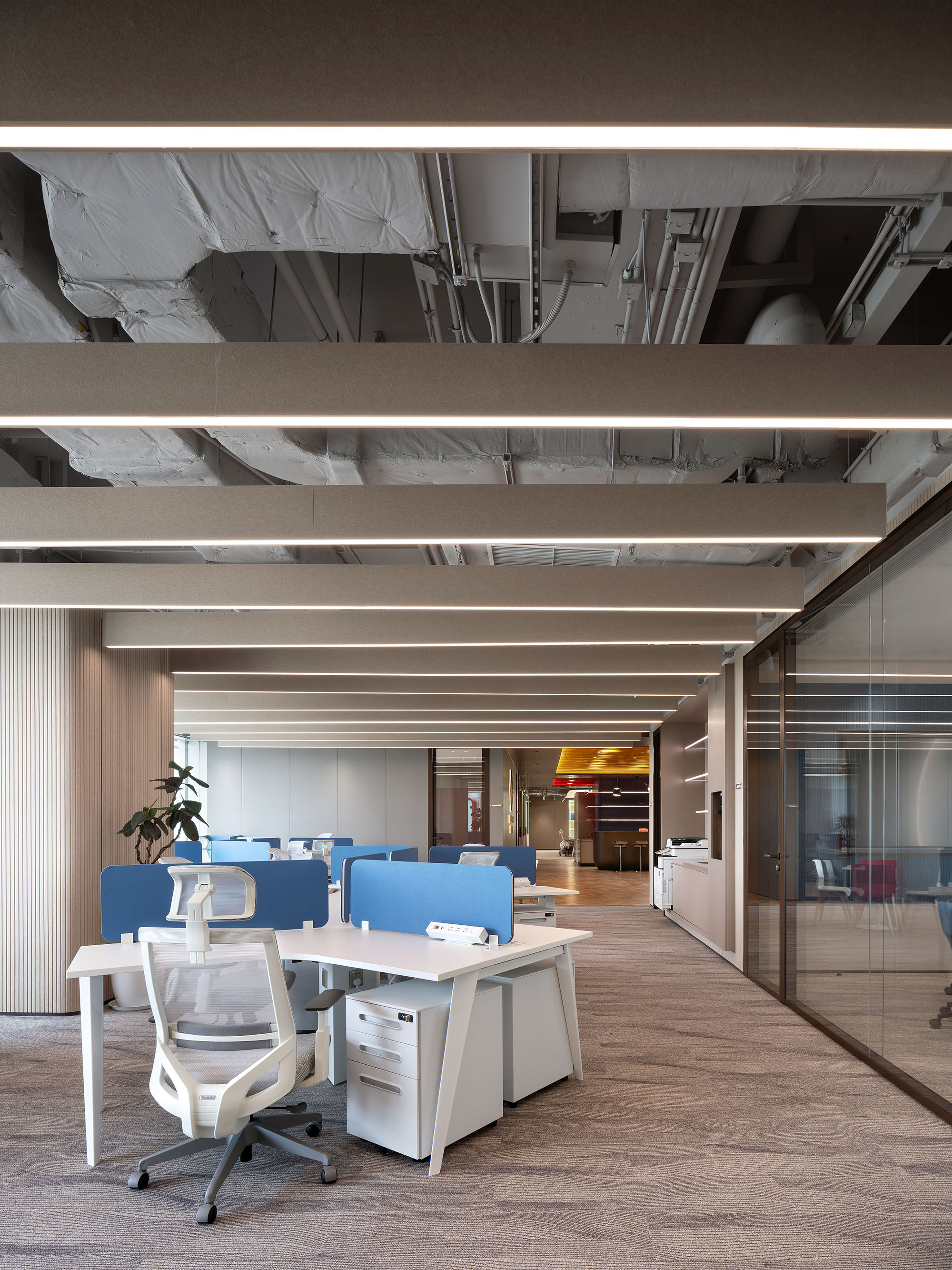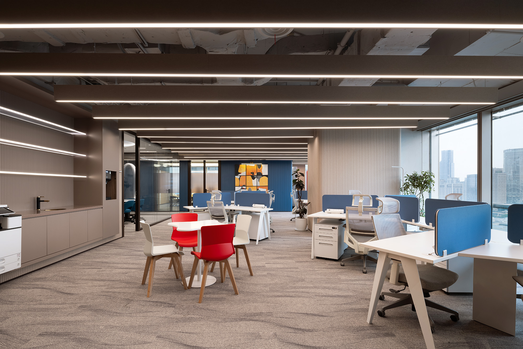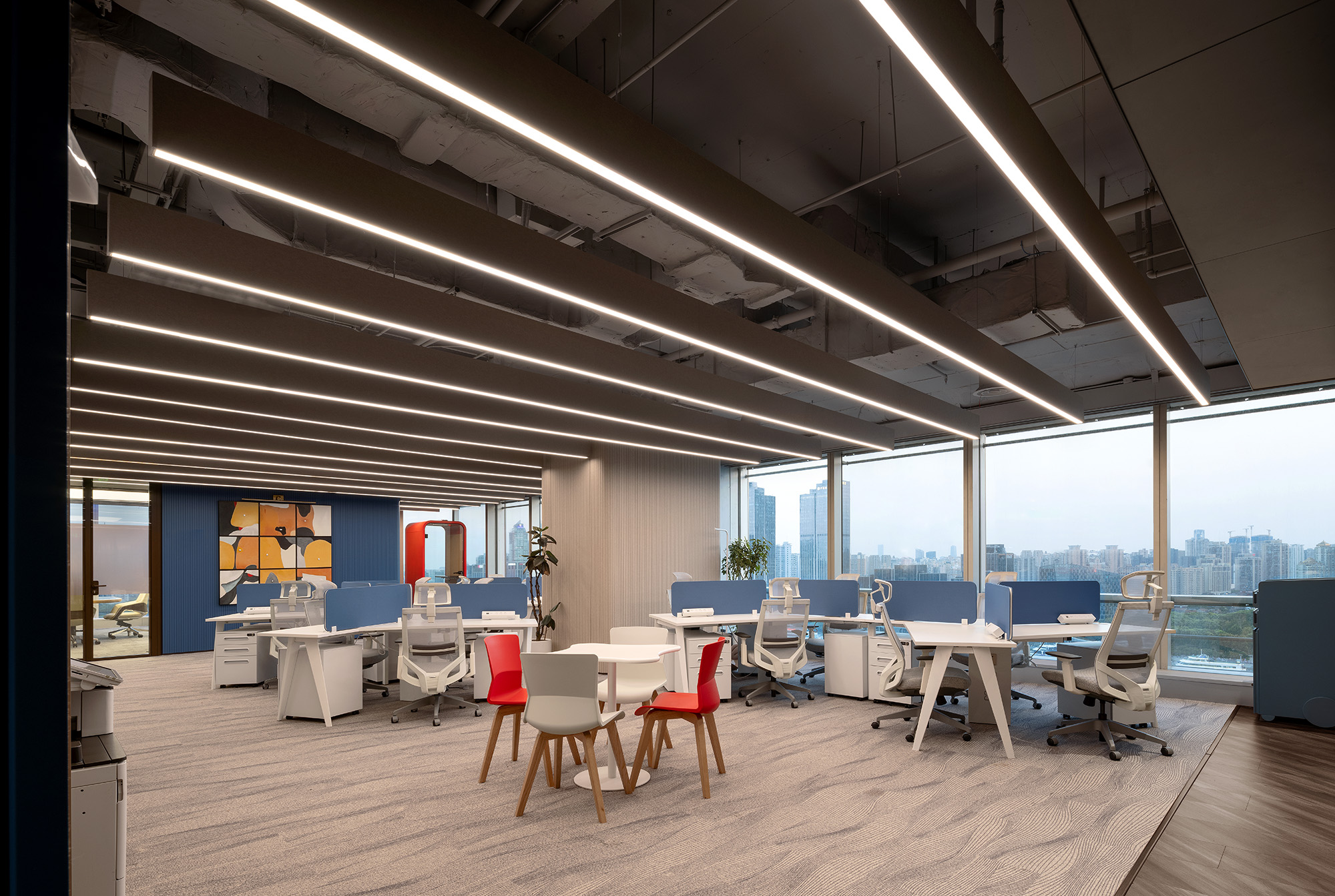 开放式布局提升了公共办公区域的流动性,大面积的玻璃材质,在呈现空间的通透感的同时,也拉近大家协作间的心理距离,良好的户外视野与适宜的自然光照也照顾员工的身心健康。