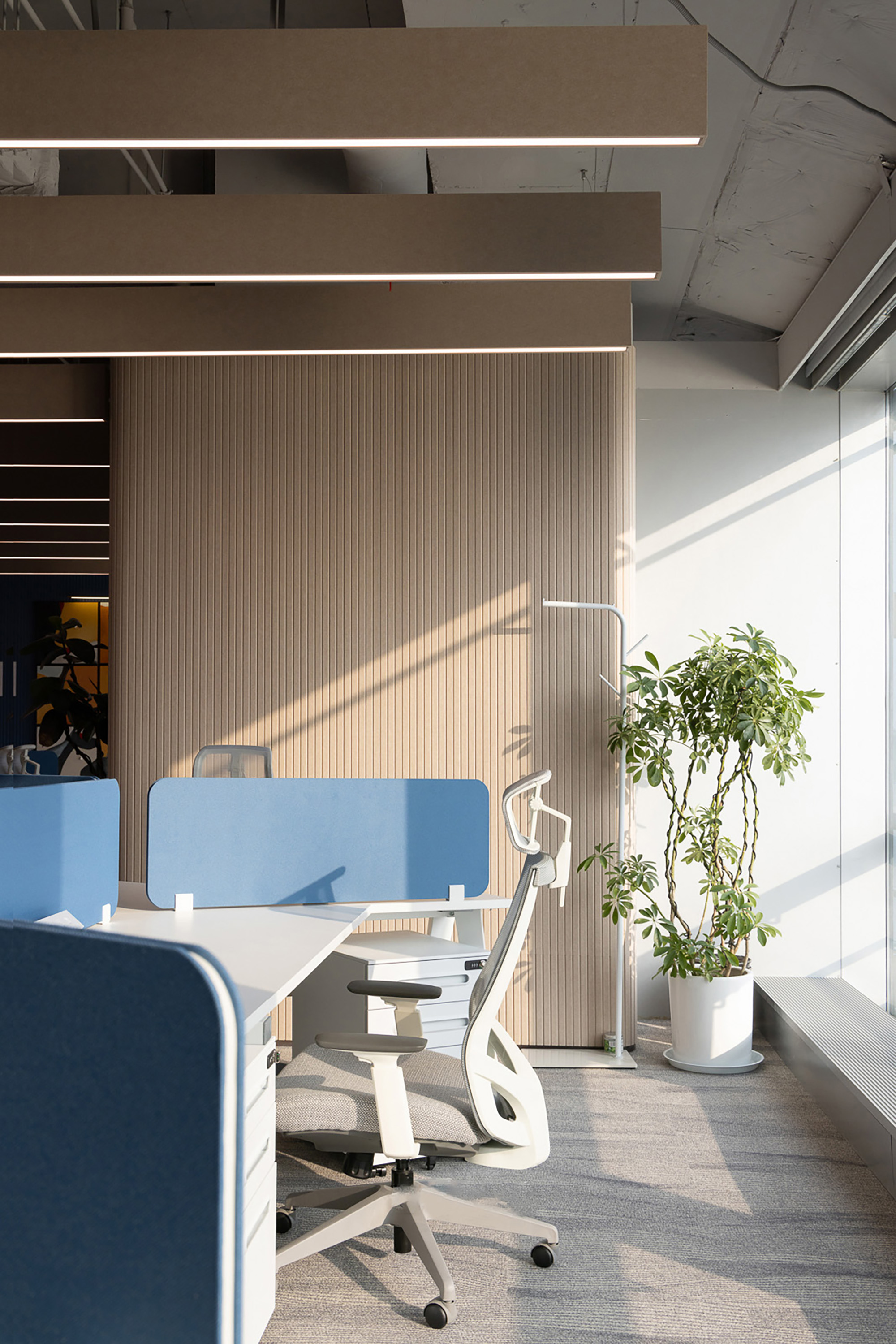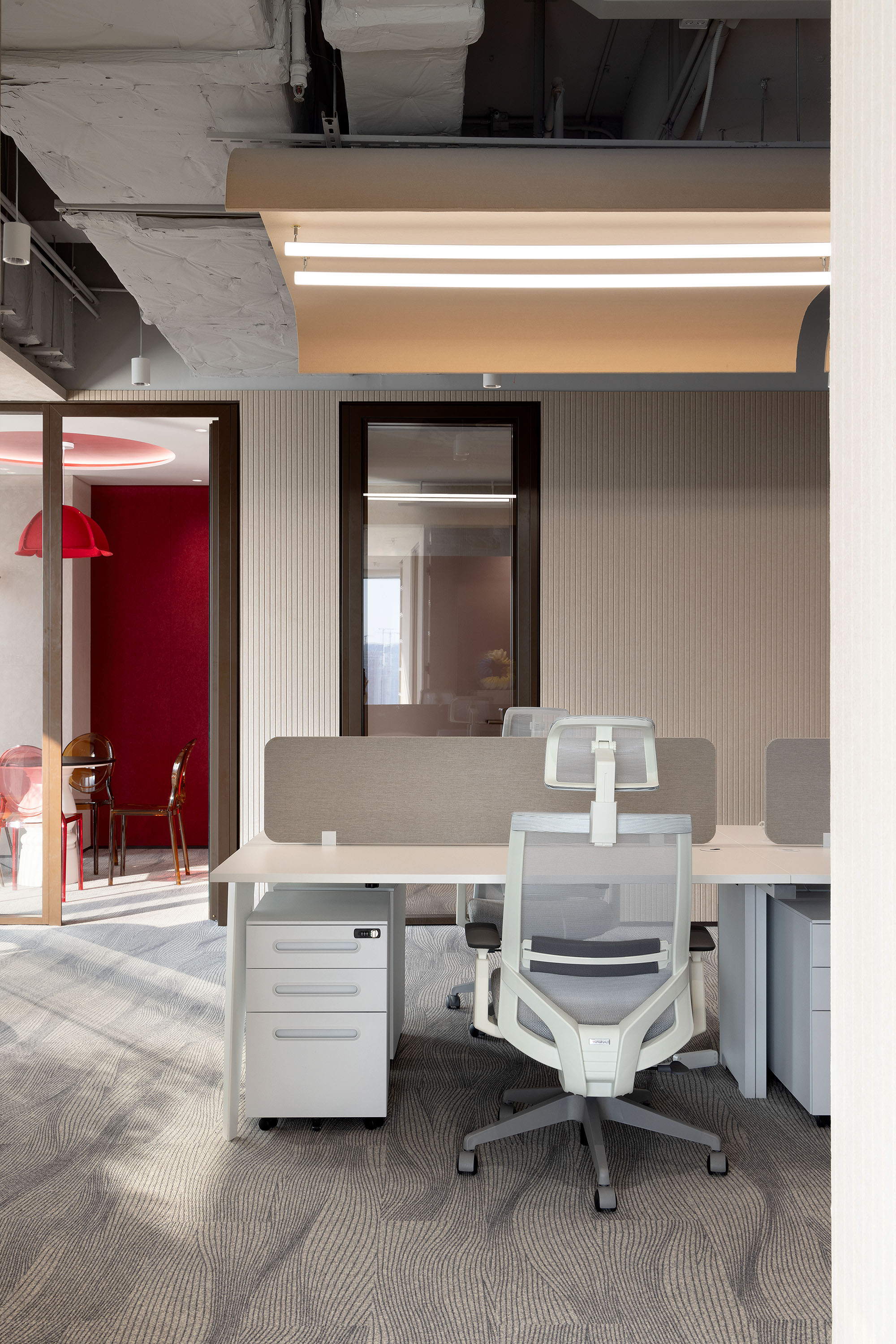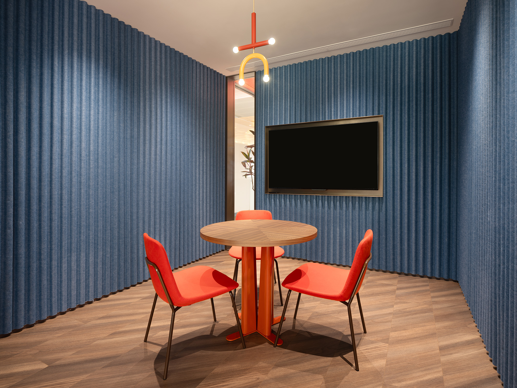 在会议室中特殊材料的瓦楞墙面设计,它不仅是一道独特的风景线,更是声学设计的巧妙应用。 在这里,每一个想法都能被清晰传达,每一次讨论都能直达核心。