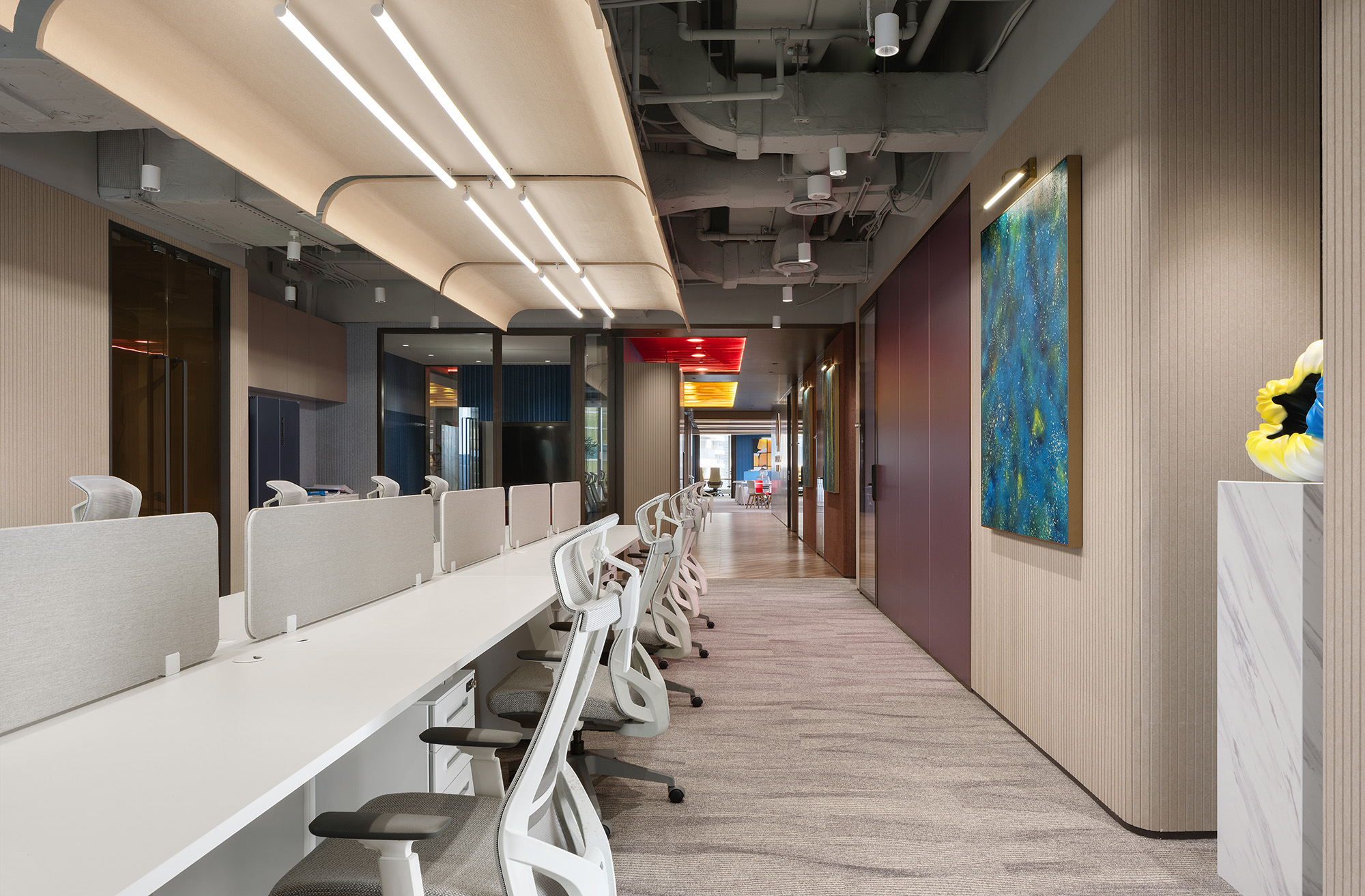空间内了大量的留白设计,玻璃透明、开放式陈列架,不仅能够提供实用的功能,还能增强空间的整体美感和功能性。不仅仅是一个办公空间的革新,更是一次对职场生活方式的重新定义。