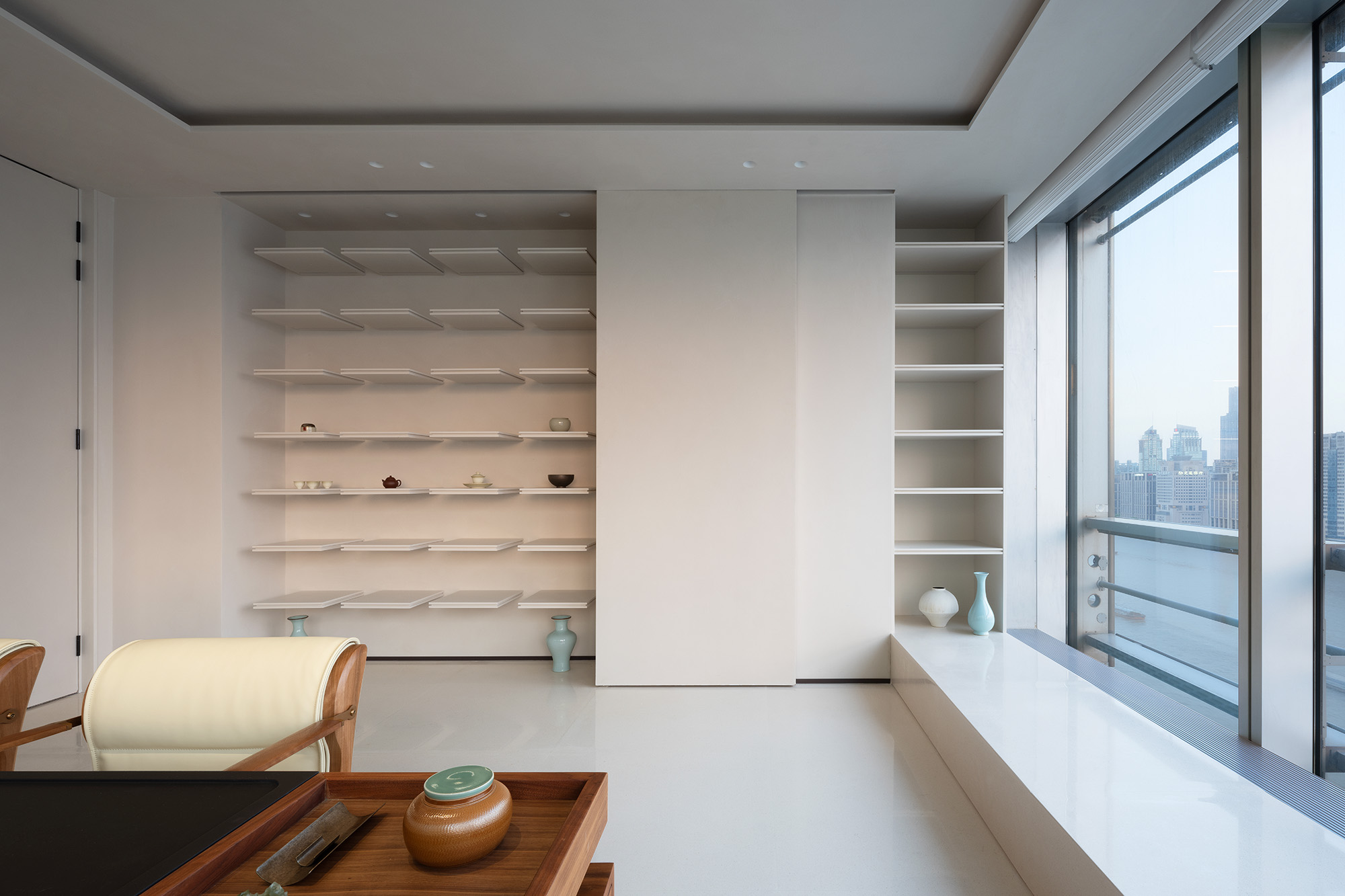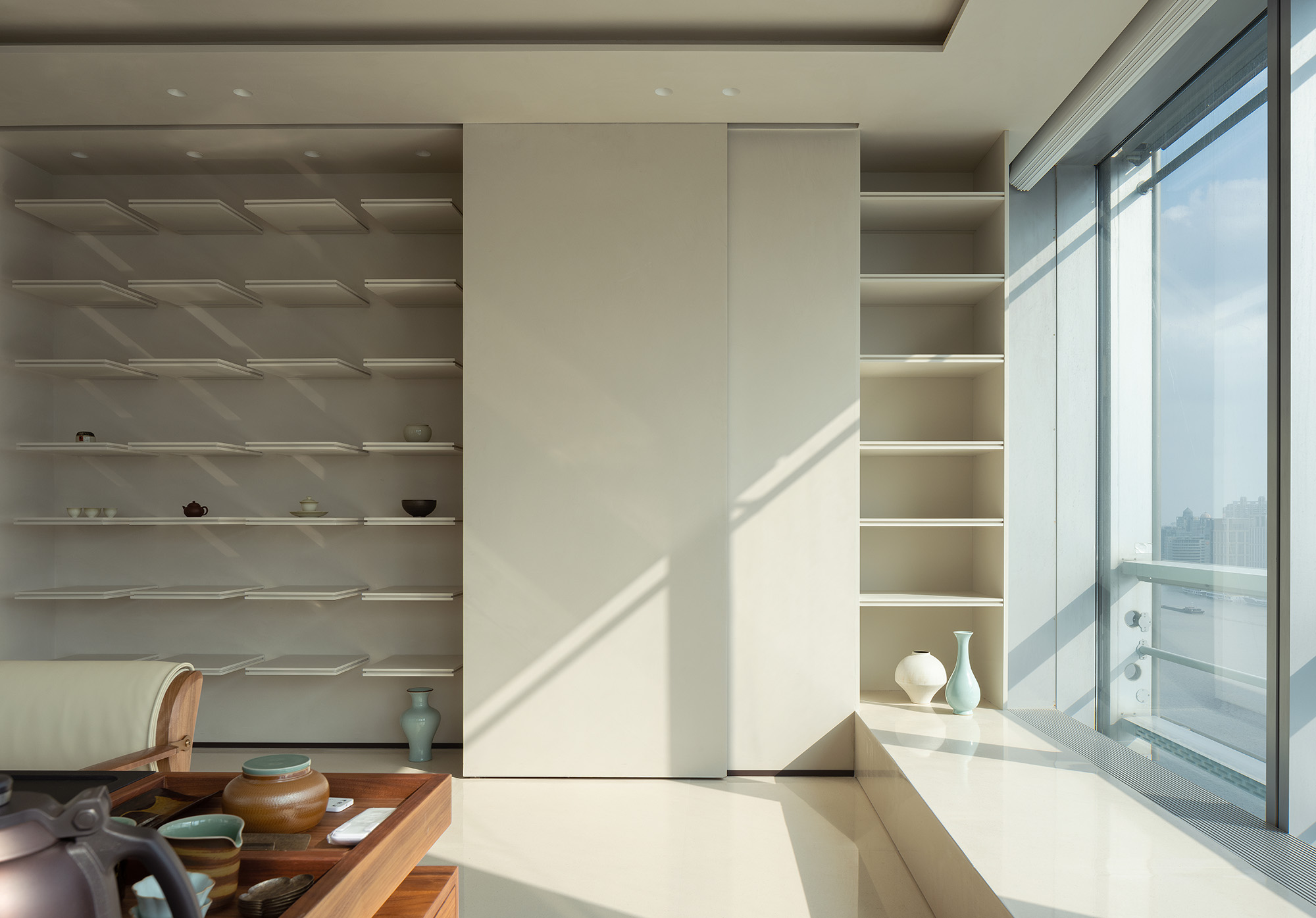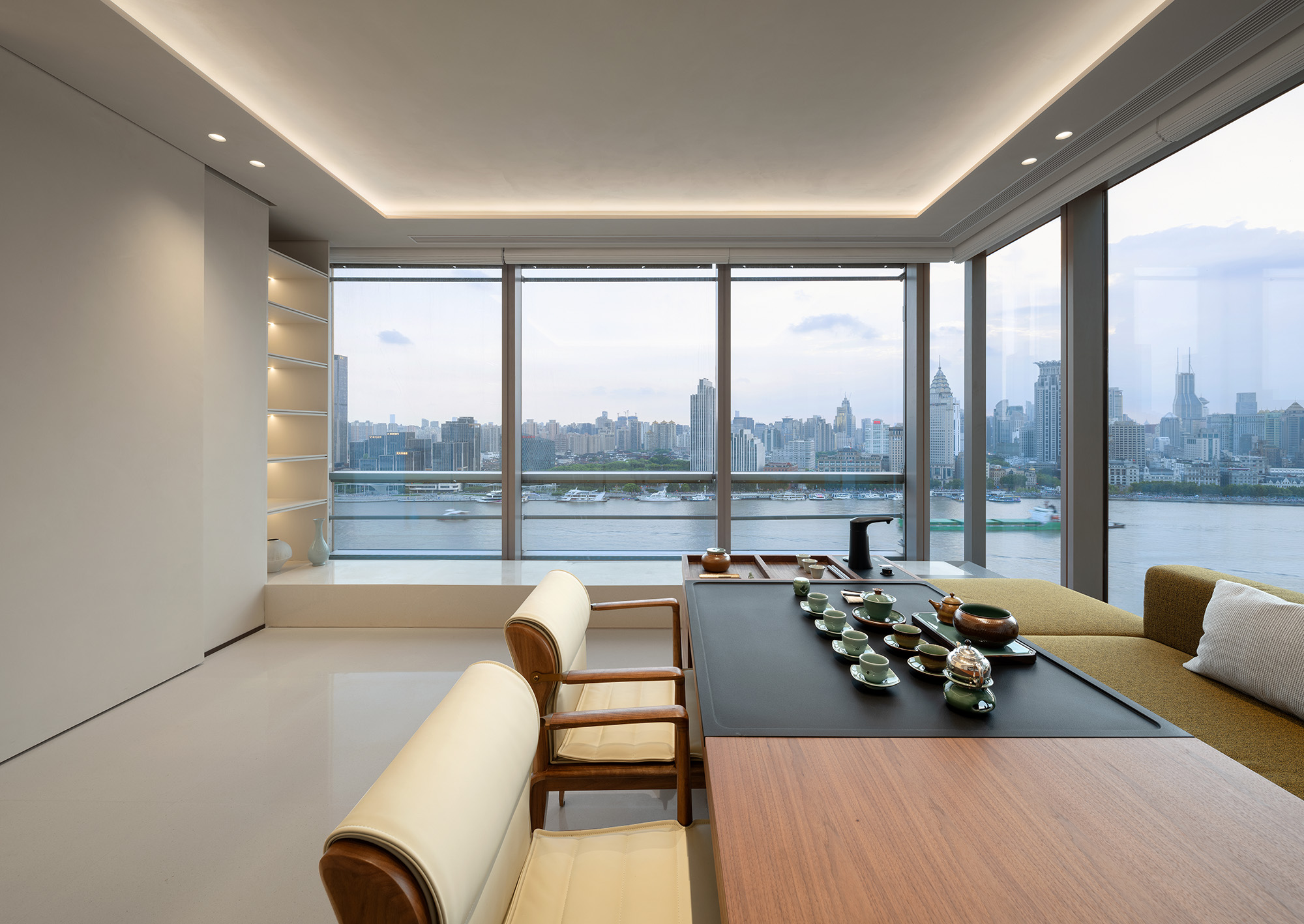 步入茶室,首先映入眼帘的是灰白交织的主色调,两侧墙面采用落地窗设计,不仅保证了室内充足的自然光线,也让宾客在品茗之余,能欣赏窗外美景整体传递出的干净、纯粹视觉效果,非常适合营造淡雅且不失高雅的氛围。