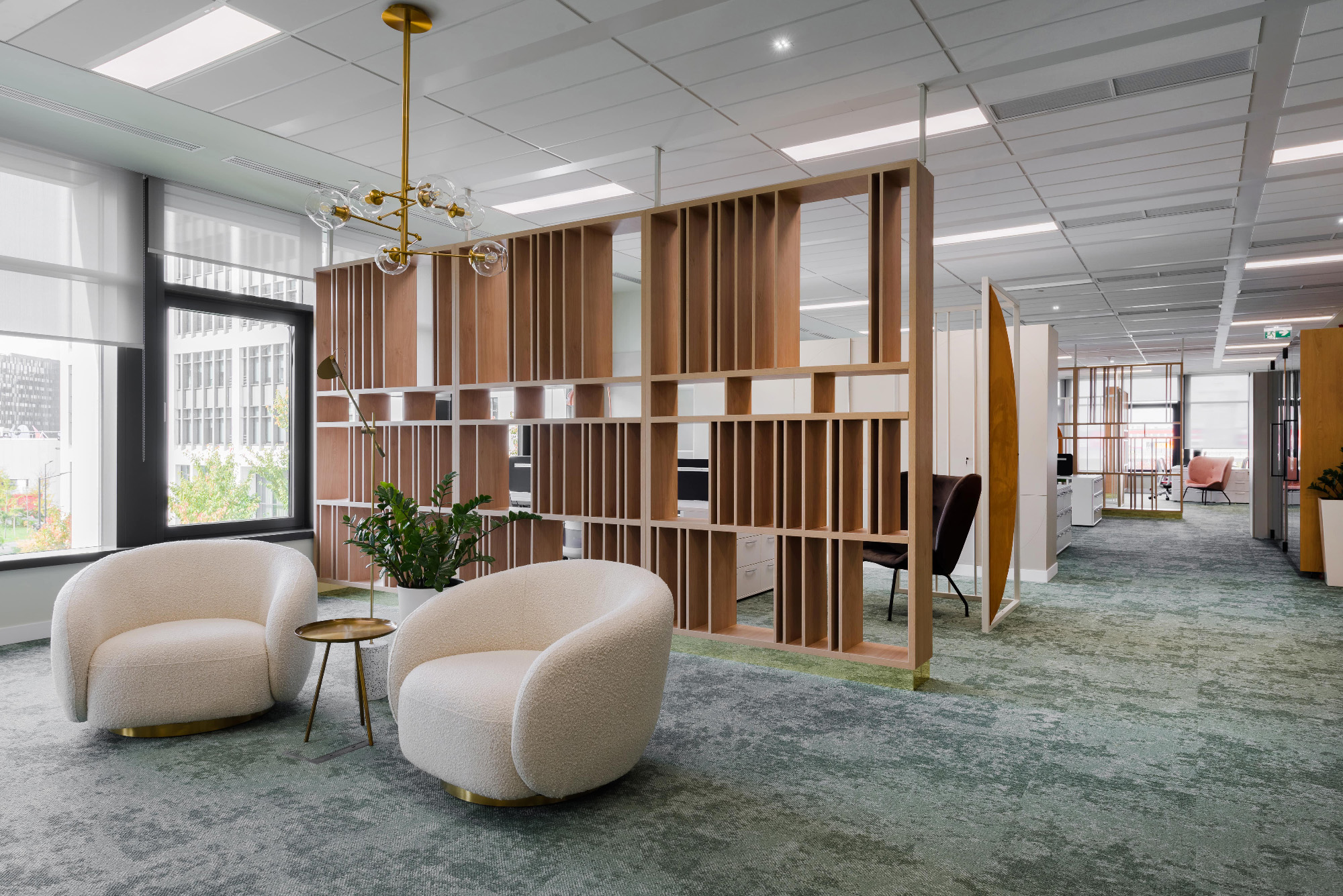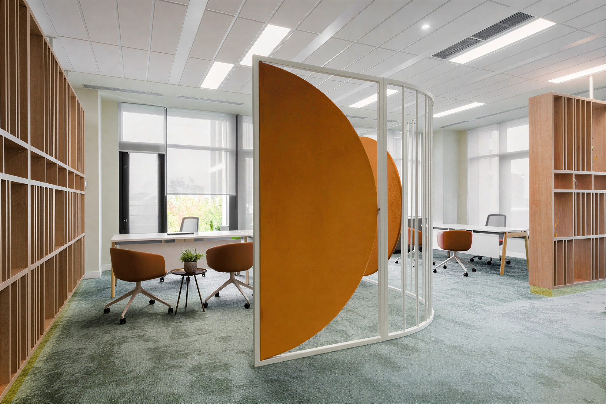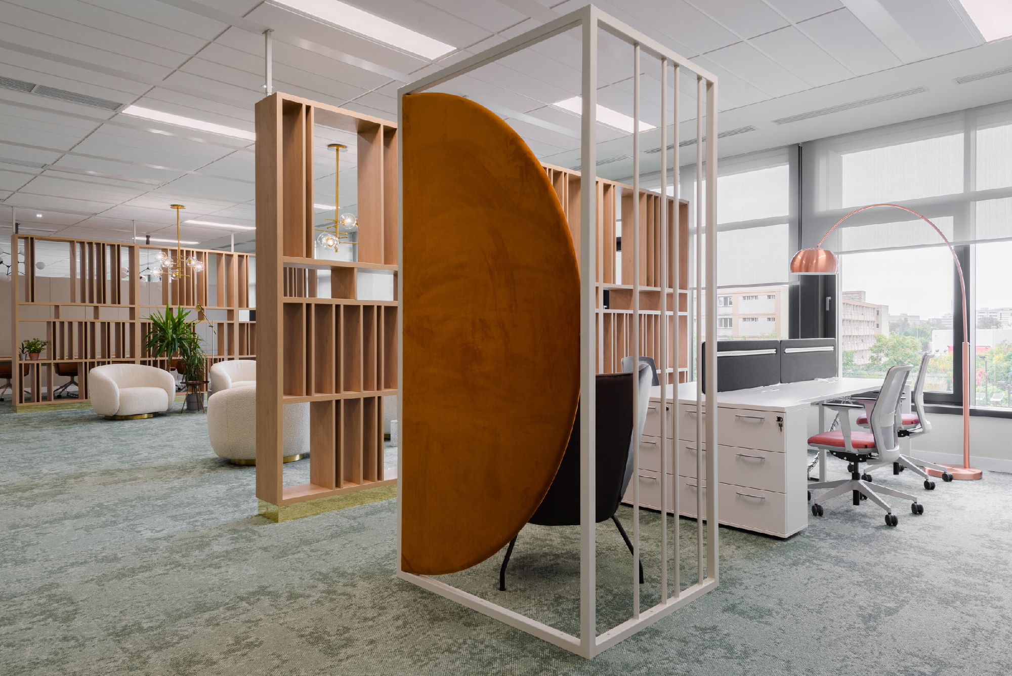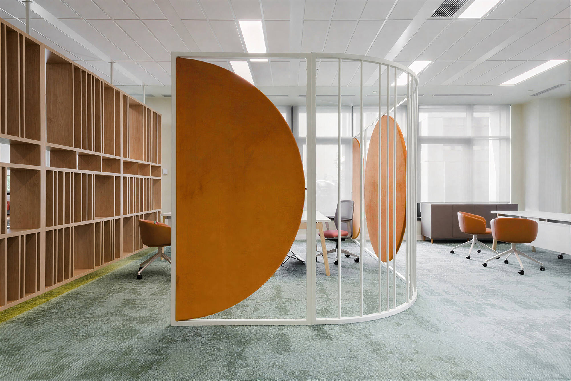 基于此,设计团队进一步探索了在不改变初始布局的前提下划分空间以实现隐私保护、并提升视觉专注度的方案,最终通过家具式隔断与装饰元素构筑出多个功能子区域。