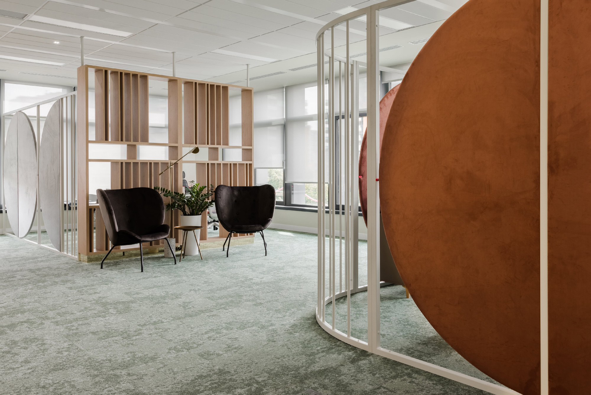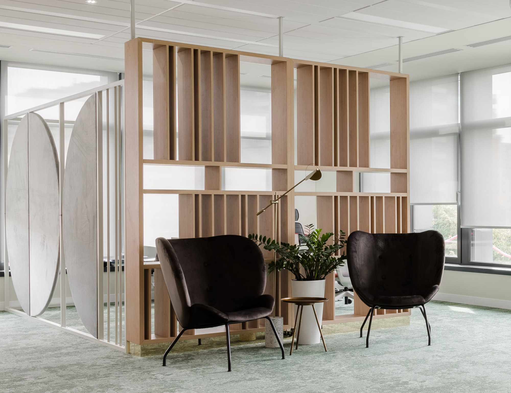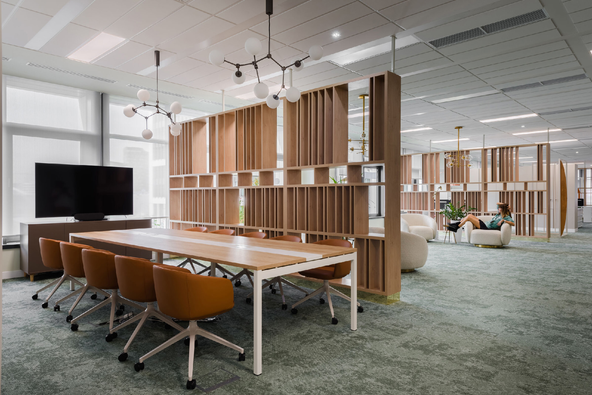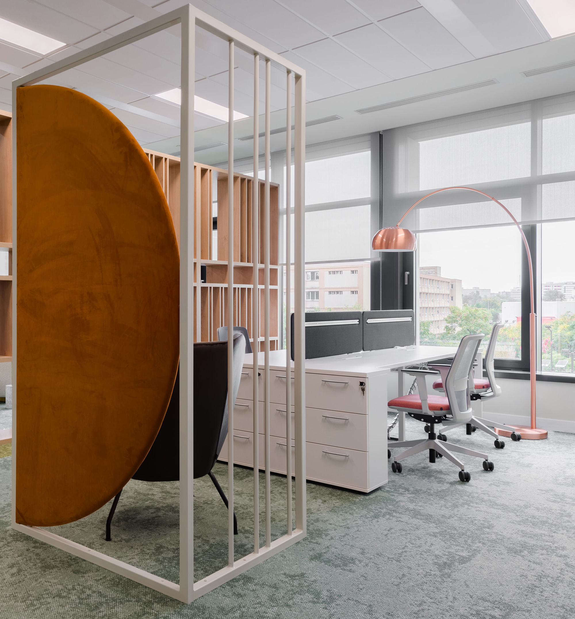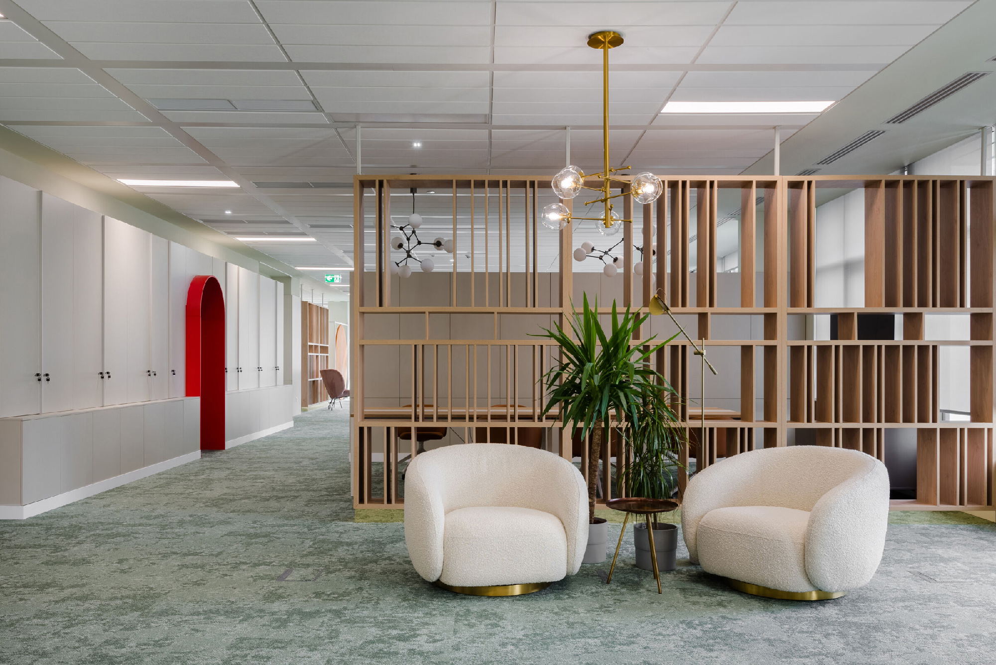 基于此,设计团队进一步探索了在不改变初始布局的前提下划分空间以实现隐私保护、并提升视觉专注度的方案,最终通过家具式隔断与装饰元素构筑出多个功能子区域。