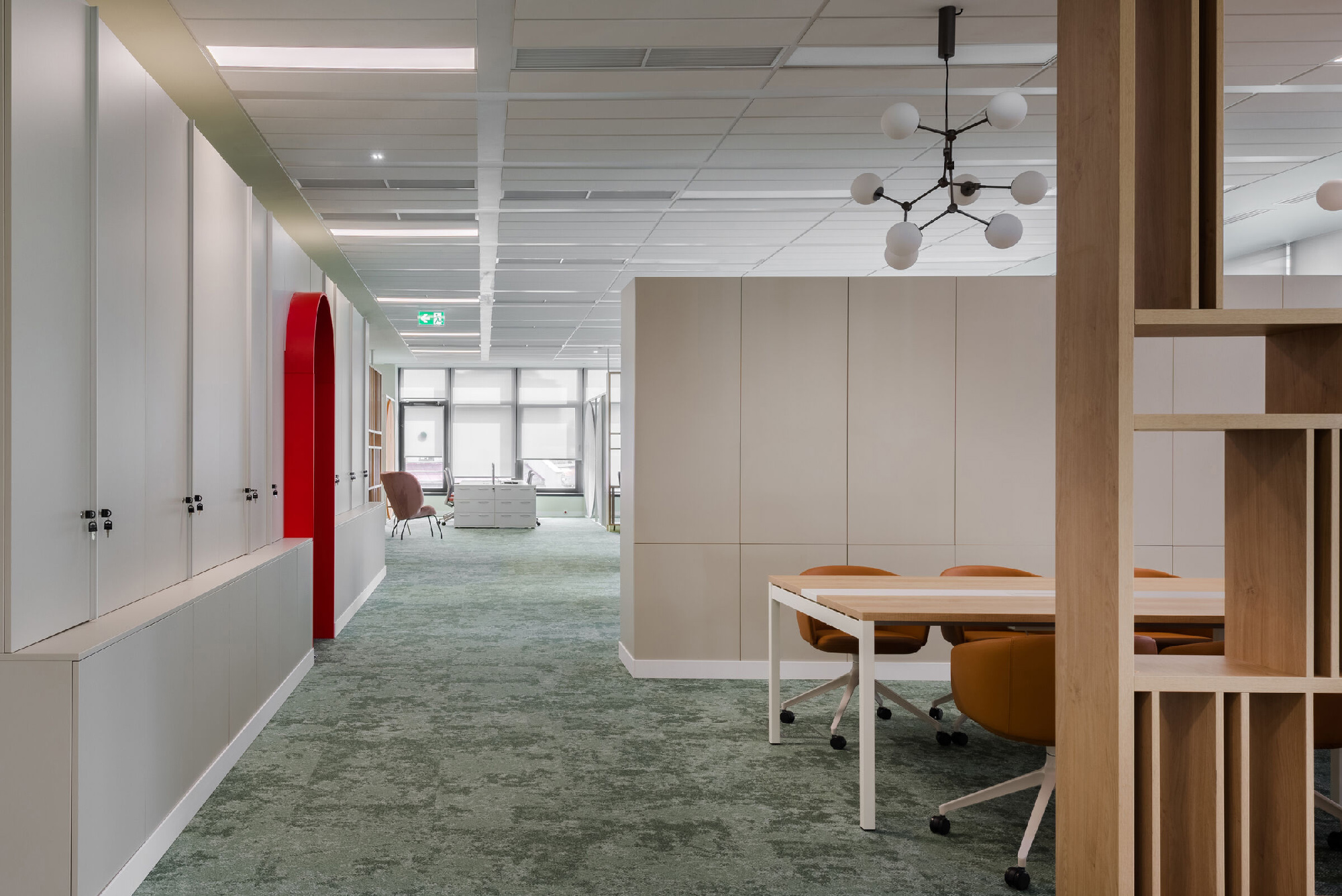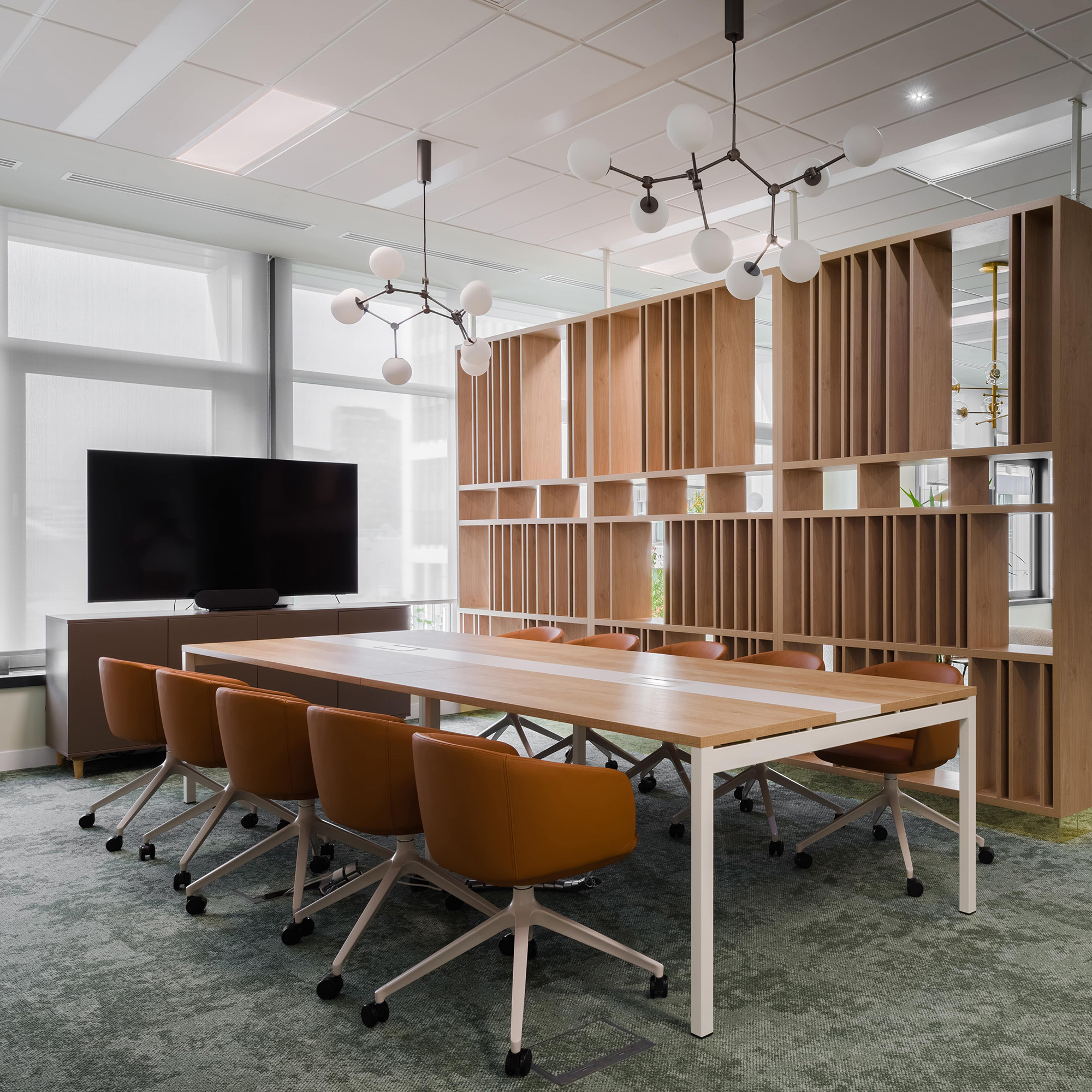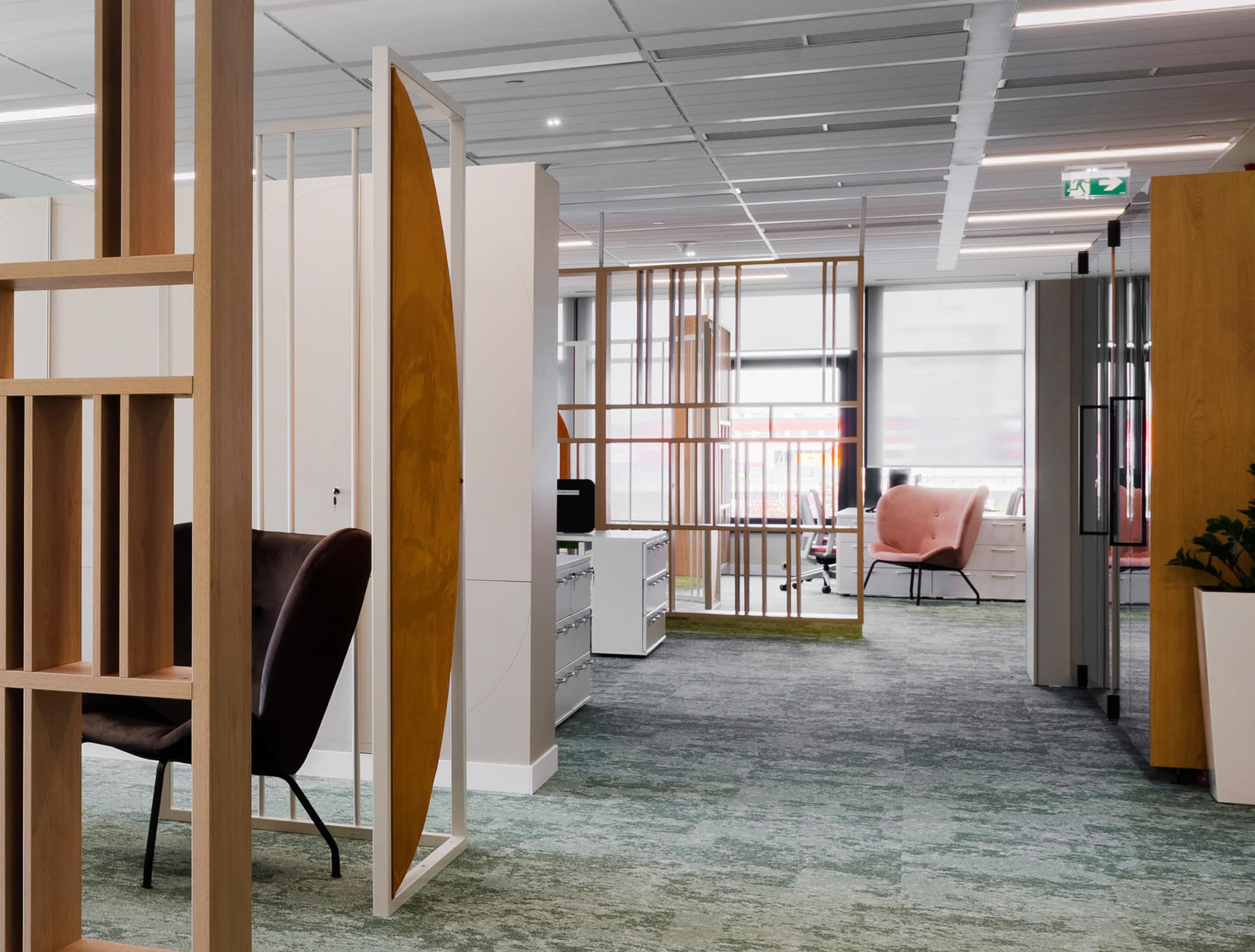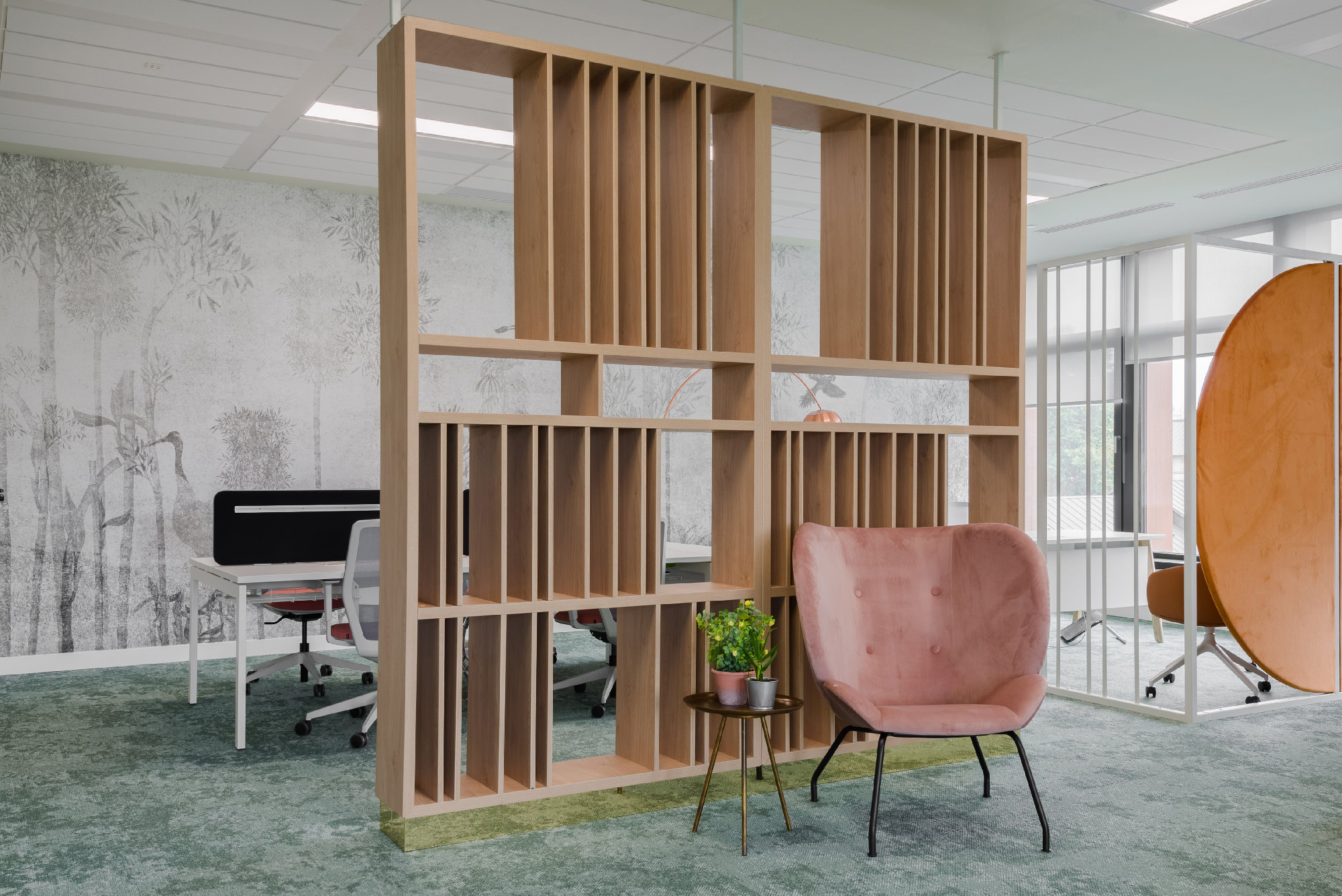 基于此,设计团队进一步探索了在不改变初始布局的前提下划分空间以实现隐私保护、并提升视觉专注度的方案,最终通过家具式隔断与装饰元素构筑出多个功能子区域。