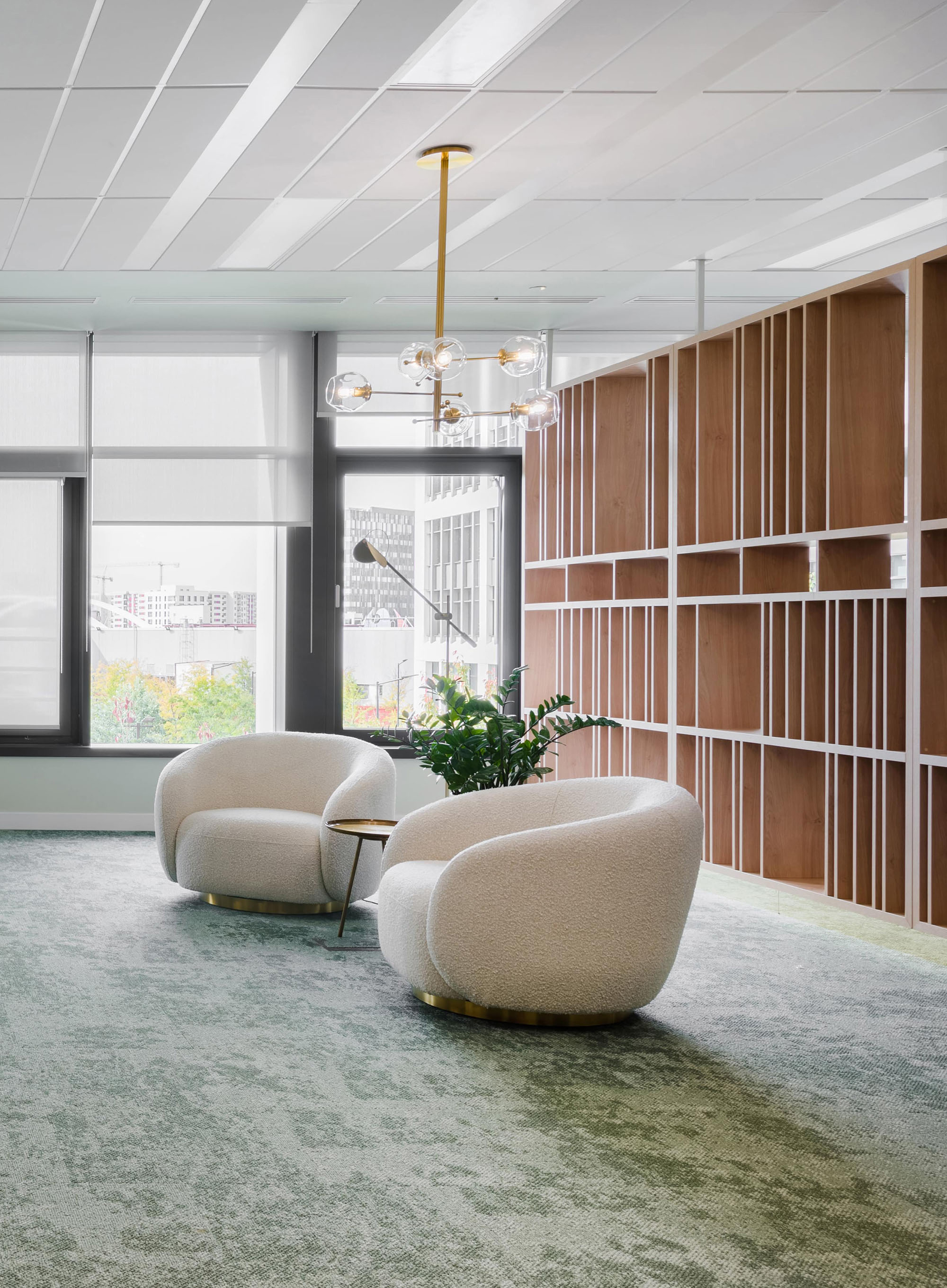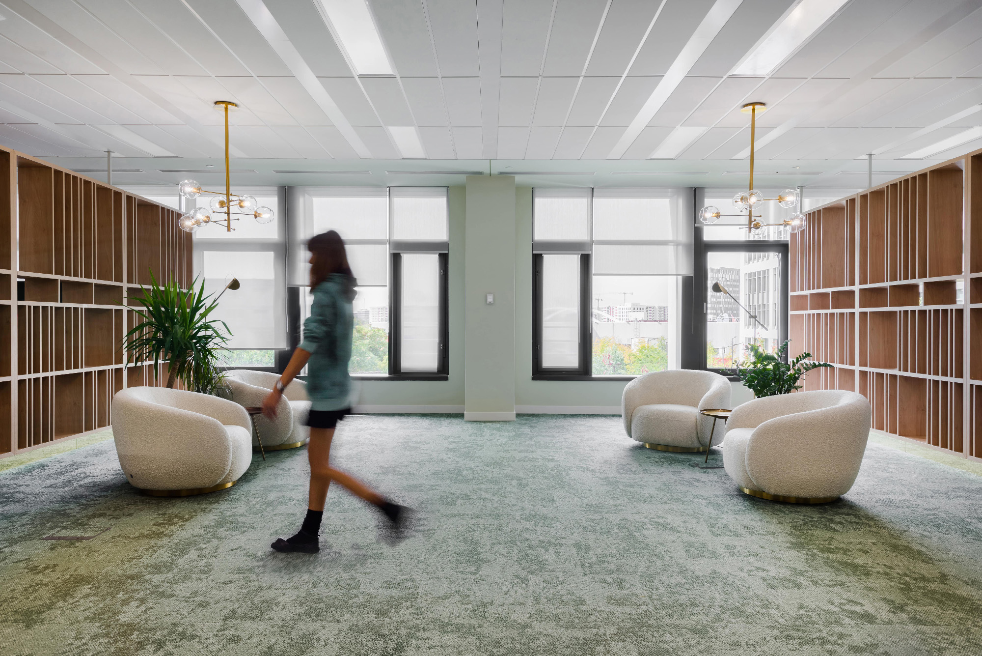 整个办公区域错落分布着休闲座位区,这些区域既为员工提供了转换视觉焦点的机会,也能让他们获得片刻精神休憩,从而使工作体验更显轻松自在。