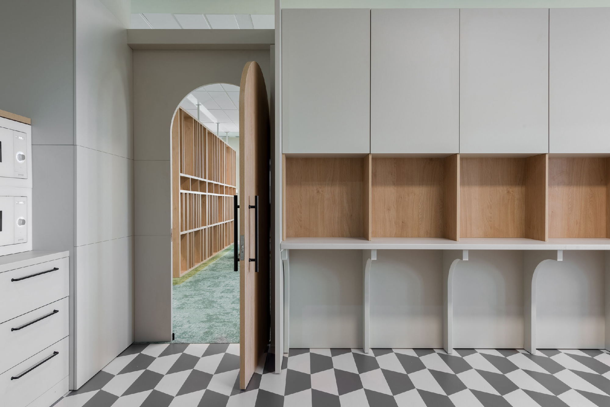 所有隔断的设计均旨在平衡空间感与私密性,采用简洁的线条、矩形几何形态,尤其注重韵律与重复的表现手法。这种由微小元素构成的特定重复模式,为整个视觉领域赋予结构与秩序感,从而强化思维的逻辑性与条理性。胶合板房间隔断的基座采用镜面处理,以延伸视觉空间,强化开阔场域的氛围感知。