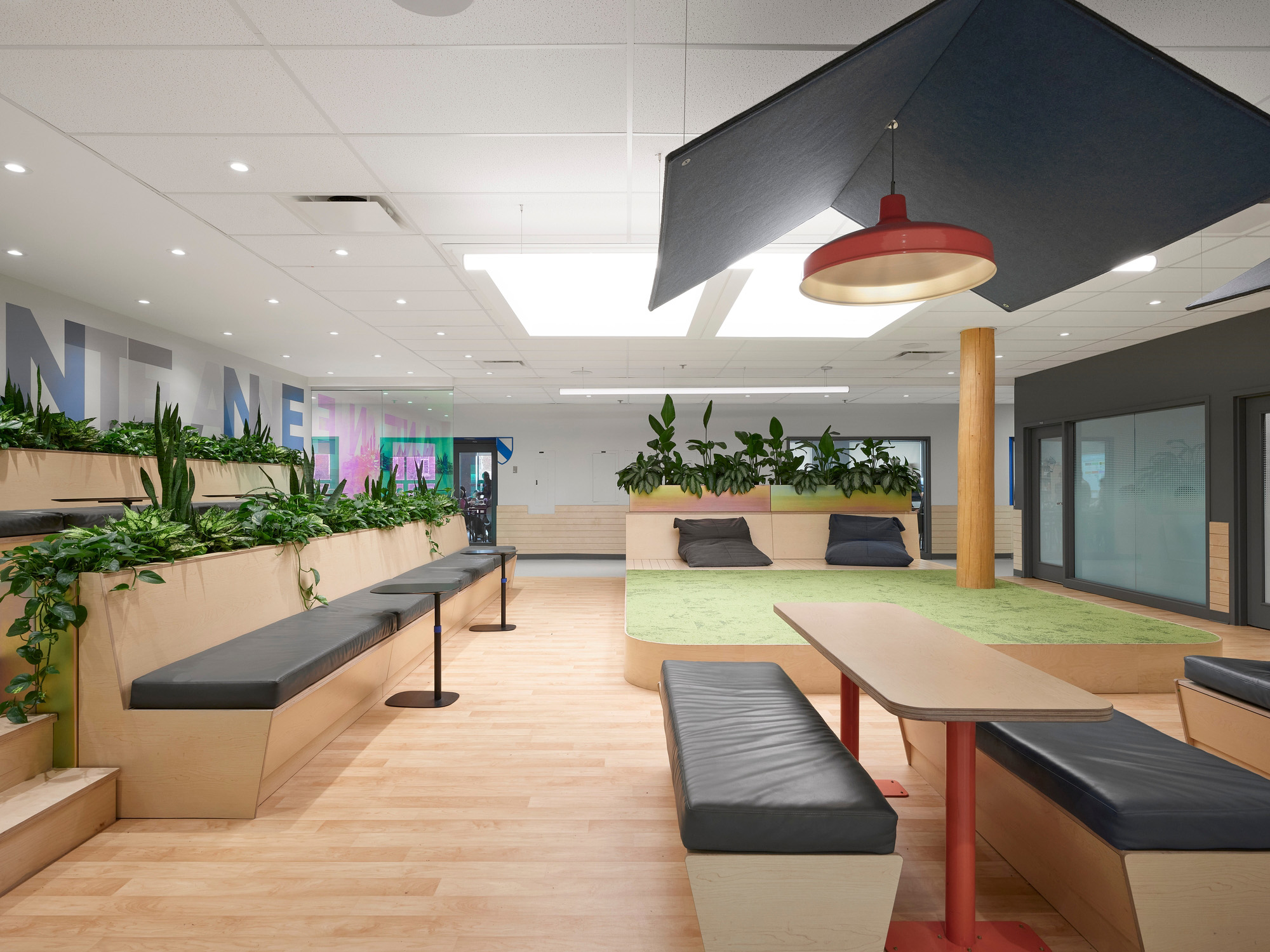 通过扩展教室门前的走廊区域,一个令人瞩目的"第三空间"应运而生。设计师在原始天花板上的战略性开口,将机械设备系统显露出来,使天花板转化为悬浮式绿植廊架。这一全新视角将走廊焕新为鲜活绿洲——一个激发不同工作方式的空间。