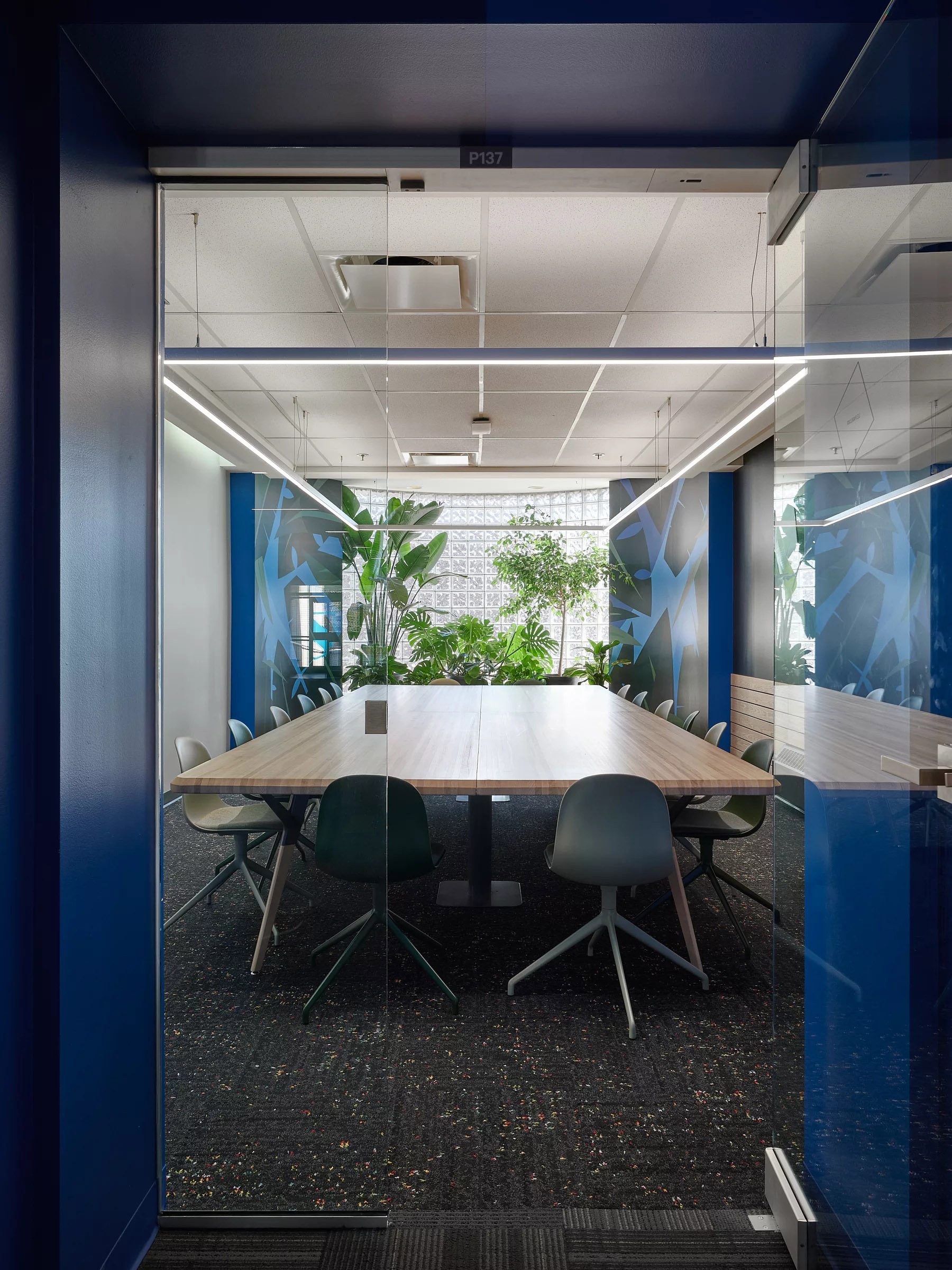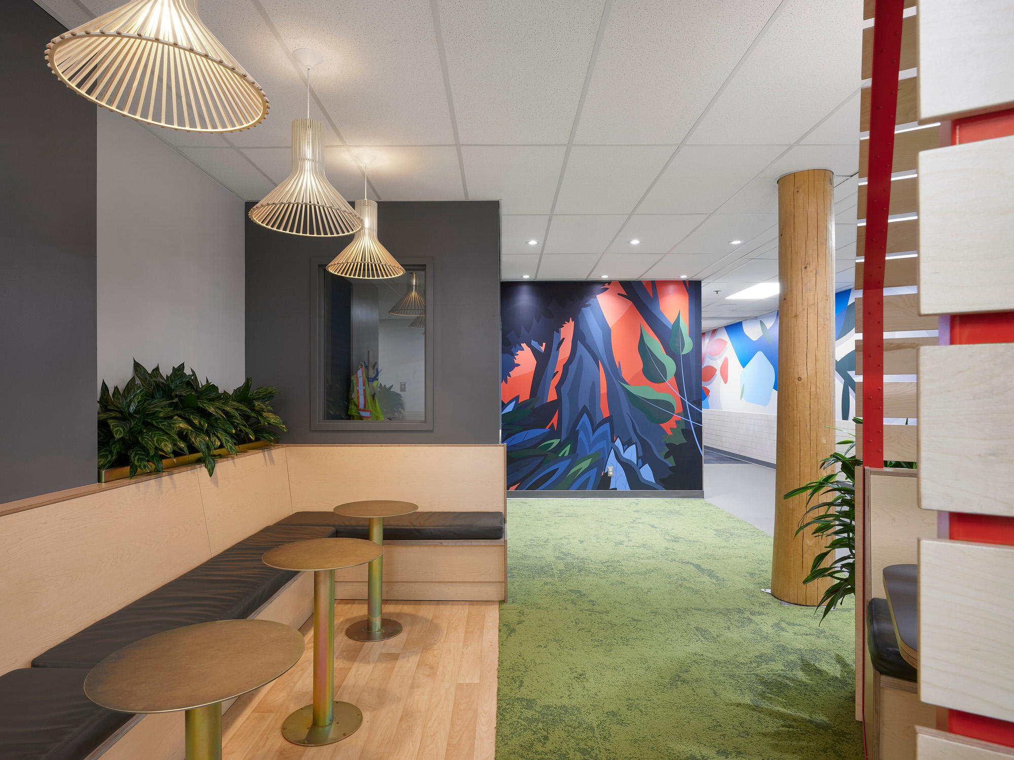 走廊上点缀着多幅以有机物质为主题的特色壁画,与建筑结构形成一场精彩的对话。大量繁茂绿植的融入强化了自然气息,柔化了各功能区之间的过渡。这些元素共同营造出"第三空间"轻松自在的氛围,为这个充满生机的环境增添了更多活力。