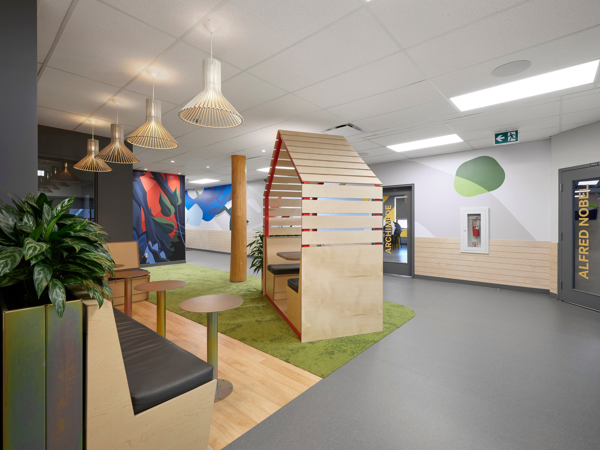 一楼接待区通过拆除围挡结构,现已成为空间的亮点。设计师通过突出学校的象征色彩、运用多种北欧木材,并将校方的动物图腾以座椅形态融入环境中,为访客营造出温馨宜人的环境与丰富的感官体验。