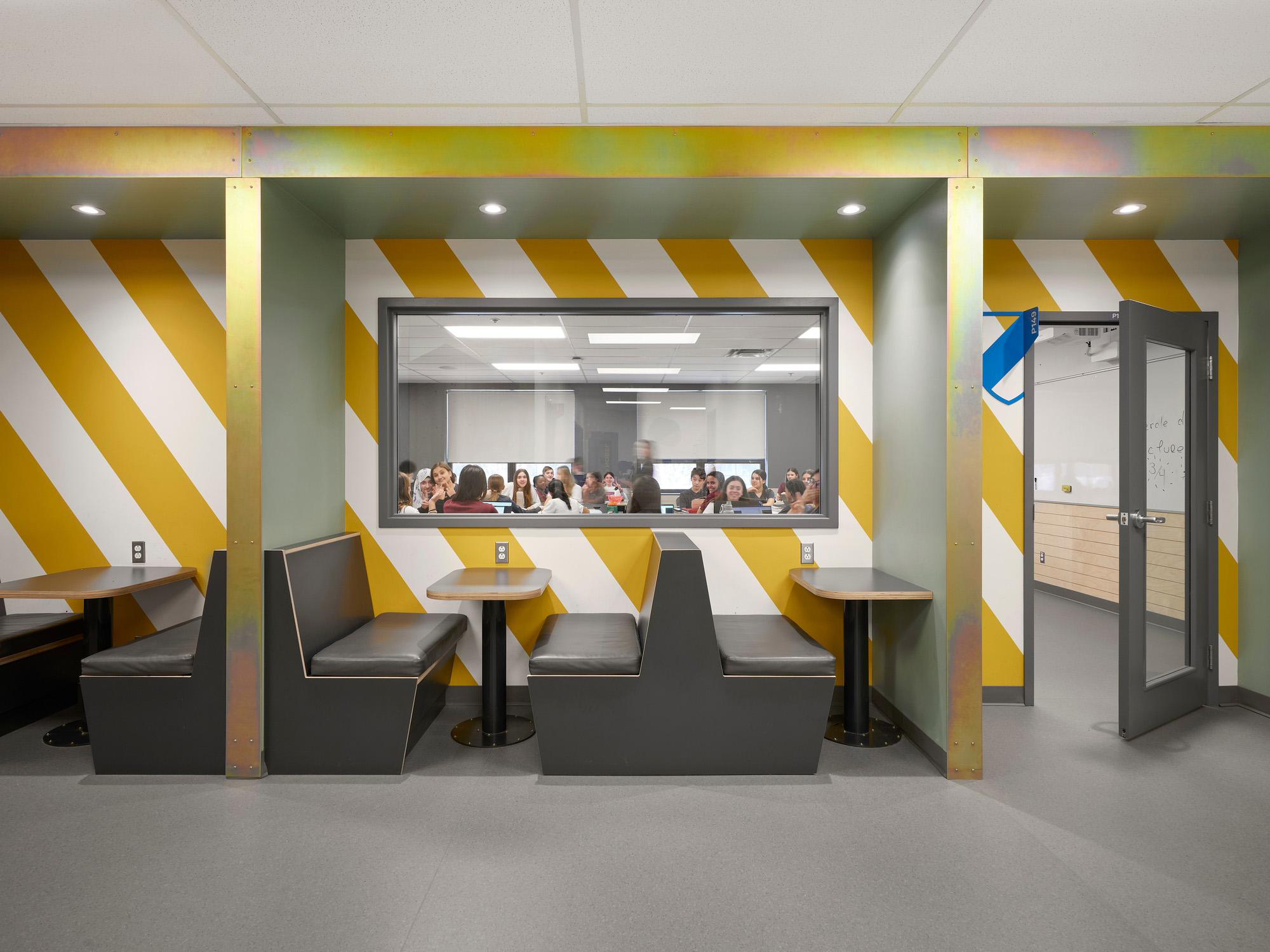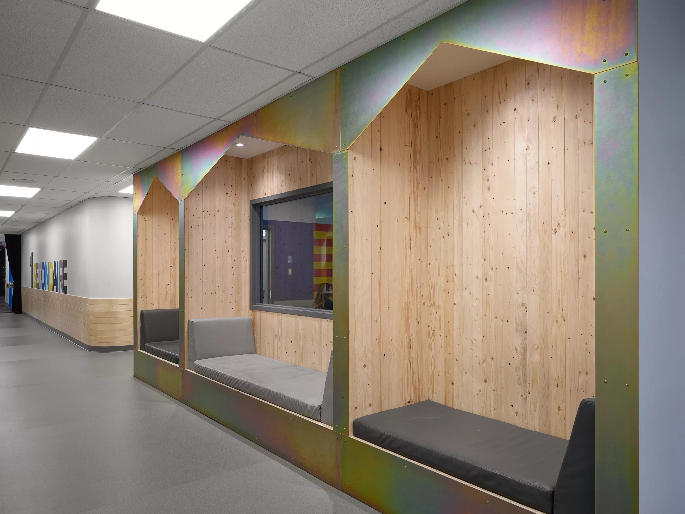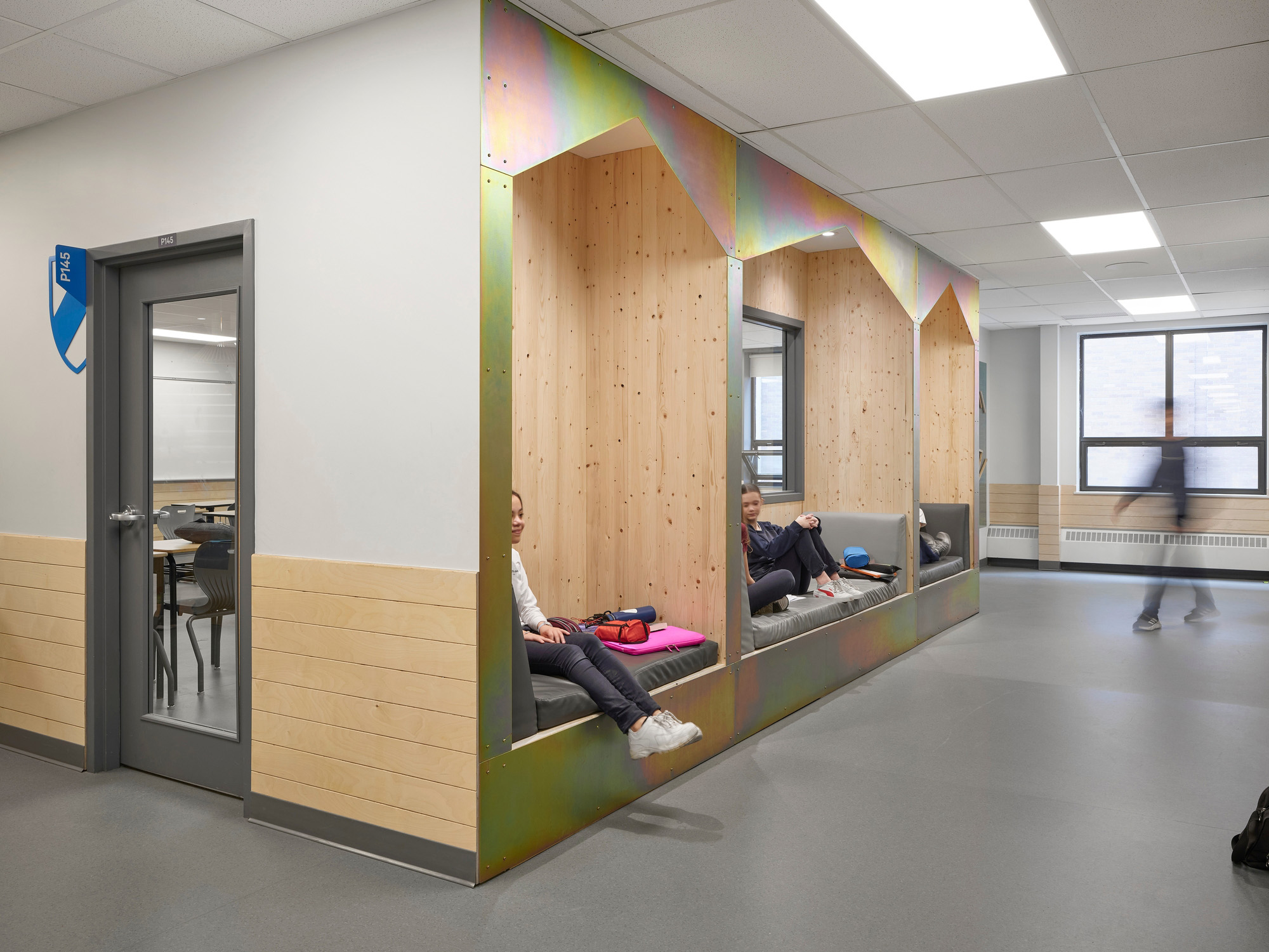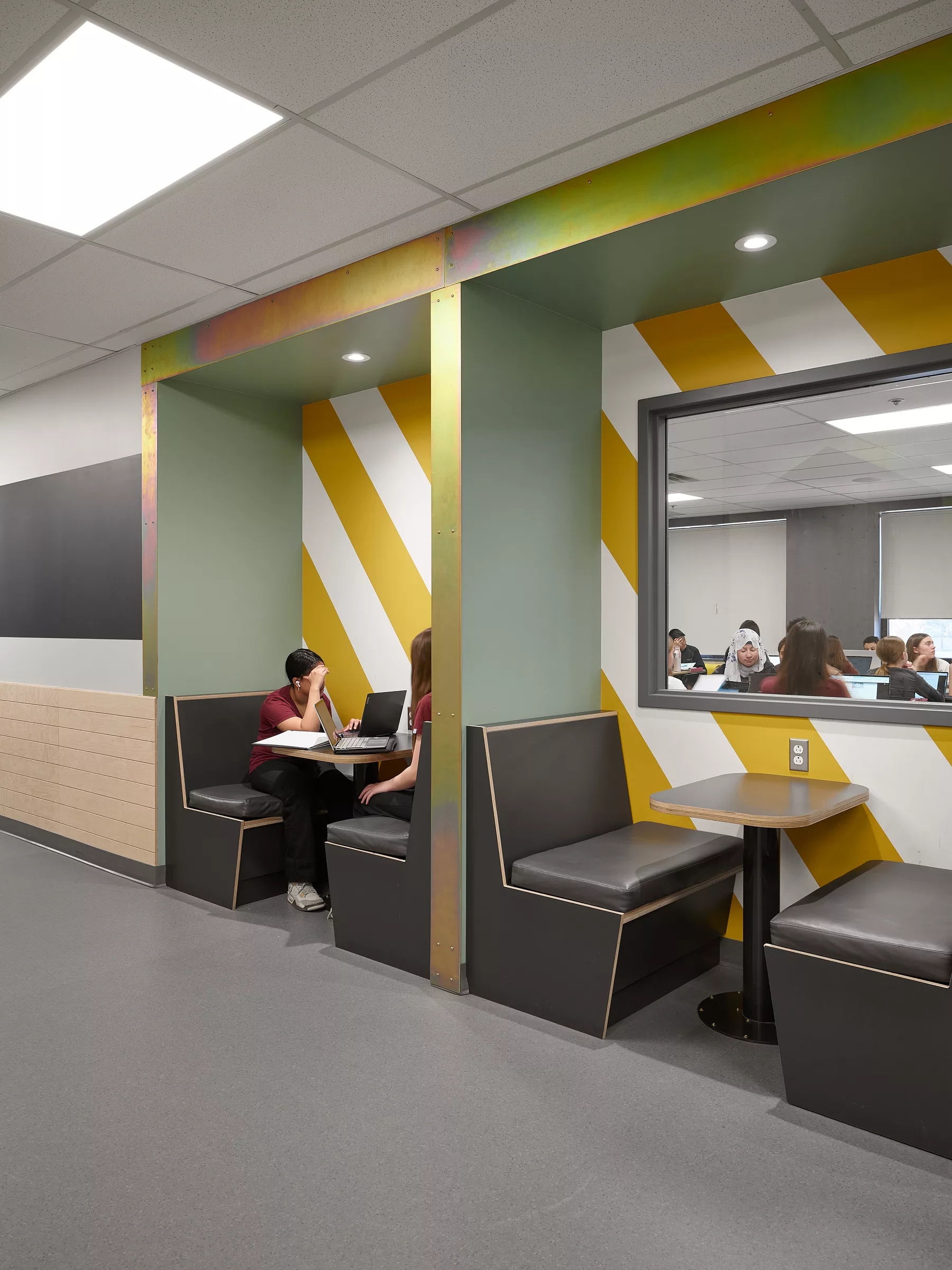 沿走廊稍行数步,一处新设的内嵌式座位为繁忙的学术氛围提供了休憩之所。这个被称作"冥想区"的空间,以其小屋般的亲切轮廓引人注目——彩虹色锌板装饰的三角楣饰尤为突出,其反光面会随着一天中时间推移与观者位置变化,以微妙方式与光线共舞。这个宜人的环境为学生提供了理想场所,无论是需要短暂歇息、重寻内心平静,或是单纯沉浸于片刻安宁,皆能在此获得抚慰。