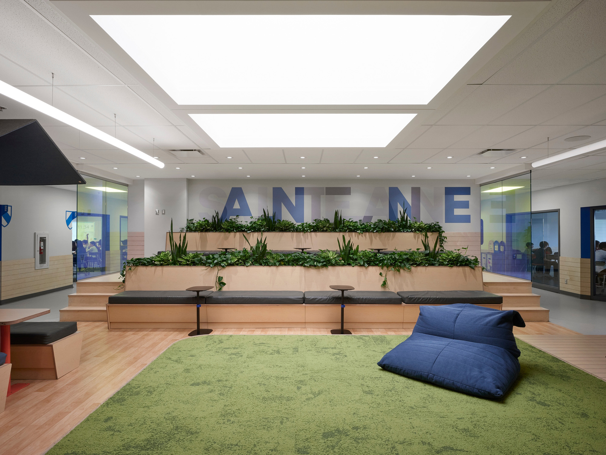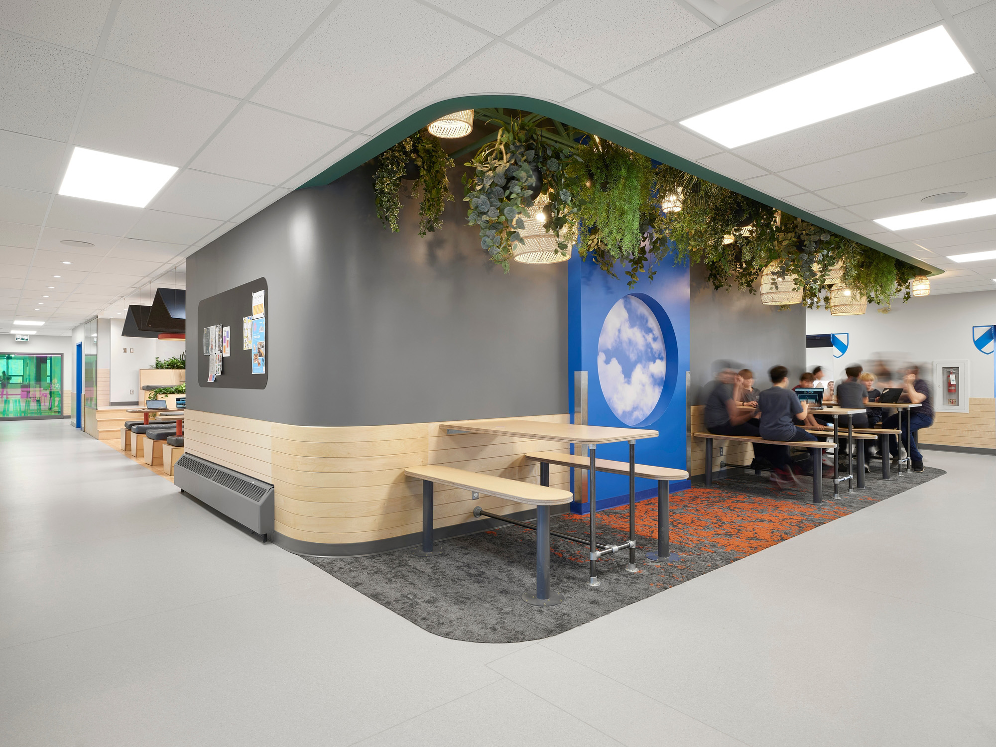 楼上,两处天窗之下形成一个能量涌动的中心空间。中学一年级管理团队的办公室设于此地,使他们置身于活动中心,并与学生建立直接联系。房间中央引人注目的是层层叠落的植被花台,营造出温暖自然的集会空间。每层结构皆设有木质座椅,并配有软垫以提升舒适度,绿植环绕的设计既促进舒适的社交互动,也适宜宁静独处。