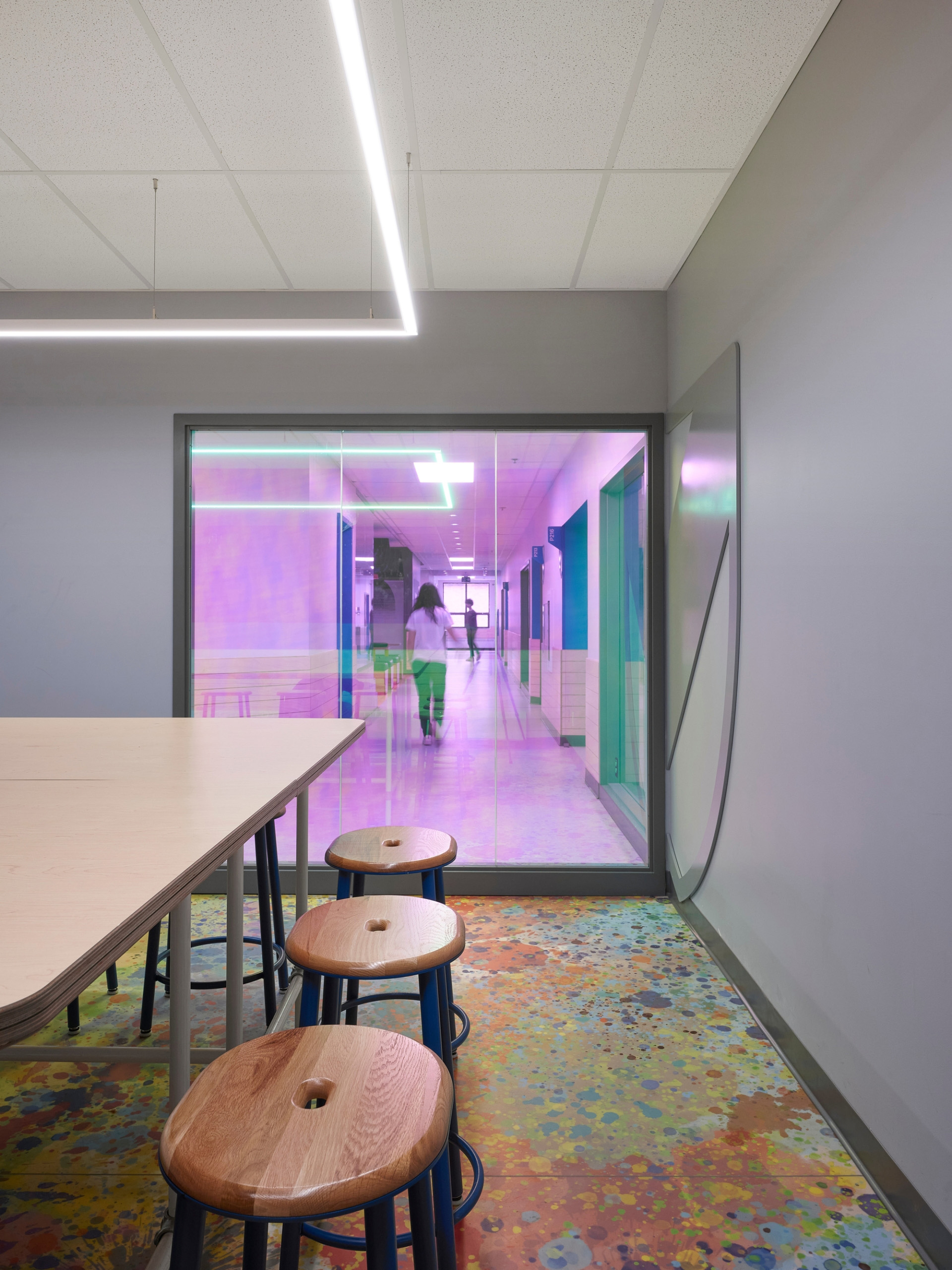 中央讲台区铺设的大幅绿色地毯,以自由创意的方式吸引学生在此聚集。讲台两侧的玻璃隔墙覆盖着虹彩膜,随着室内活动的节奏流转,形成色彩与光影的波纹律动。这种微妙的光影交互将日常通行转化为真实的视觉体验。