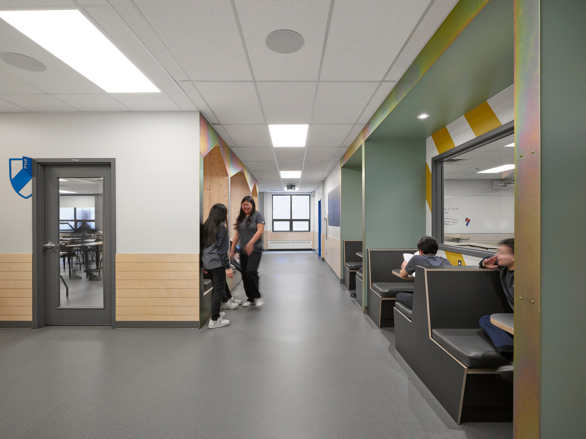 这栋建于1980年代的建筑,是典型的采用围绕中心筒布局的教室设计,形成封闭式环形走廊,既缺乏活动空间又无明确导向。为给这两层空间注入新鲜活力,设计策略聚焦于开放多个中心区域。这一结构转变催生了供学生使用的活力聚会空间,同时每间教室增设的大型外窗让自然光线得以充分涌入建筑内部核心区域。