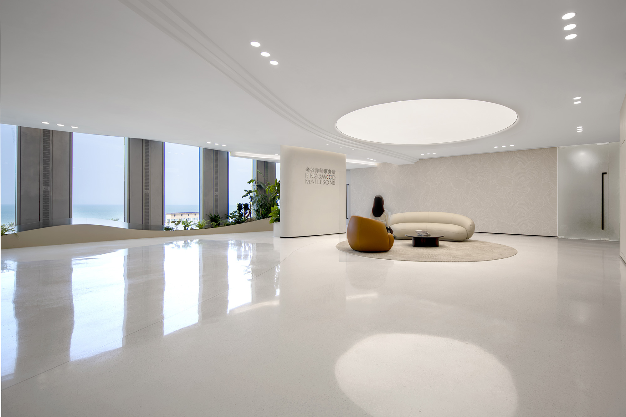 本设计以海口金杜办公室得天独厚的一线海景为天然画布,巧妙融入阳光的璀璨、沙滩的柔和、海洋的深邃,将连绵山峦的层叠轮廓与海浪奔涌的灵动曲线化作优美流畅的弧线,对功能区域进行艺术化划分,保障空间通透敞亮,赋予整体布局如乐章般的韵律美感。