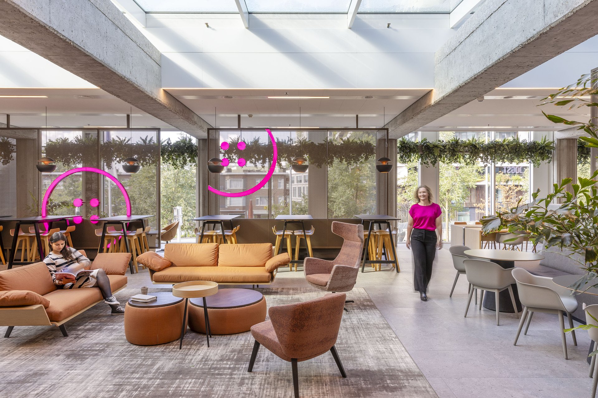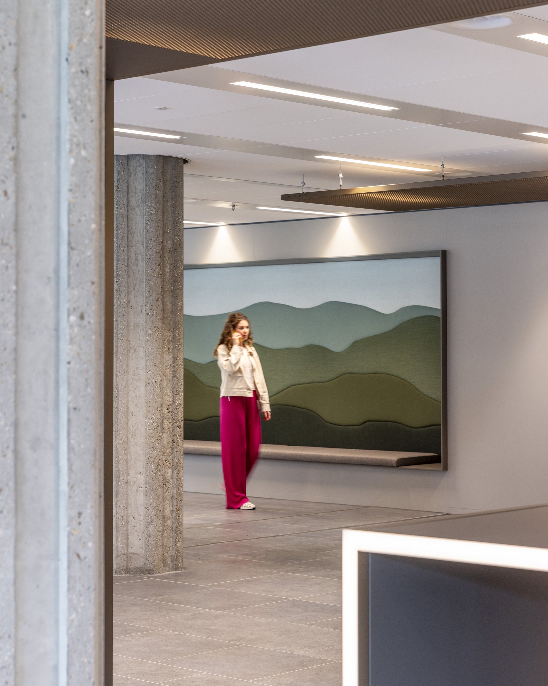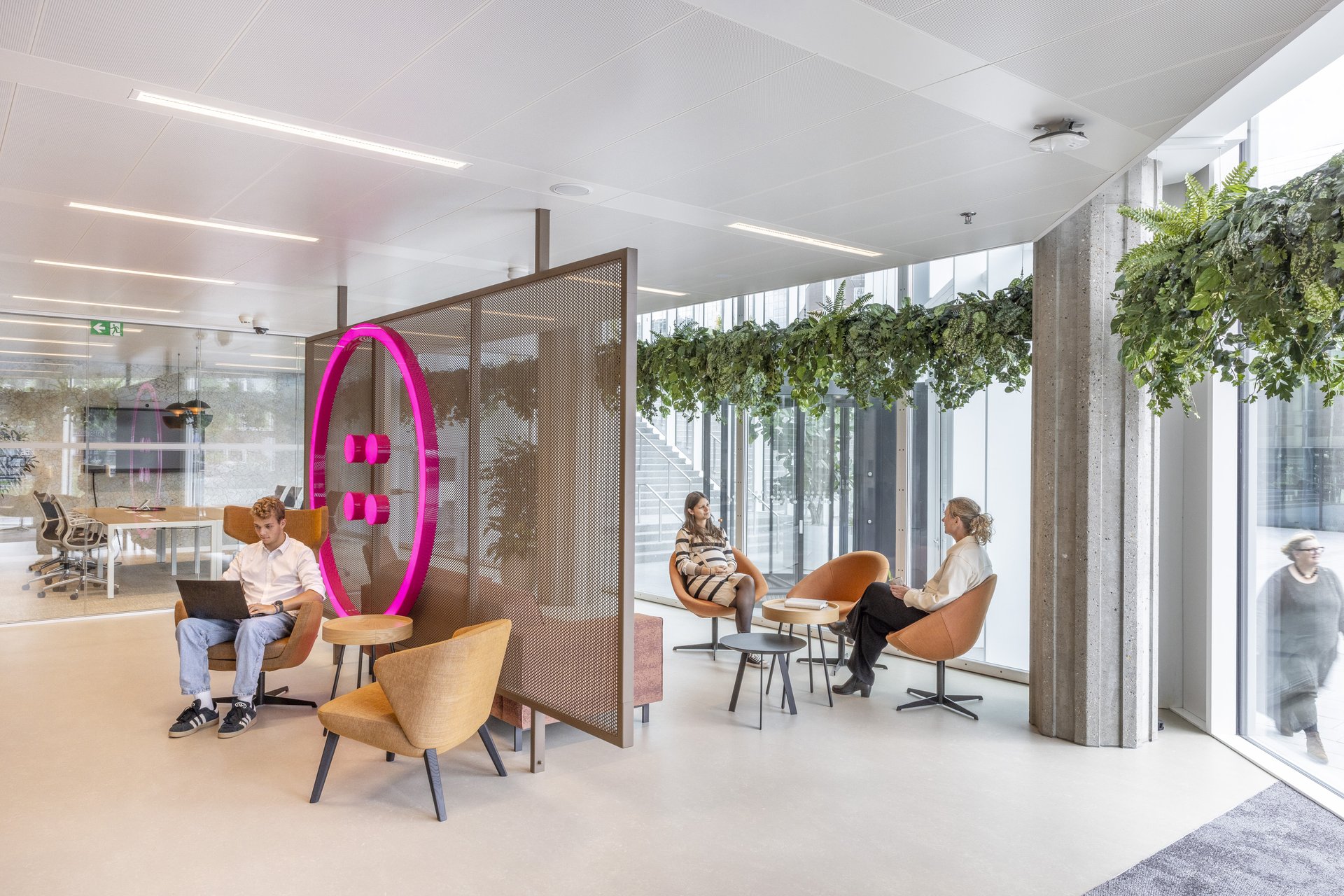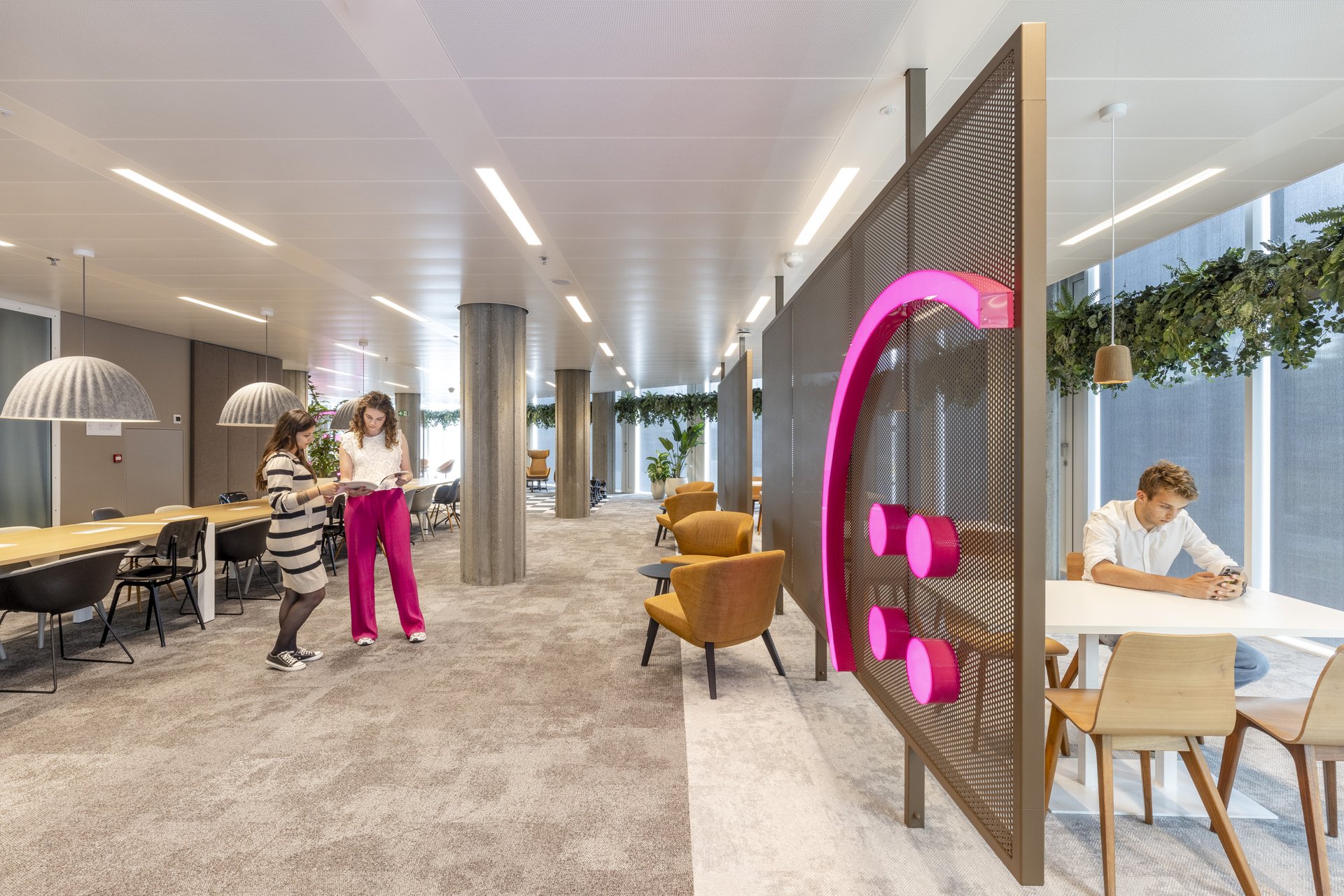 粉色是活力的象征。它指引方向,激发流动,点燃协作。从金属编织的标志性吧台,到以再生纽扣装饰的餐桌,设计在曲线与直线间游走,通过光影与材质浑然相连。活力,在软椅POEF、脉搏PULSE与激情PASSION中跃动——这三个以粉色霓虹点亮空间的词汇,象征着流动、能量与表达。可移动的座椅鼓励对空间的动态使用,而形态与色彩则为整体注入了韵律感。亲生物设计为空间平添一份平衡与宁静:一面葱郁的绿植墙宣示着蓬勃生机,声学板则如山水画卷般舒展,赋予空间以自然纵深。