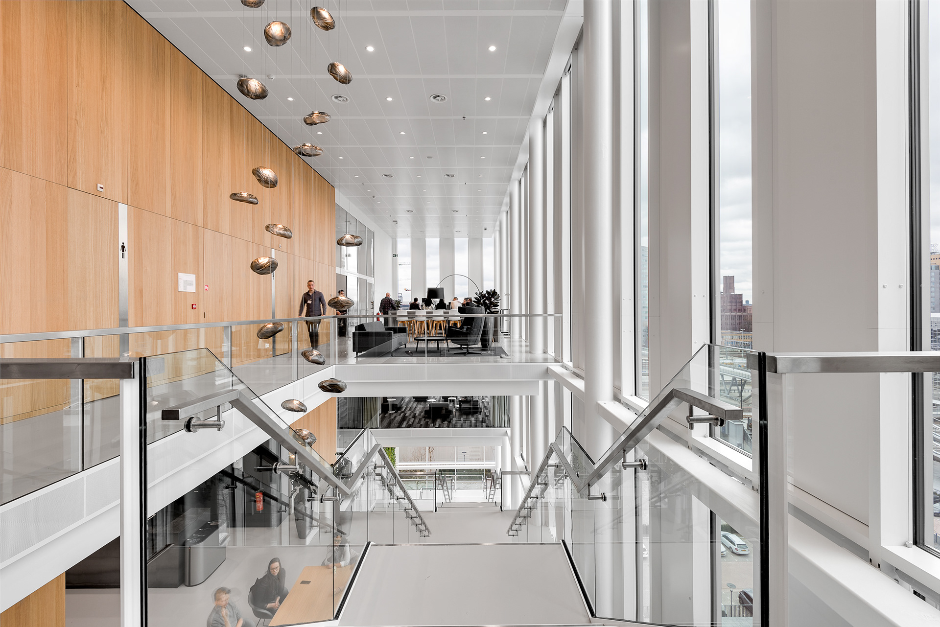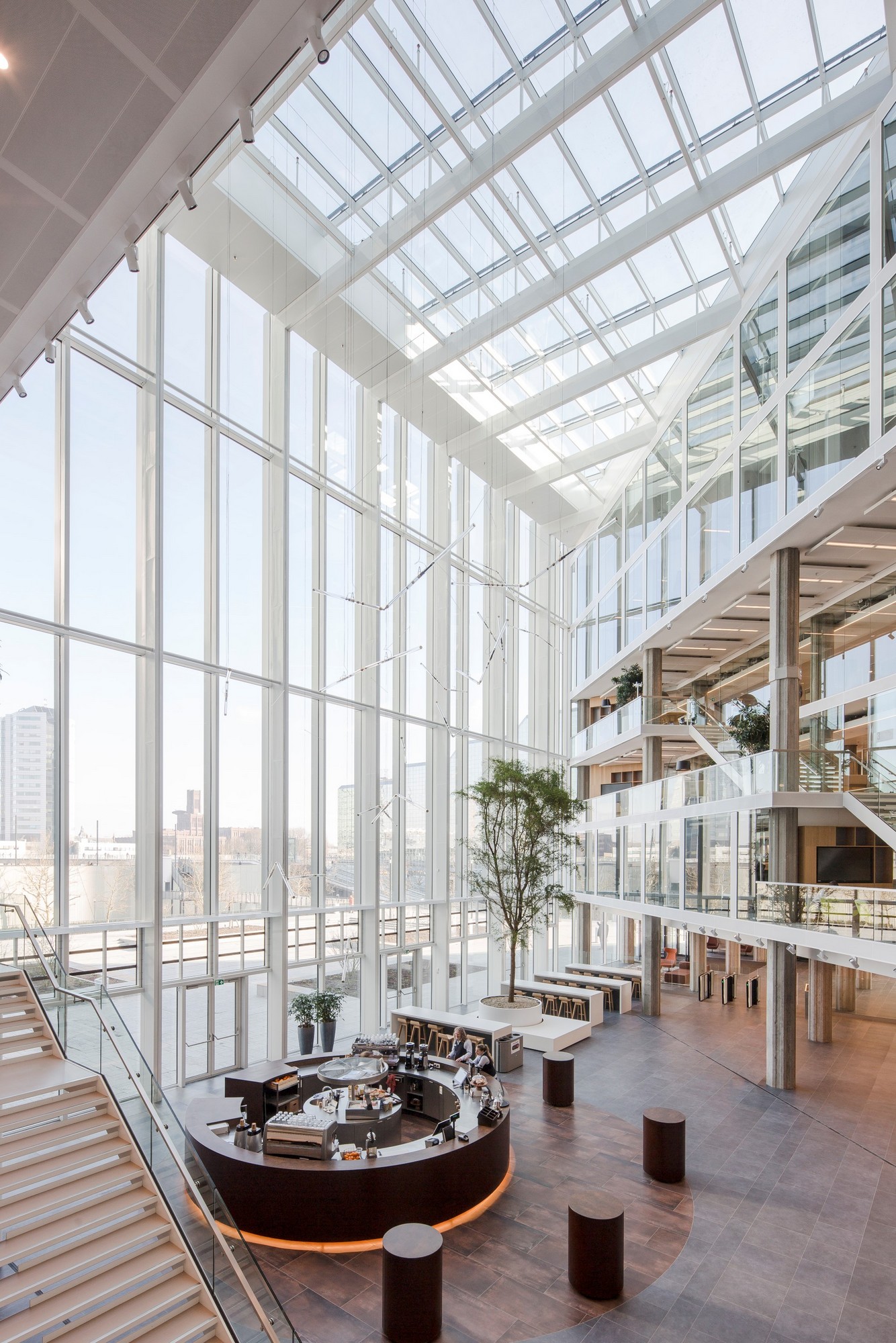 树木与绿植融入设计中,将自然生机引入室内,而城市地标景观则成为空间导向的视觉锚点。会议中心内,围绕挑空区域与楼梯设置了开放式交流区,可容纳多达300人在会晤前后自由交流和联络。办公区的各个锚点设计,呼应着不同使用者的身份特征。设计深化工作甚至延伸至图形化导视系统的构建。Studio Drift艺术工作室为中庭咖啡吧上方的装置创作了令人着迷的独特设计。