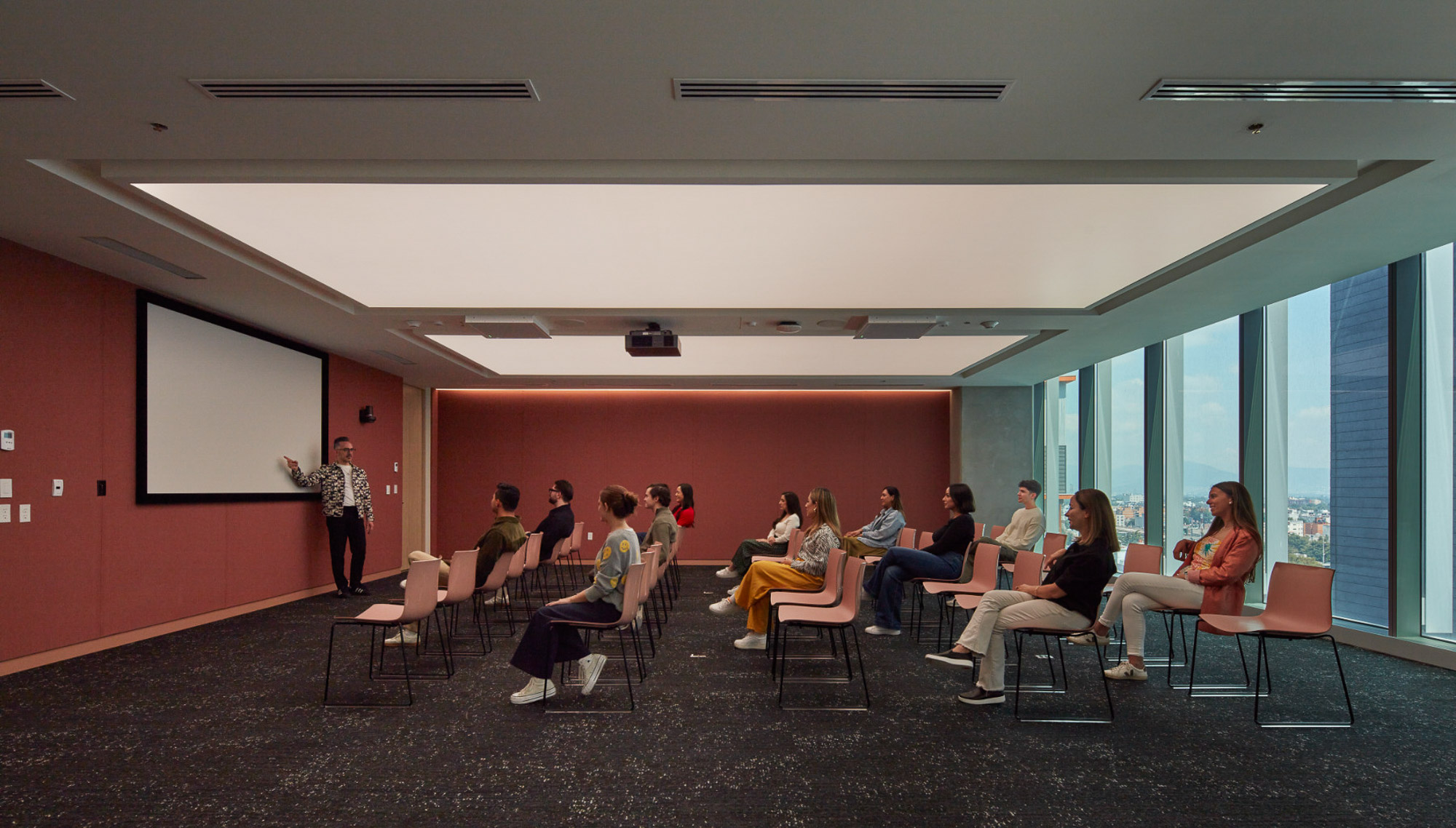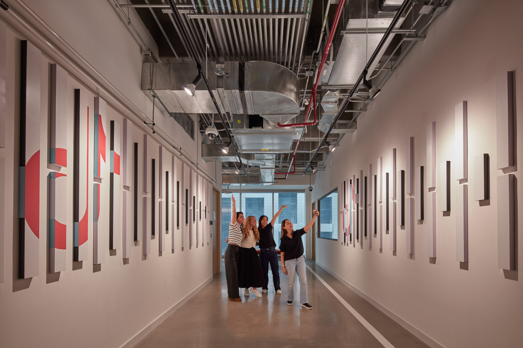 Gensler的设计灵感源自项目近旁的艺术画廊。采用一条贯穿中央的环形动线重构办公空间,仿照画廊观展路径营造沉浸体验。墨西哥城本地艺术家创作了壁画、纺织艺术品与画作,彰显当代艺术界的本真风貌。本地产的火山石与瓷砖等可持续材料的运用贯彻环保理念,裸露天花设计既减少耗材又增添工业质感。受TikTok移动交互启发,空间布局融入流线形态、曲面墙体及灵活工作区,持续激发协作与创新活力。