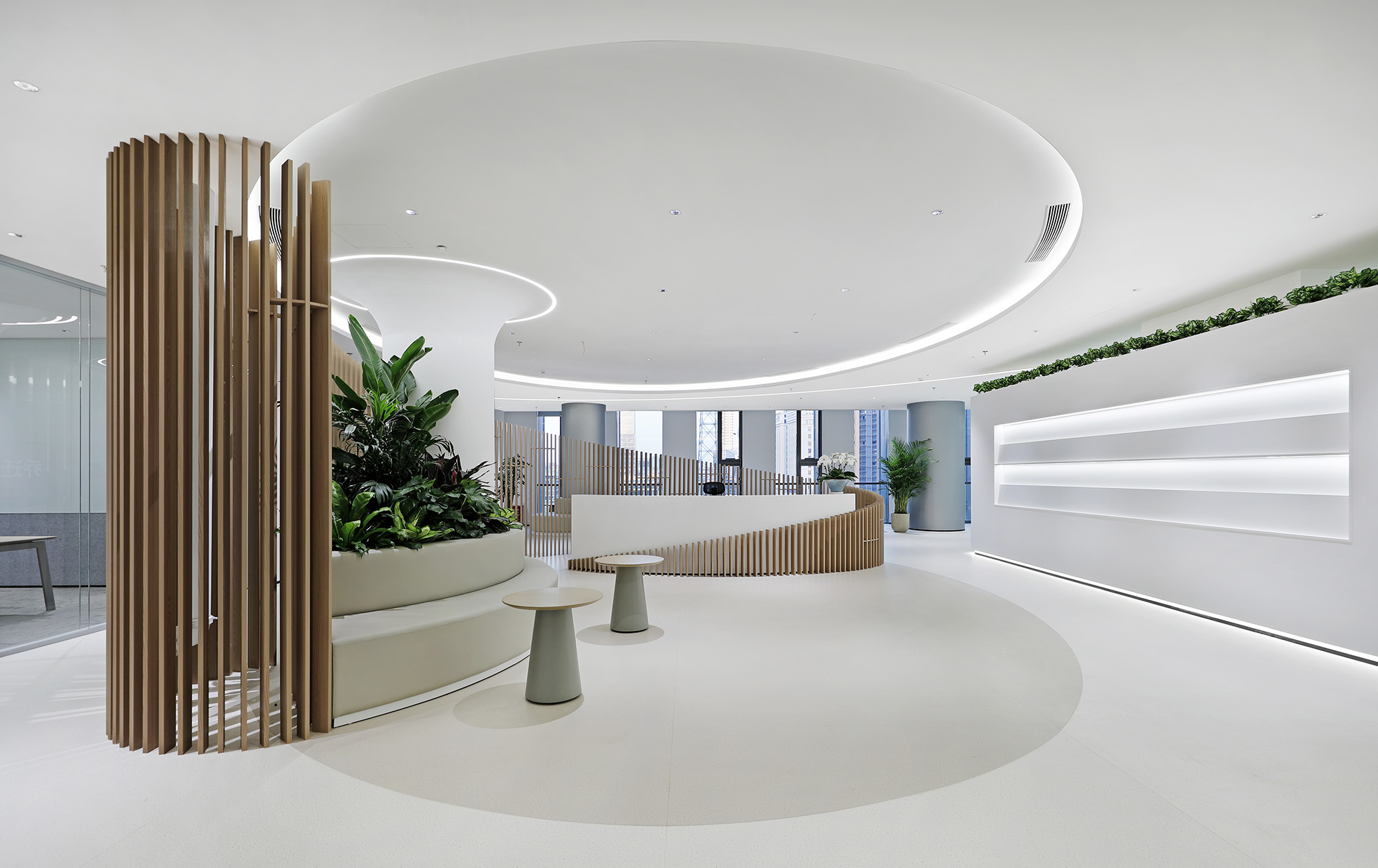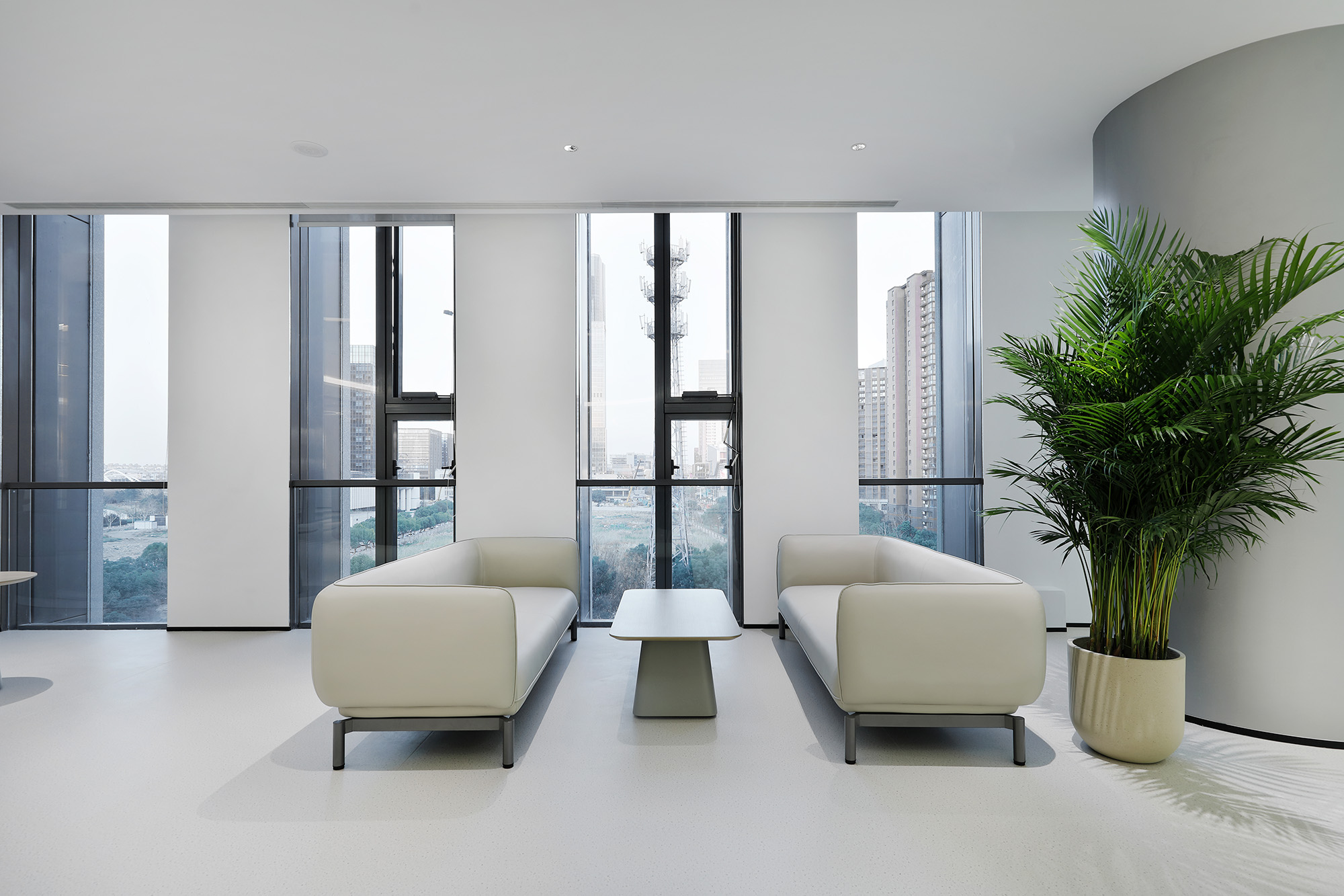 接待台的造型以流畅曲线勾勒视觉焦点,木纹格栅巧妙的隐藏了原有大楼的消防立柱的同时呼应主入口处设计语言,开阔的等候区域搭配舒适的座椅与简约绿植,让来访客户在严谨的科技氛围中感受到温暖与松弛,实现专业感与亲和力的完美平衡。