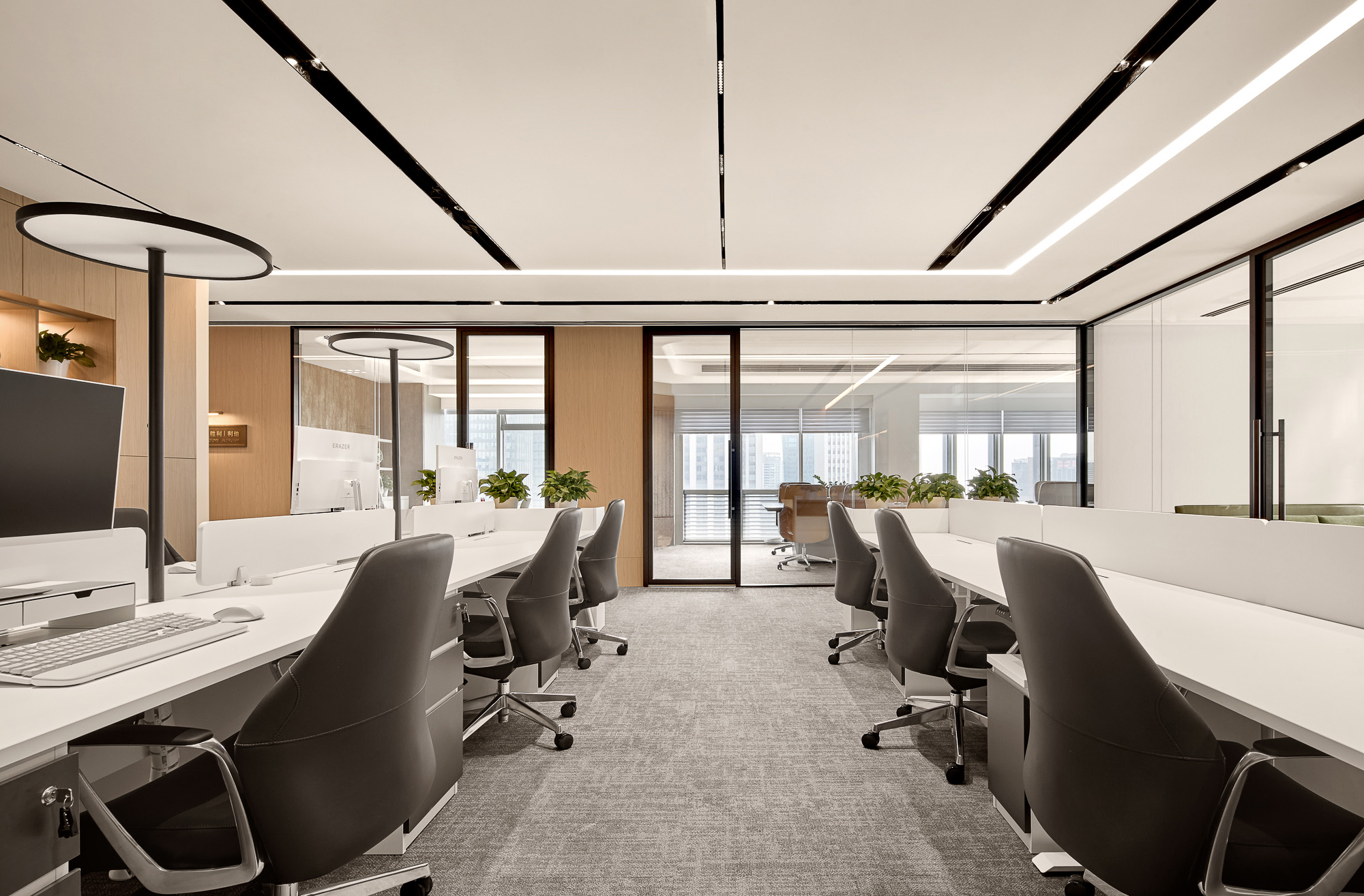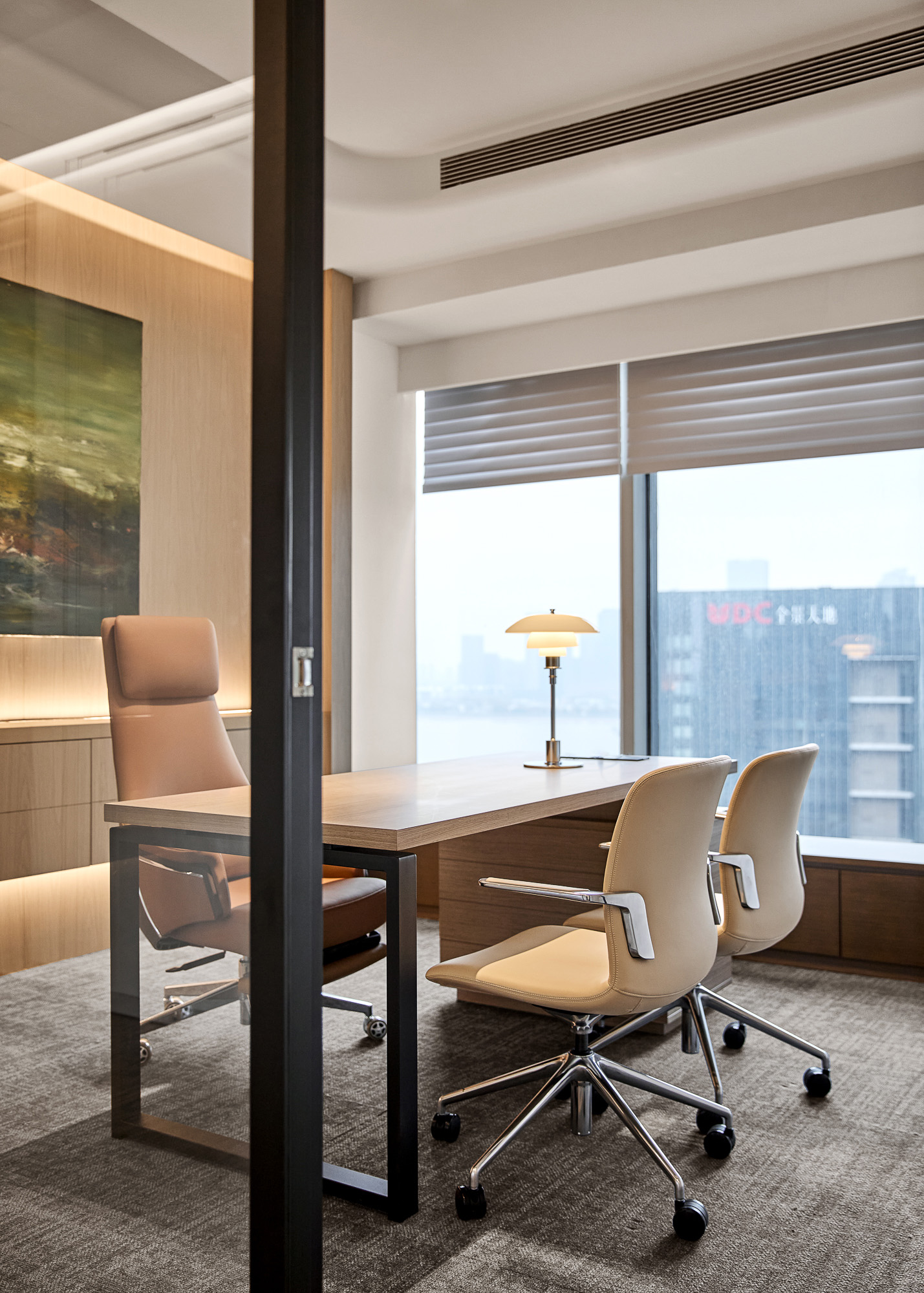 总裁室甄选实木家具,承载金融领域的深厚积淀;陈设瓷器藏品与编织地毯,勾勒隽永东方气韵。坚守“功能至上”设计内核,凭栏尽览杭州天际线,让都市繁华与室内古韵自然交融。于古今对话之间,尽显金融投资的沉稳远见与前瞻格局。
