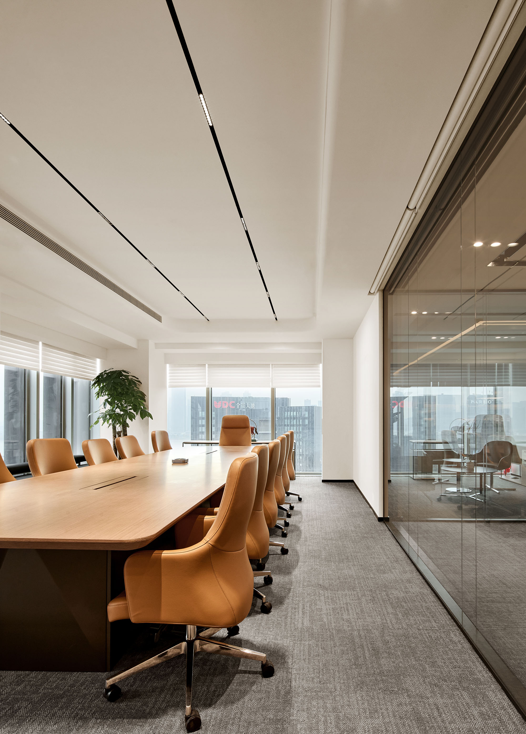 小会议室以紧凑布局营造深度交流氛围,面对面会议桌消解层级壁垒,呼应“利他为核心”的合作理念。光影透过百叶窗在桌面投下流动线条,自然光线伴同时刻思辨,让项目评审的激烈讨论、战略规划的沉静思考皆能催生洞见。暖色有机纹理装饰画,以大地色系强化沉稳严谨的空间气质,完美诠释“艺术与技术结合”的设计内核。
