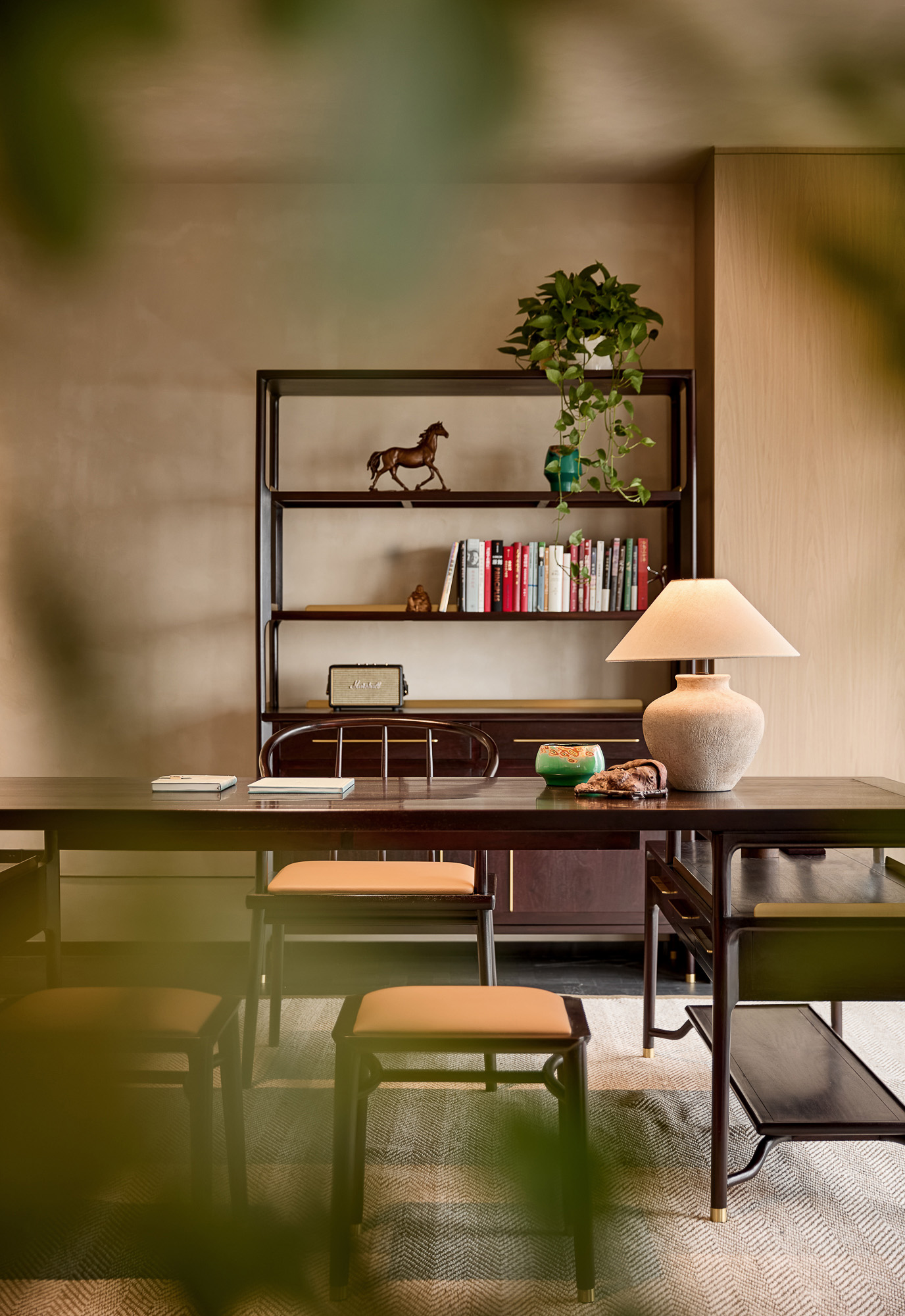空间以自然色调为基底,摒弃传统奢华的浮华堆砌,深度践行包豪斯极简美学,融合工业革命技术成果,甄选金属、皮革等现代材质,借由不同质感的碰撞交融,凝练出低调而富有张力的奢华气韵。柔和照明层层铺陈,与材质肌理相映成趣,构建出充满生命力的创意场域;吊顶黑色线条的利落延展,更赋予空间灵动的秩序感。
