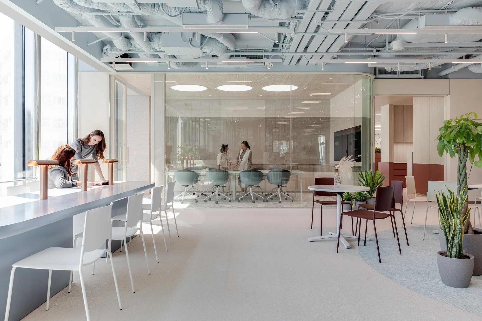 材料与色调的精心搭配旨在营造明亮且充满活力的氛围。该金融机构的标志性红色被重新诠释,并与多样元素上的丰富色彩谱系相辅相成,共同打造出一个突破传统企业思维、激发创新的环境。可持续理念贯穿设计始终,采用升级改造的家具和生物基墙面饰面等特色,在减少环境影响的同时提升了空间健康与舒适度。