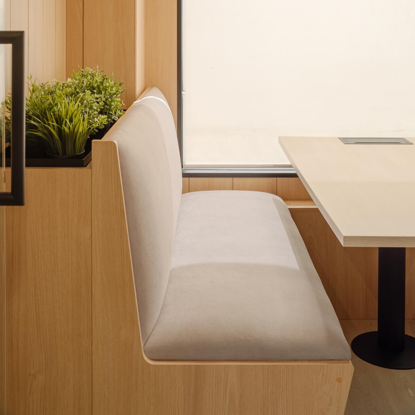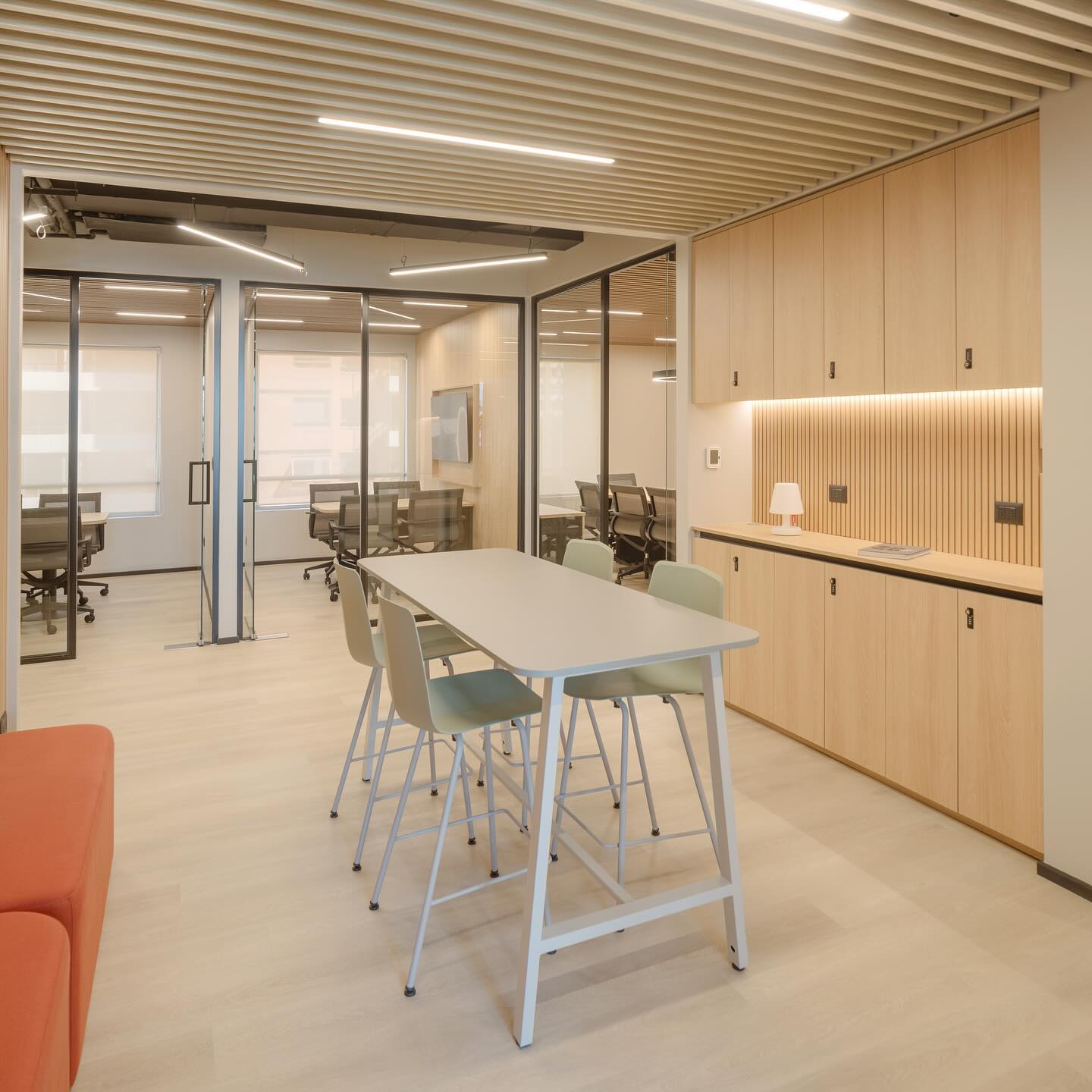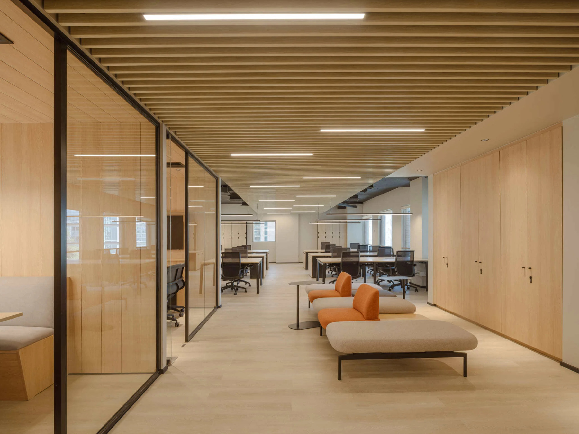 此次设计委托的另一核心述求是提升办公室的声学舒适度。为此,整个空间铺设了连续统一的乙烯基地板。同时,会议室采用绒面声学挡板吊顶,在降低层高的同时有效控制声场混响。