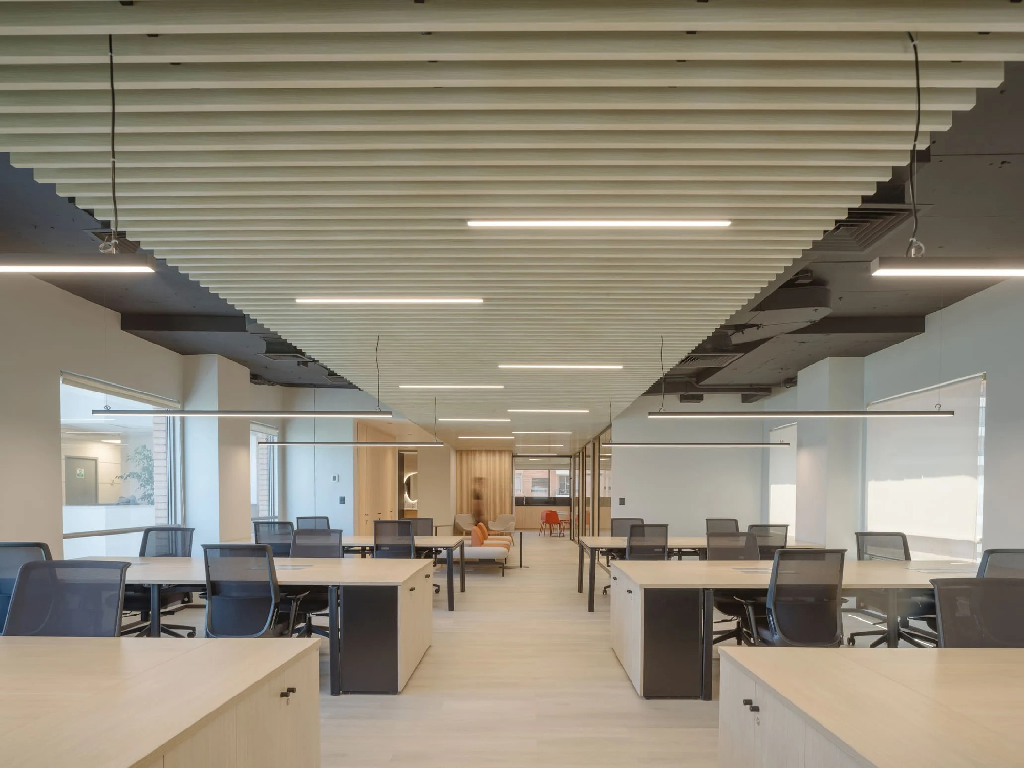 整体照明采用线性灯具以强化顶面的韵律感,而会议室则通过环形灯具与线性光影形成有趣的视觉对比。
