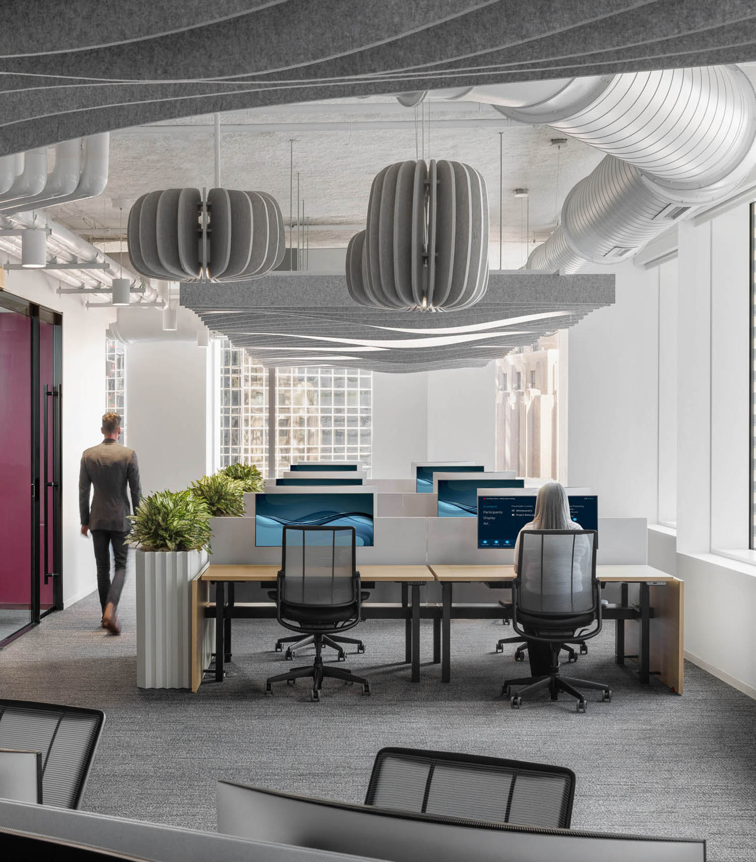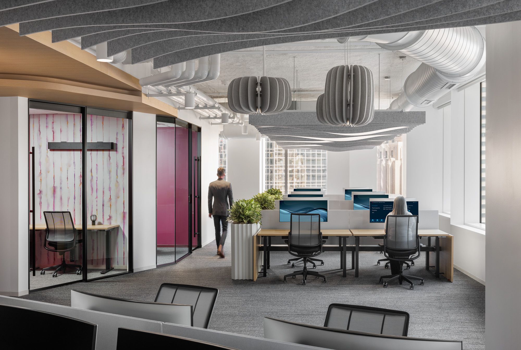 海洋蓝、大地棕与暖调夕霞绛红构成不同工作社区的标志性色彩体系;声学天花板构件在超大面积的楼层中亦可有效辅助空间导引。科技感十足的客户中心则运用深邃暗色调饰面,并结合混凝土与烟熏玻璃隔墙,营造出精致商务的质感。项目中广泛采用的无障碍设计解决方案,后续更成为客户制定其全球通用设计标准的范本。该项目荣膺LEED v4商业室内铂金级认证及二星级Fitwel健康建筑认证。