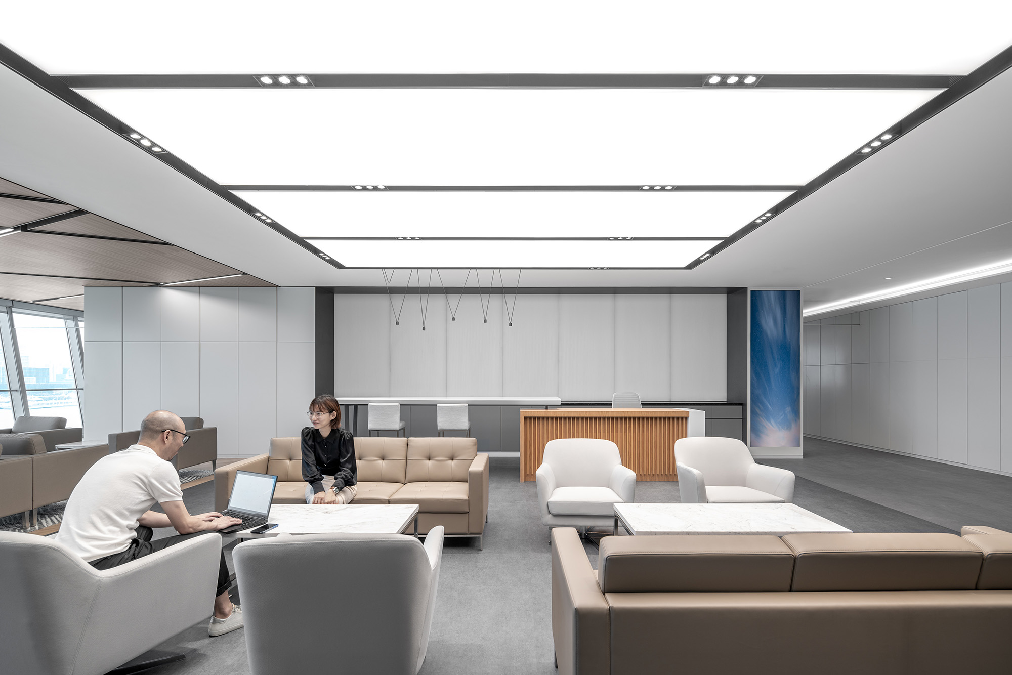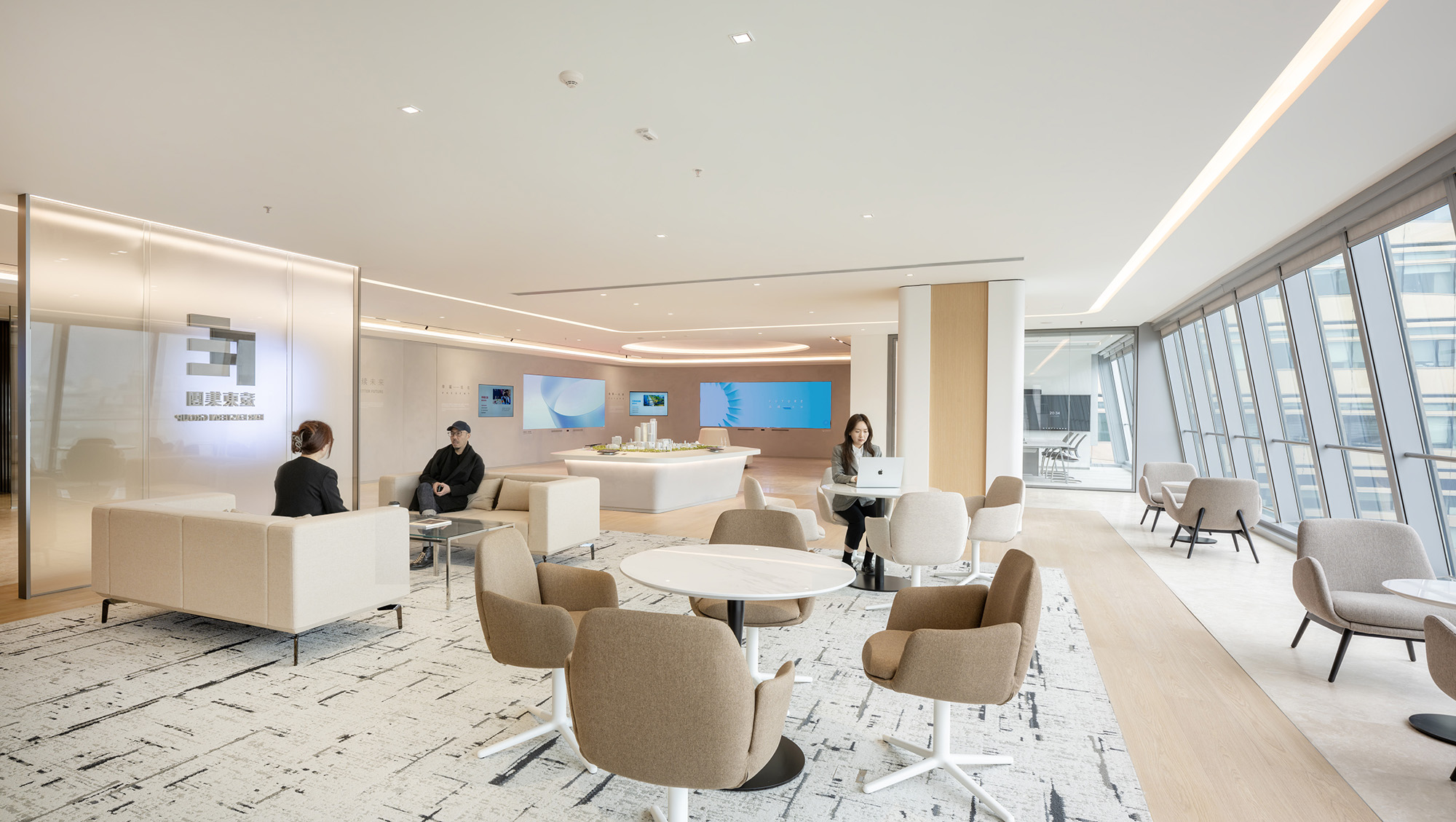位于核心楼层的社交枢纽,是连接与活力的心脏。模块化沙发、休闲椅与可灵活组合的茶几,既能满足日常休憩与小规模洽谈,亦可快速转换为大型聚会场地。自然光透过玻璃幕墙洒入,与线性灯带交织出通透温暖的氛围。中性色调的家具与几何纹样地毯,在“远东集团”品牌标识的映衬下,于开放氛围中沉淀出低调而可信的品牌气质。