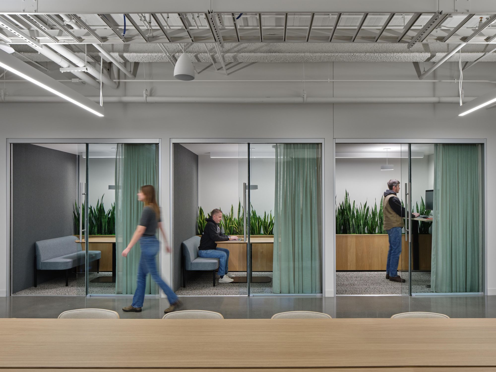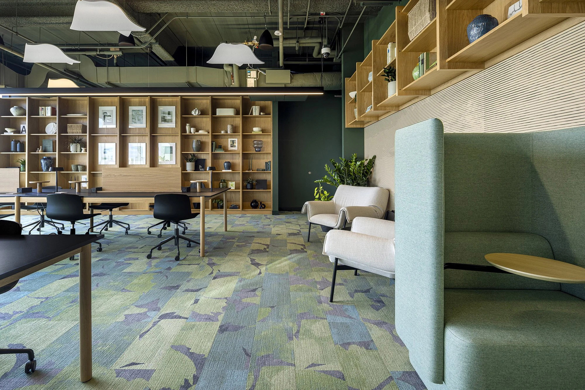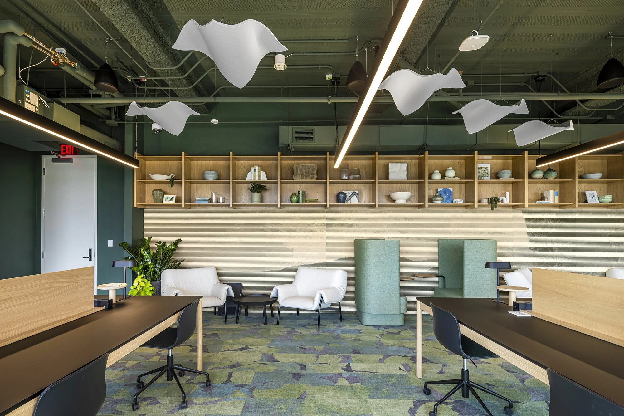 声学设计与木作工艺进一步延续了亲自然的叙事脉络。会议室墙面采用再生PET毛毡板有效降低噪音,而大型协作空间则配备了雕塑感的声学吊顶,其悬浮元素宛若飞鸟凌空。水磨石饰面的工作台、采用本地原料定制的木制品与花槽,以及通过绿色认证的软包卡座面料,共同彰显了空间对可持续理念的坚定承诺。