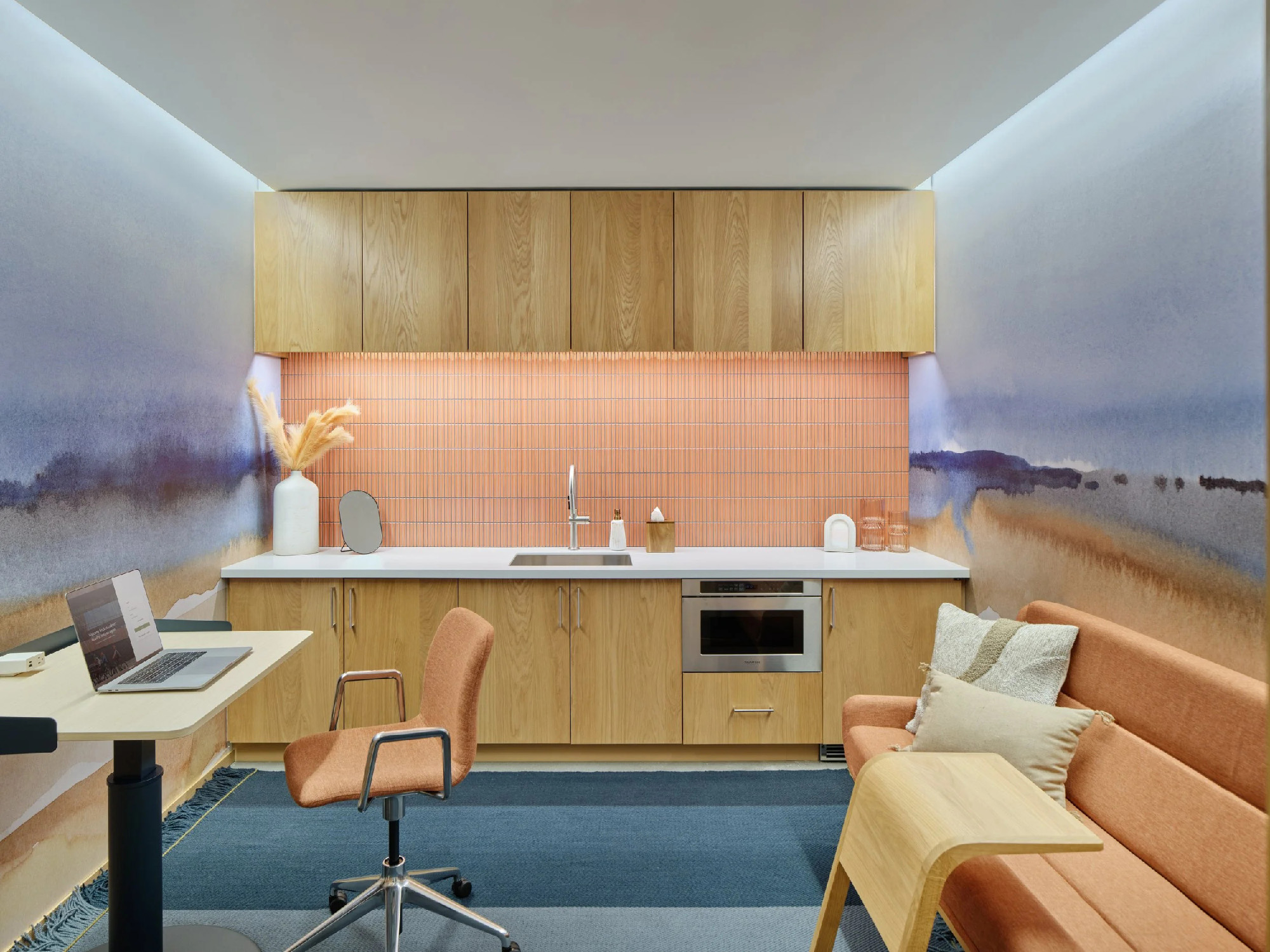 采用数字印刷技术呈现的大幅墙面装饰,以仿手绘景观的艺术效果,为无自然光照的区域引入户外意趣。赤陶色调的手工烧制瓷砖,则呼应着阿肯色州特有的红岩地貌特征。