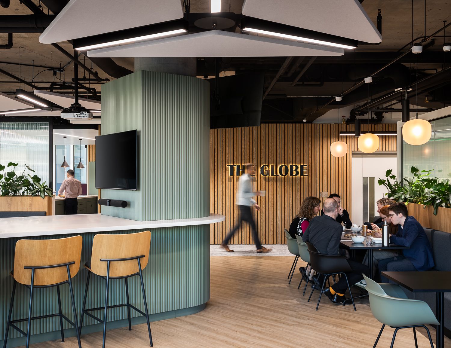 项目的核心亮点之一是引人注目的多功能厅区域,它既可作为休闲交流区,也能承办大型活动。该空间采用定制细木工艺、精心设计的声学吊顶以及特色照明系统,为整个办公空间奠定了基调。此外,各类会议室与专注工作区的组合设计充分满足了团队的多样化需求,让交易员既能便捷获取所需资源进行协作,也能专注开展独立工作。