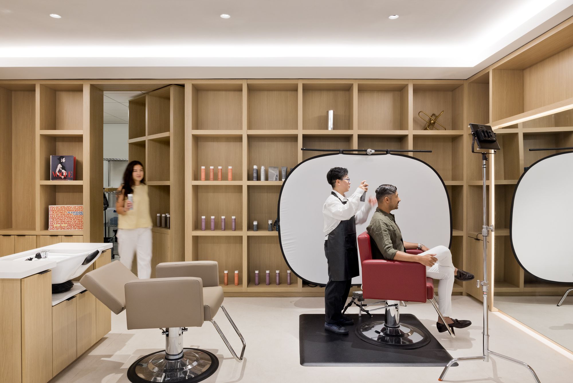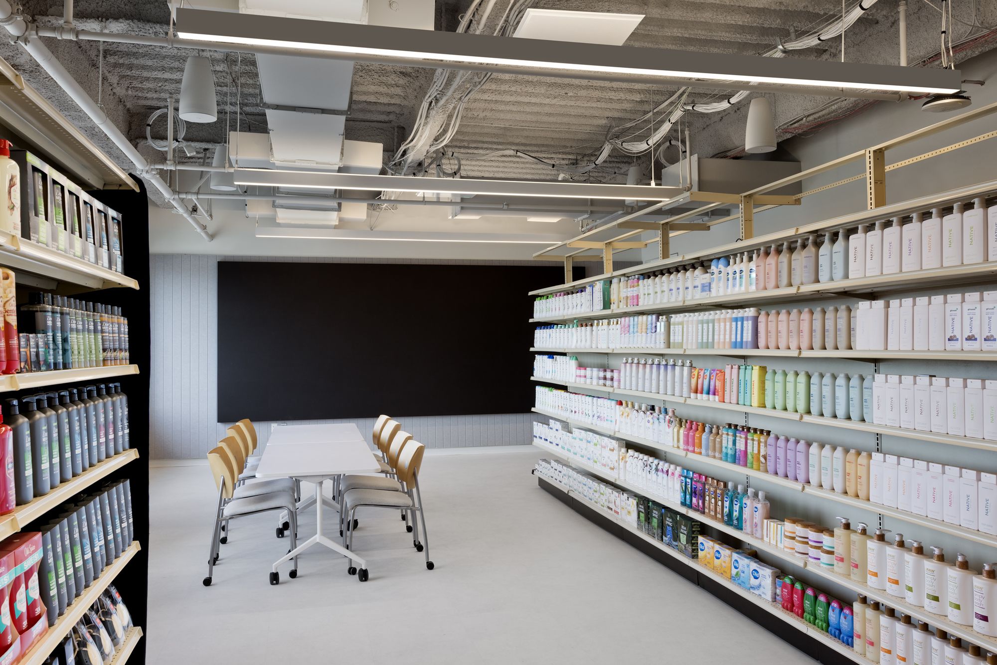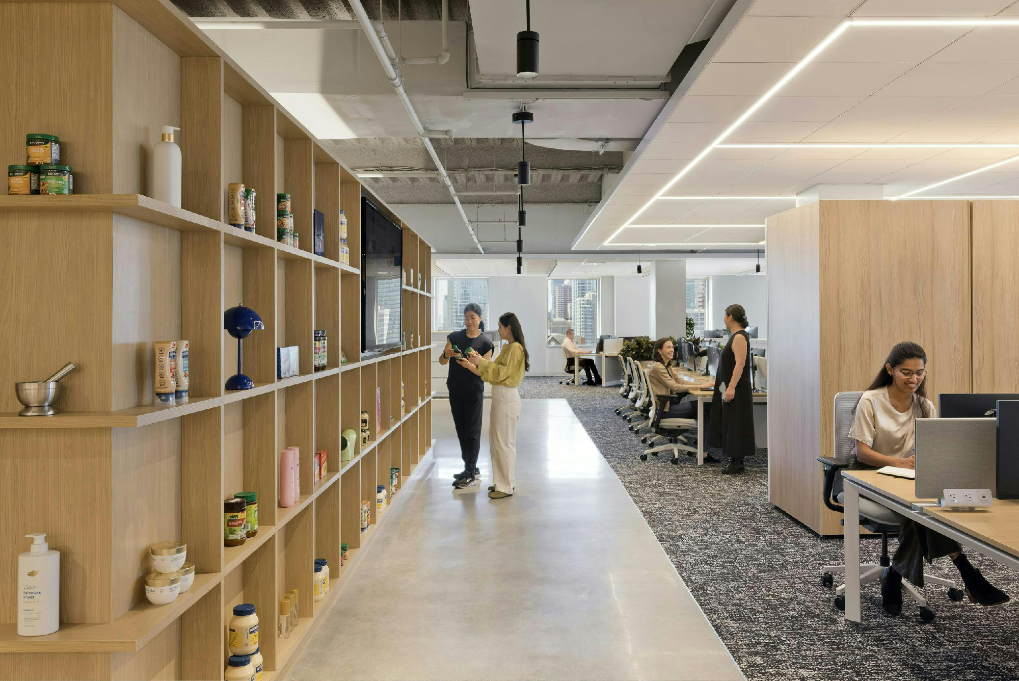 该空间专为产品开发流程而打造,配备了专业级厨房、美发沙龙和零售实验室,将联合利华的众多品牌生动地呈现在眼前。模块化隔断、可移动家具和开阔视野构成的灵活基础设施,使团队能够根据需要调整环境,以支持实时的创意构思、原型制作以及营销活动的测试。这种对产品如何向顾客展示和传达的细致关注,深刻体现了联合利华以创新、品牌体验和消费者连接为核心的原则。