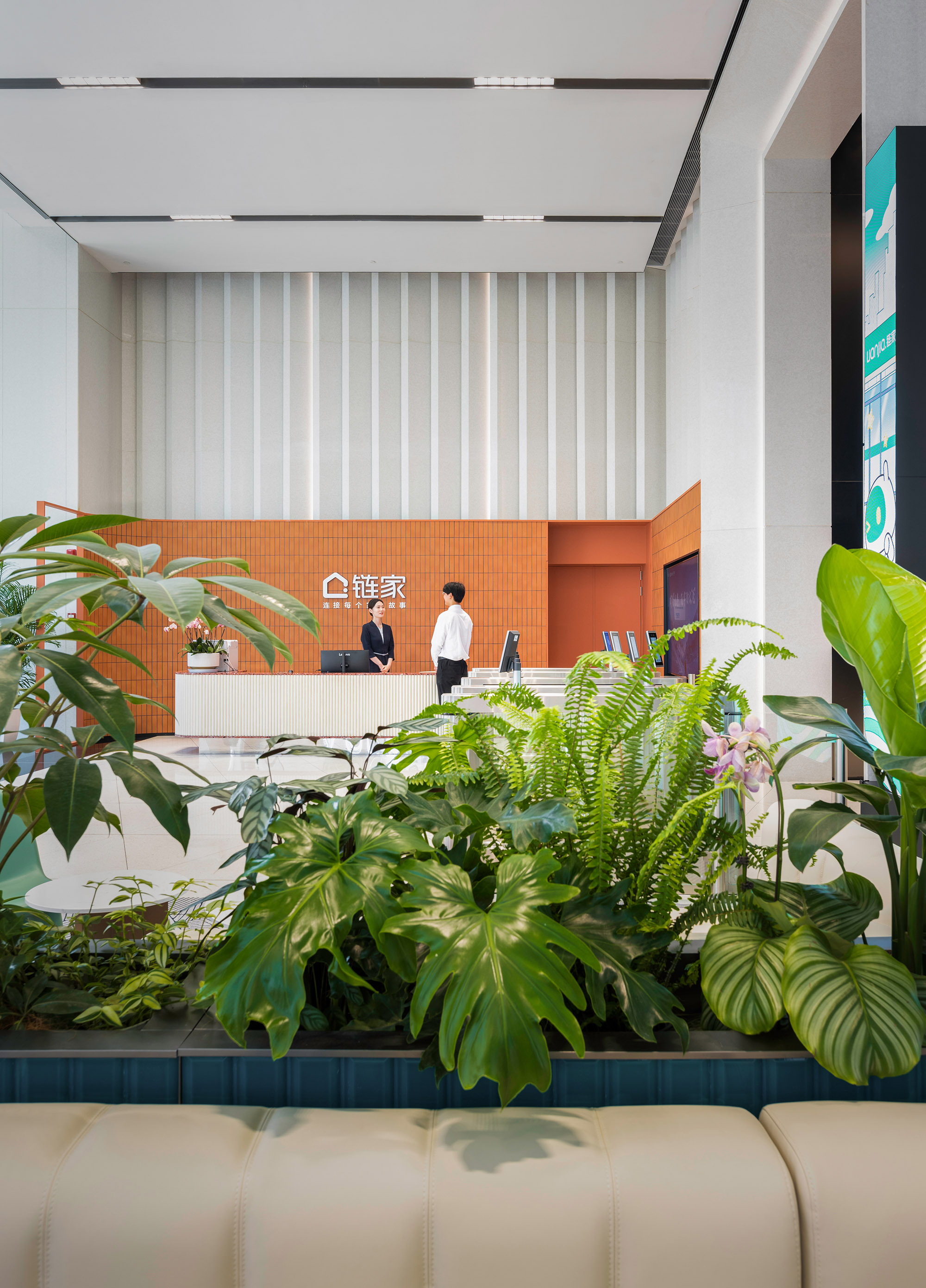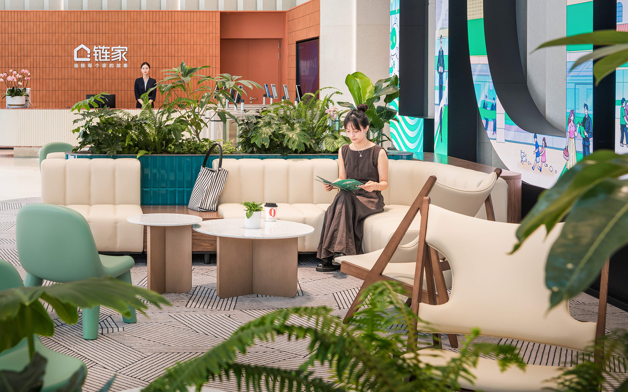 接待区不仅是物理空间的呈现,更是链家品牌价值观的具象化:简单、真诚、开放。