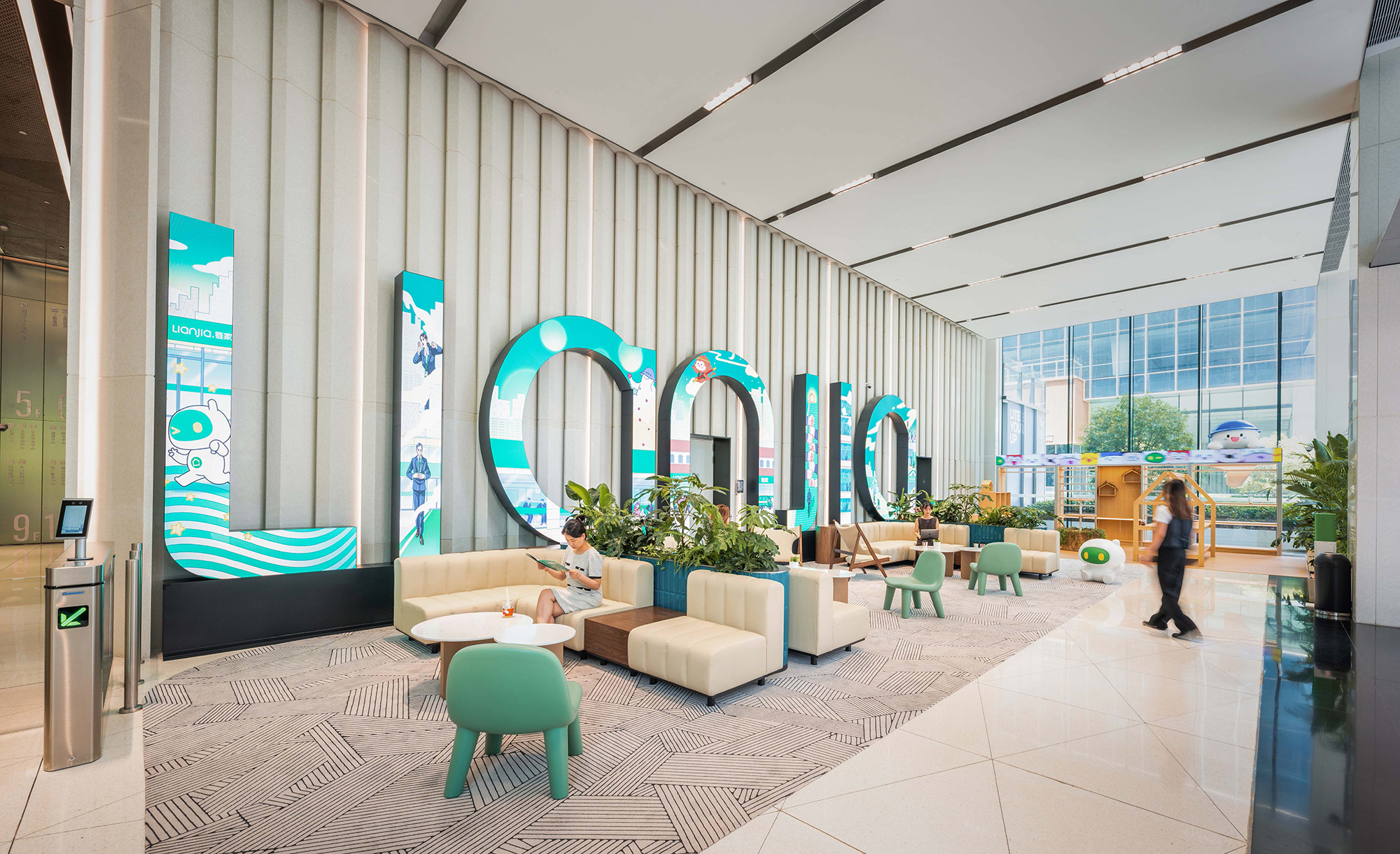 在这里,绿意盎然的沙发区为访客和员工提供了舒适的交流场所,而一面昭示性的品牌LED屏幕则在增加空间趣味性的同时,展示链家的科技与专业实力。