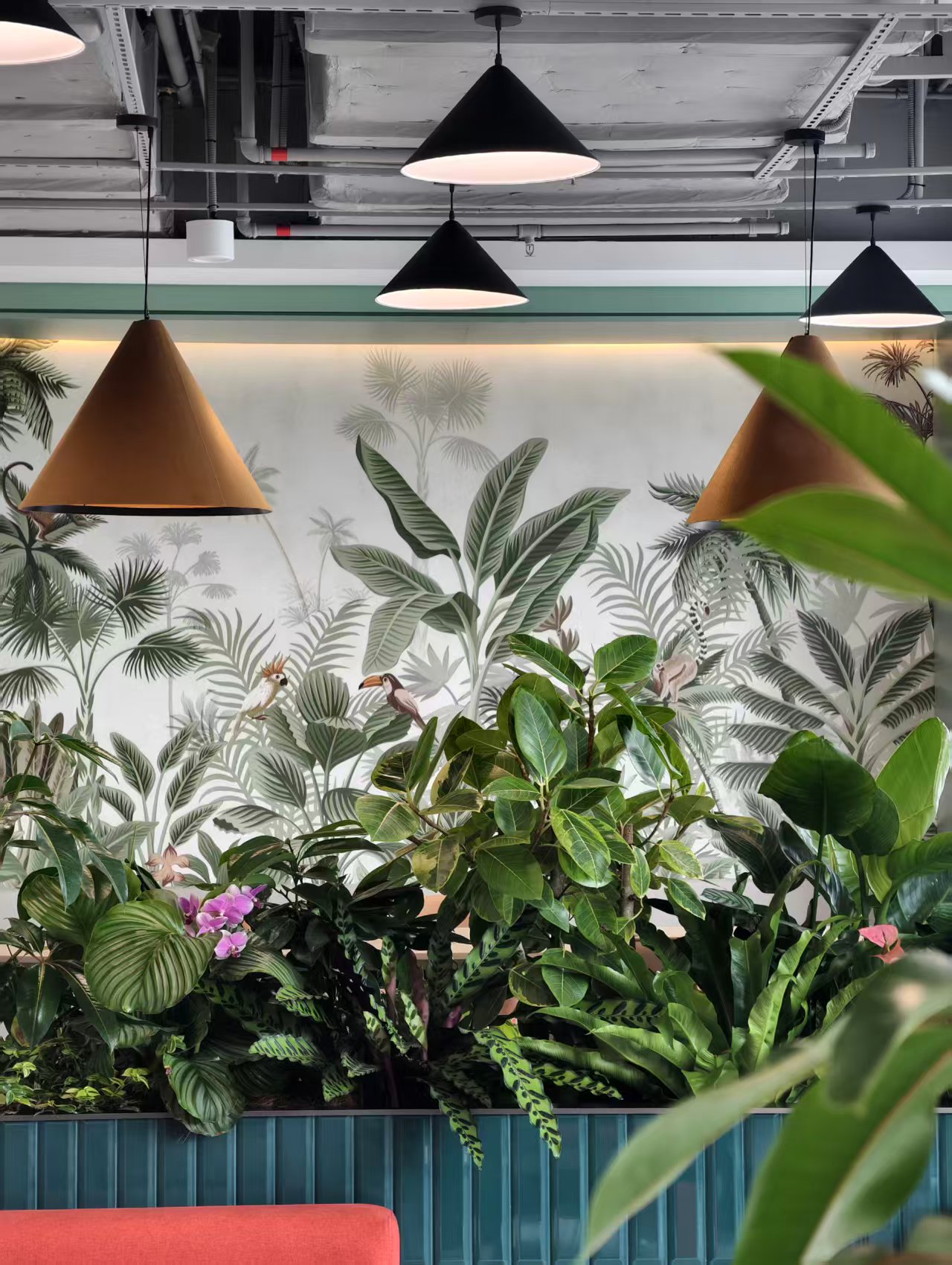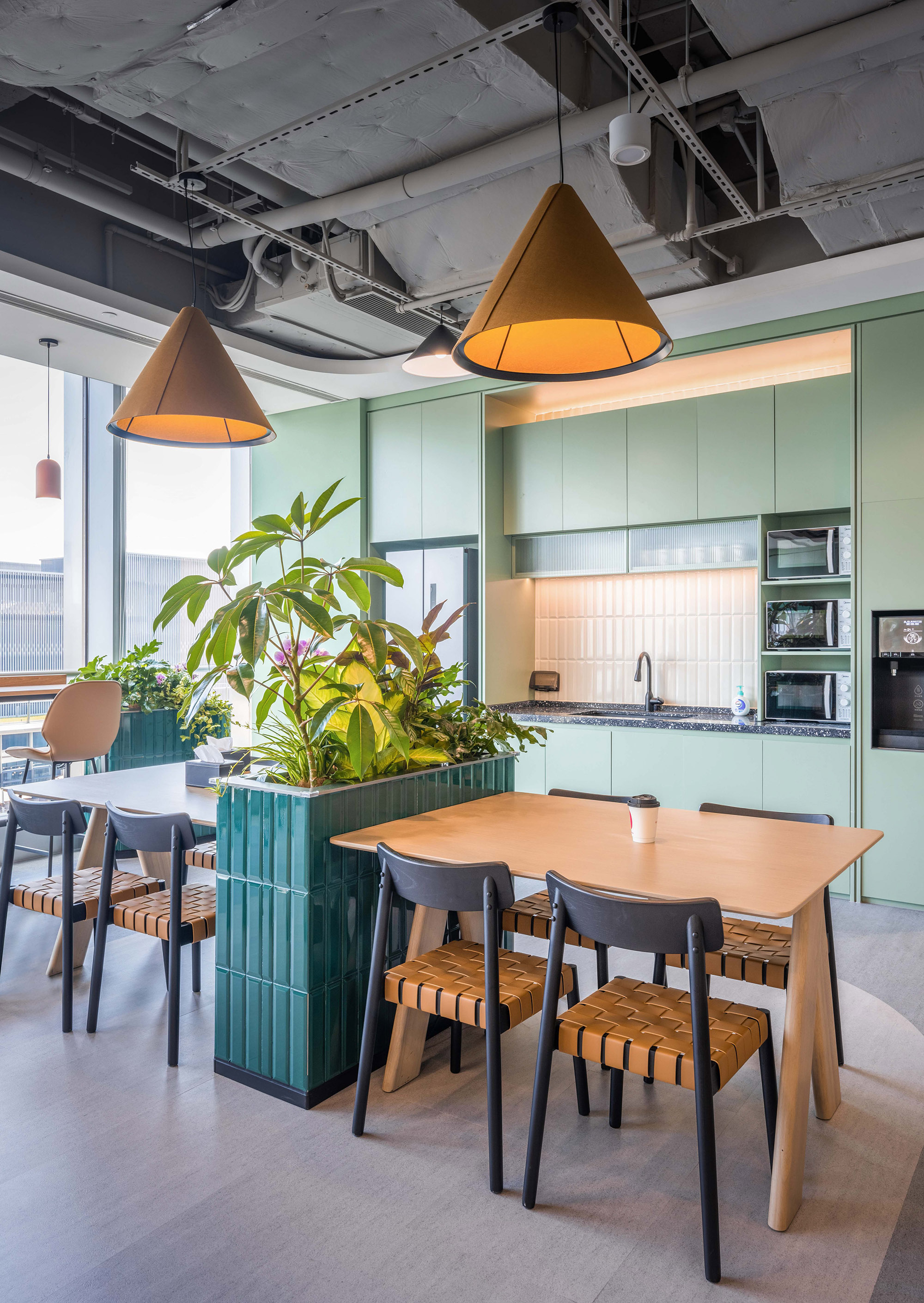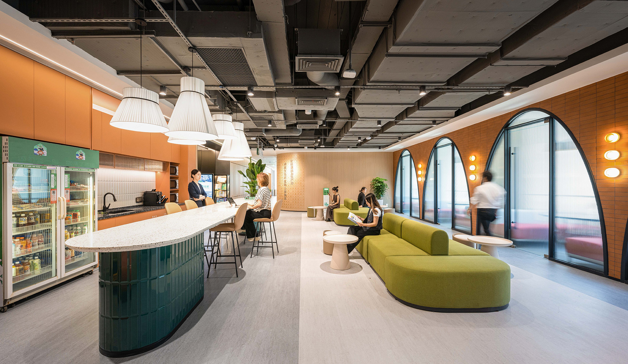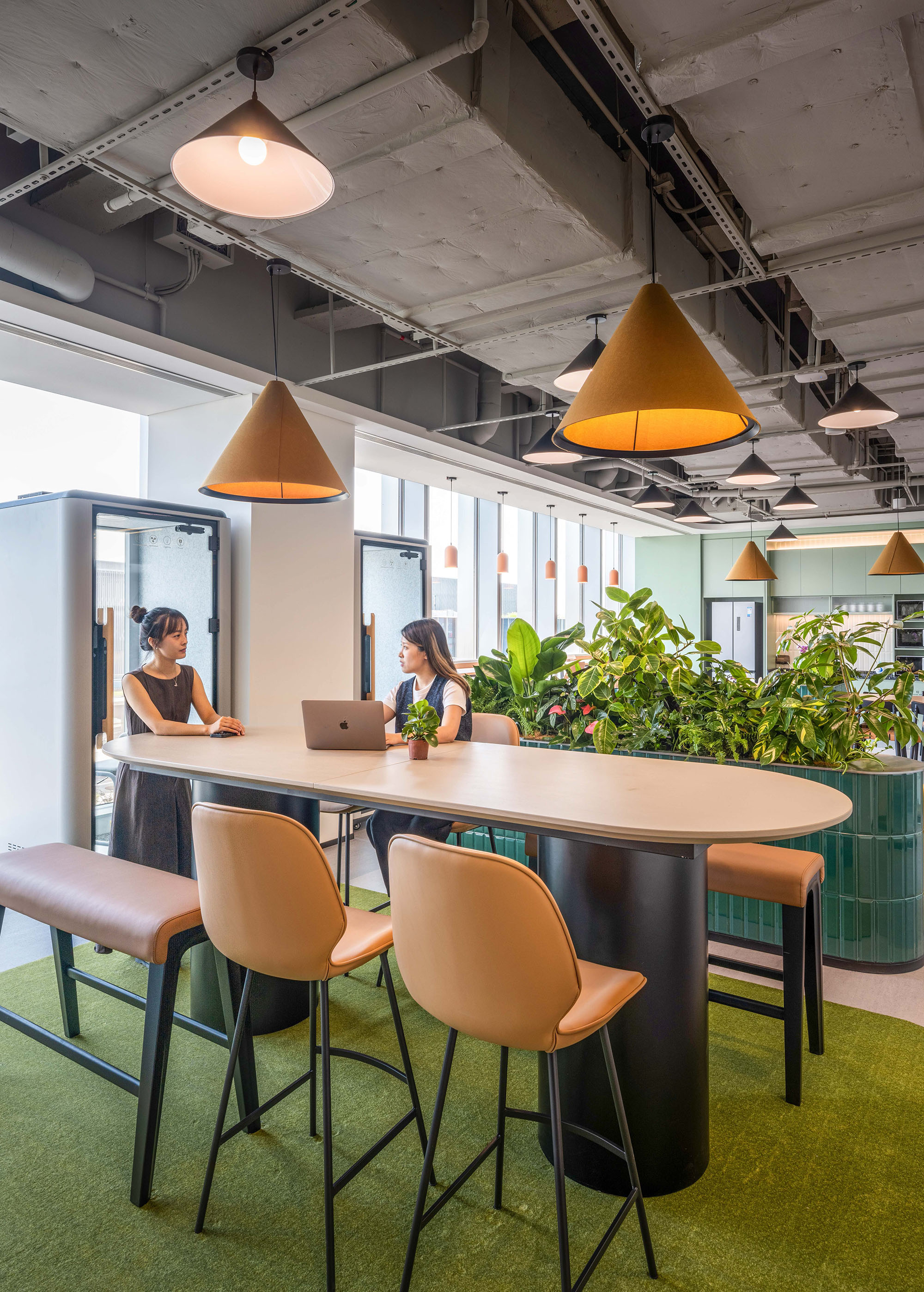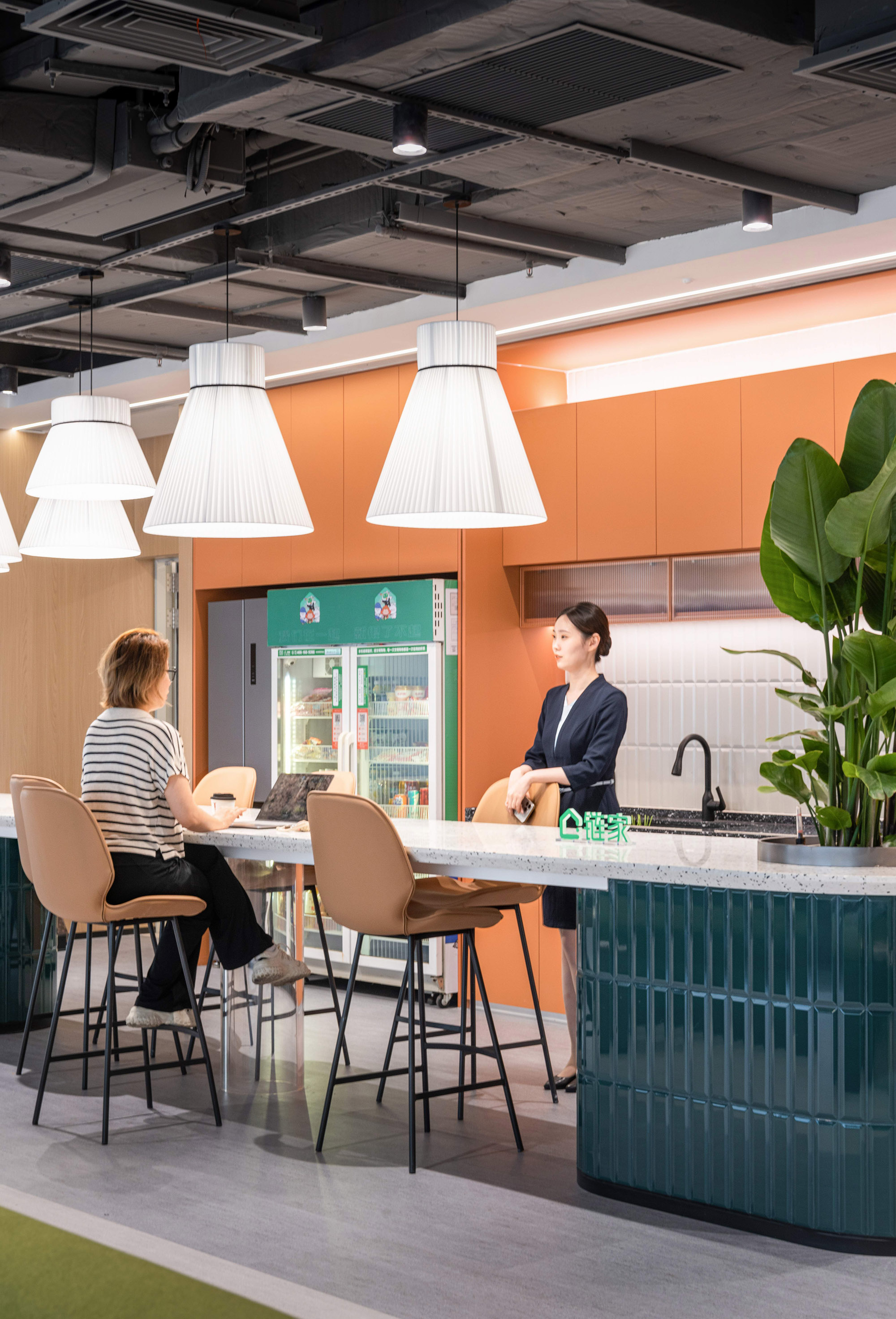 · 楼层客厅与协作区则为员工提供了多样化的场所:窗边、角落、绿植环绕的休闲区,甚至远程混合办公的灵活组合。