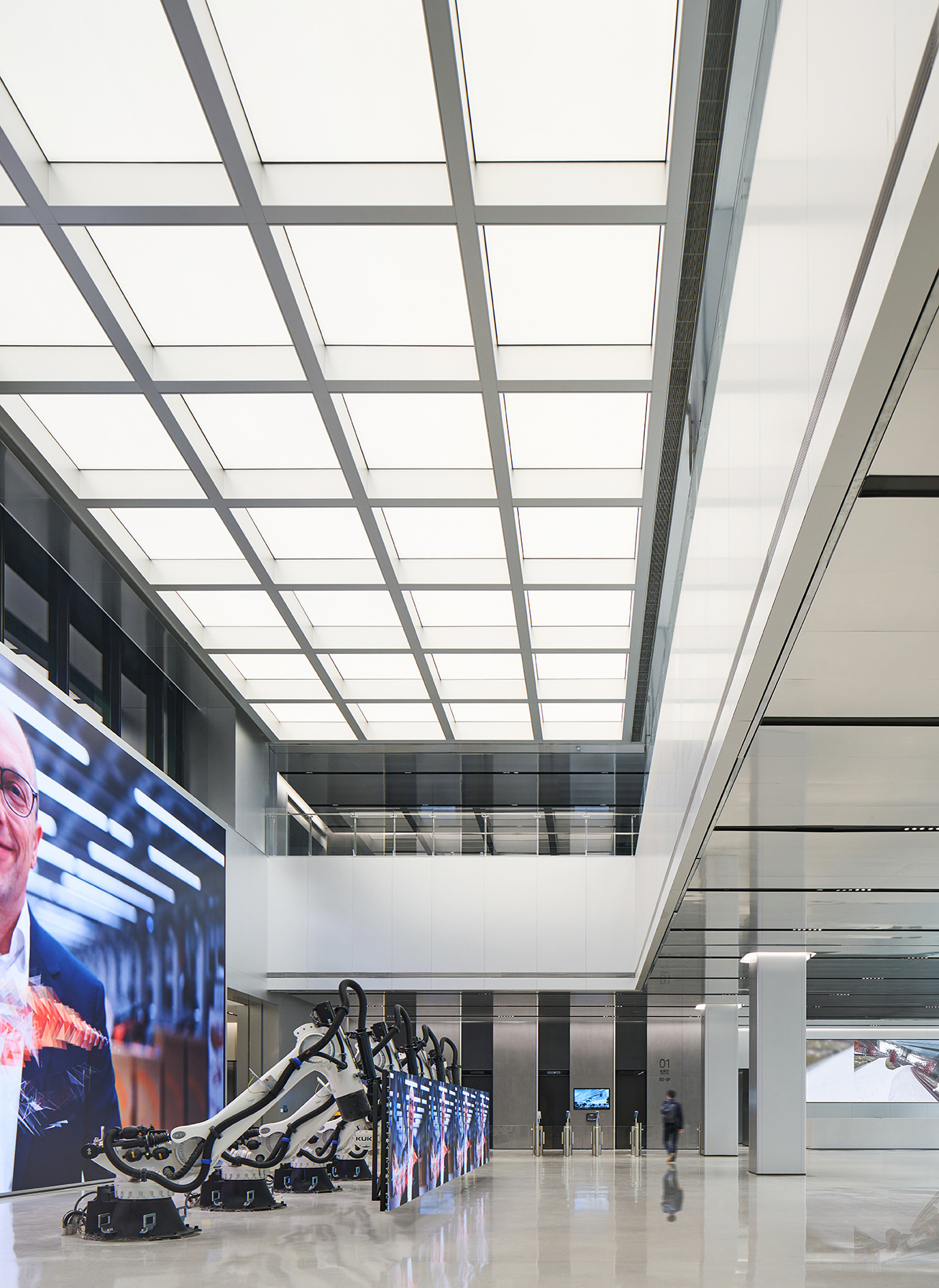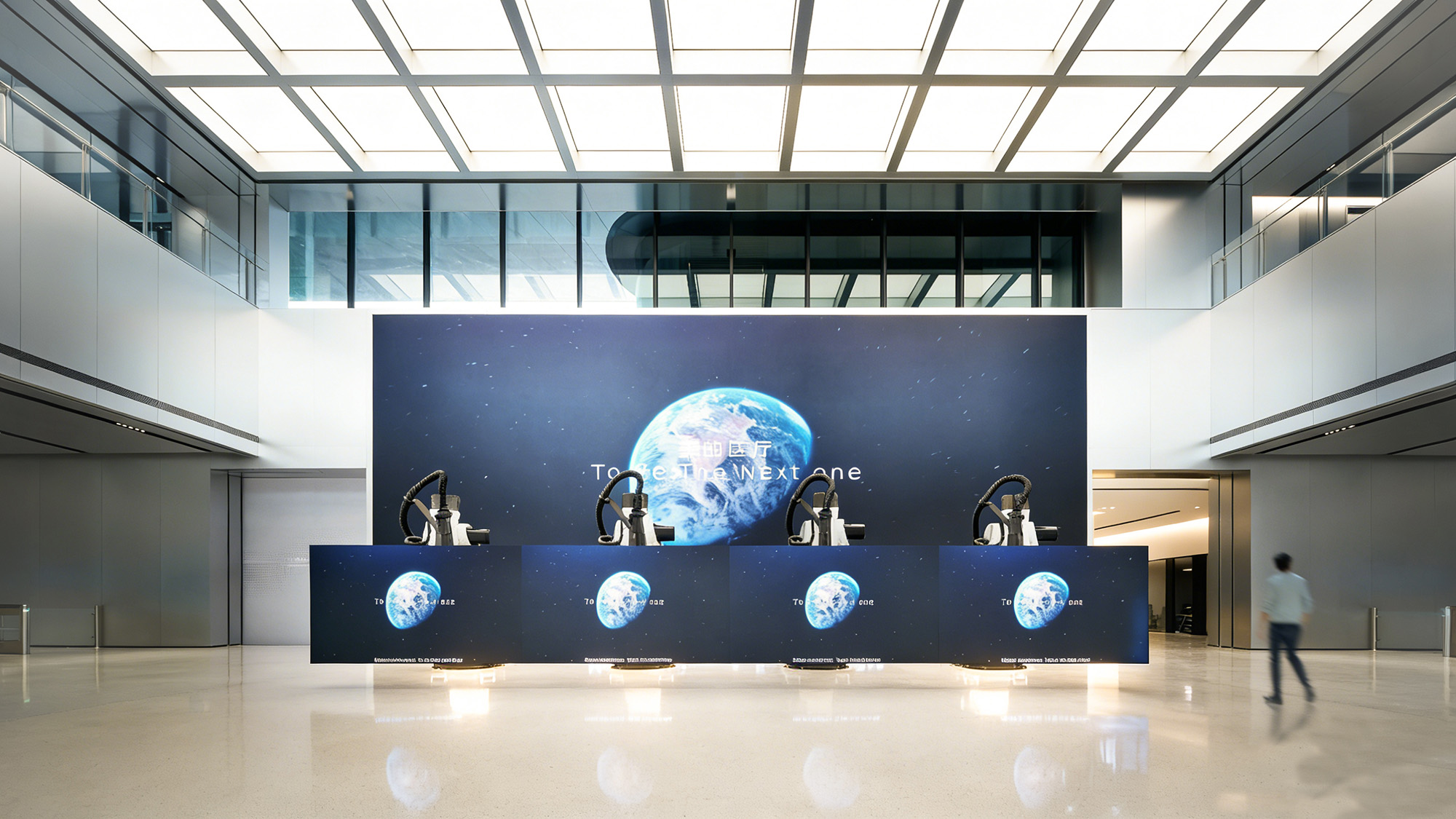 以大堂区域为例,高大的空间搭配简洁的线条,结合巧妙的灯光设计及超大屏幕,打造出极具视觉冲击力的科技感空间。