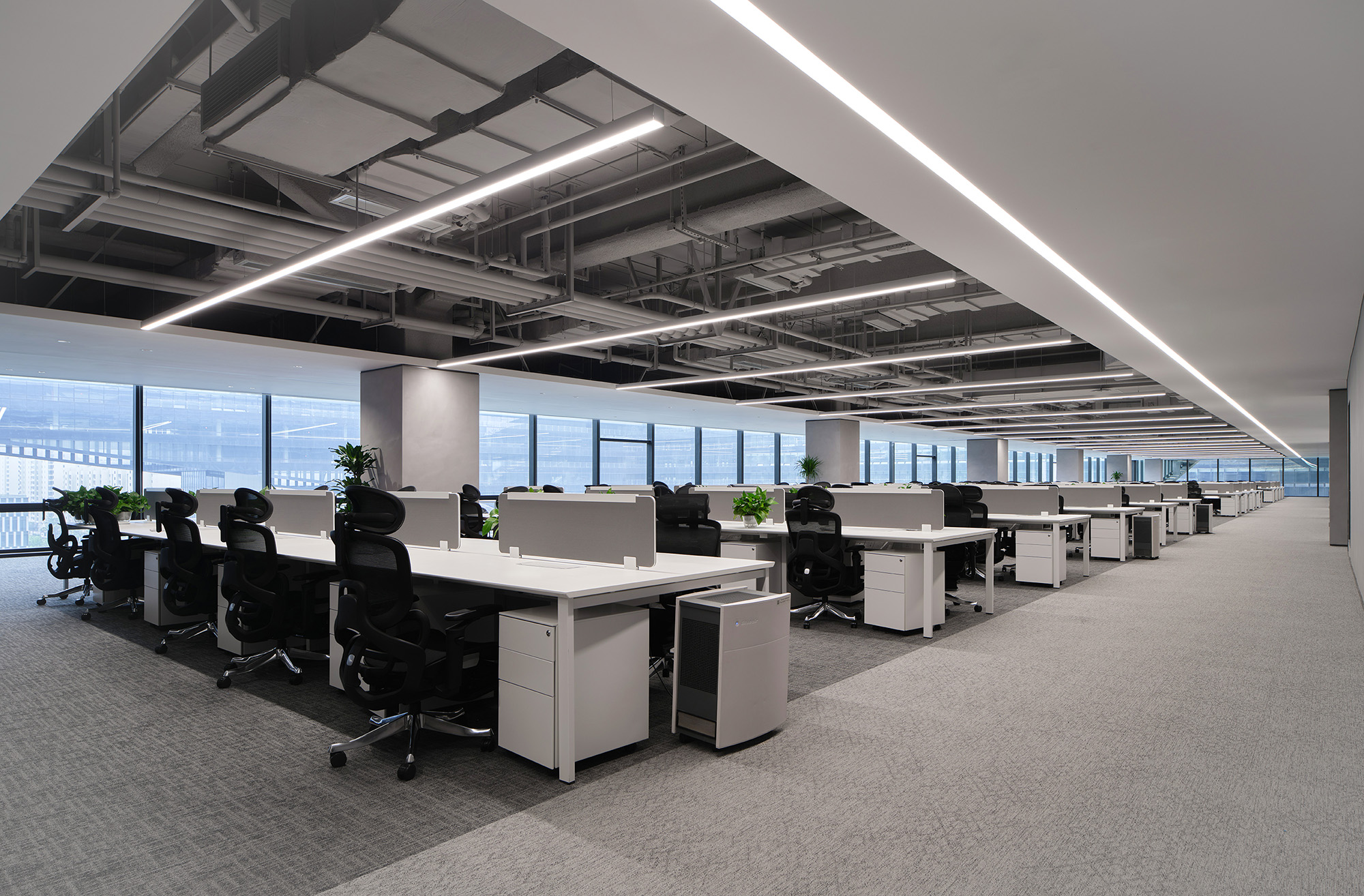 大开间办公模式保证了企业在发展过程中,能够根据部门变化灵活调整空间布局,同时也增强了部门之间的联通便利性,促进了信息的流通与团队协作。